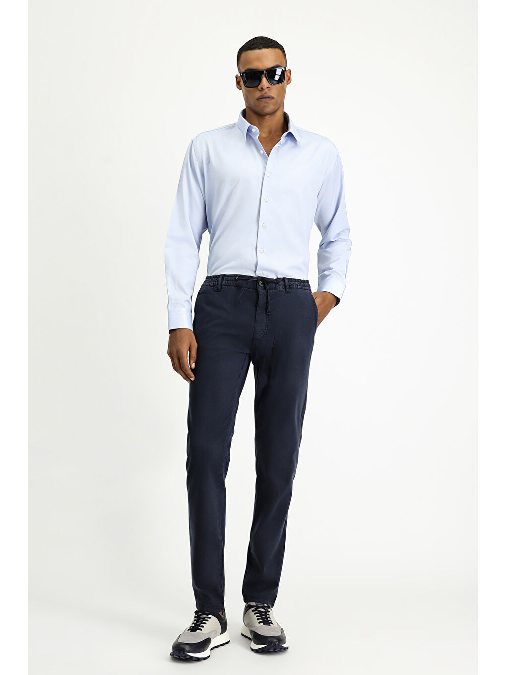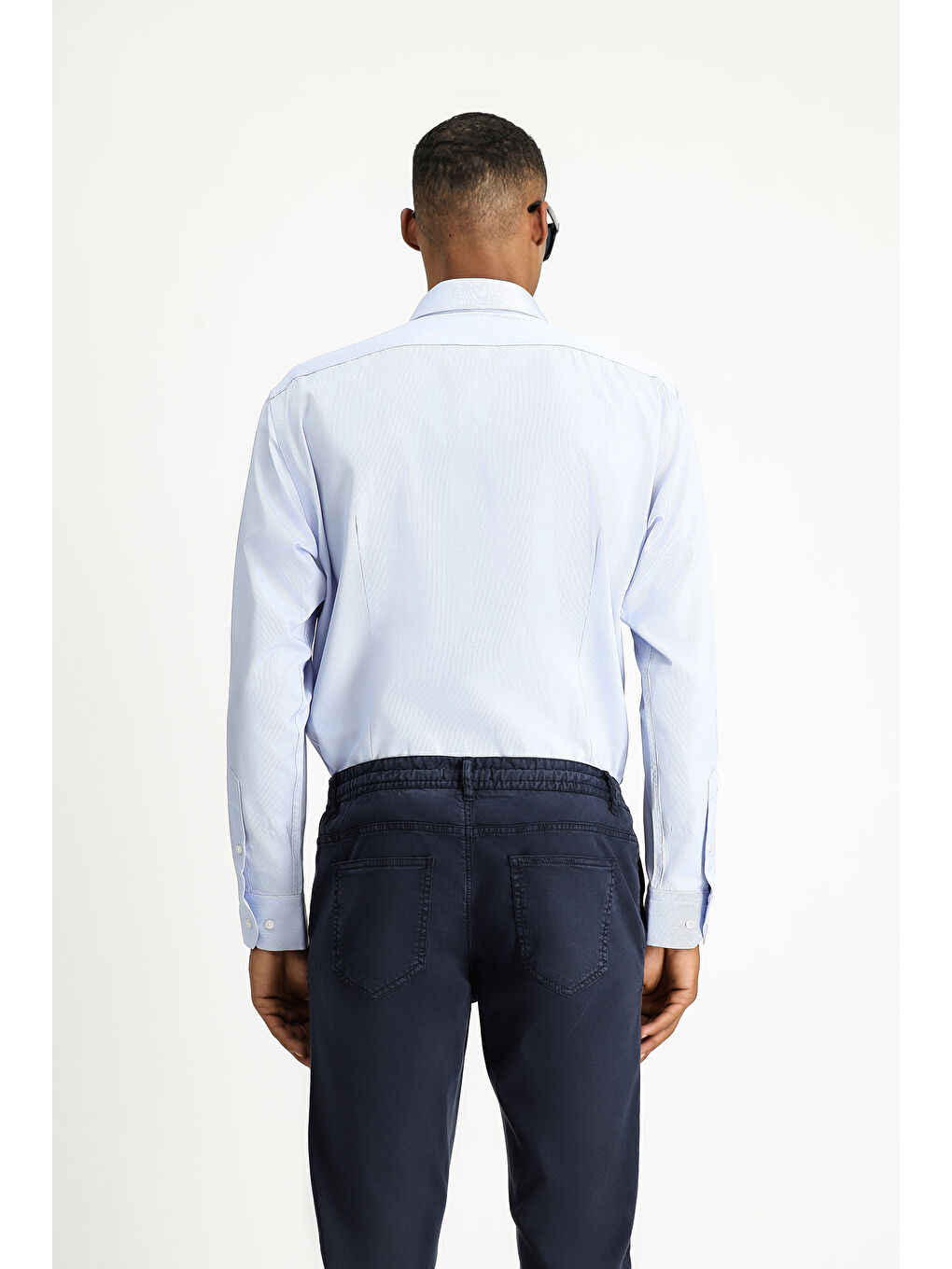 پیراهن نخی طرحدار کلاسیک آستین بلند آبی، اسلیم فیت، اسلیم کات، اتوی آسان