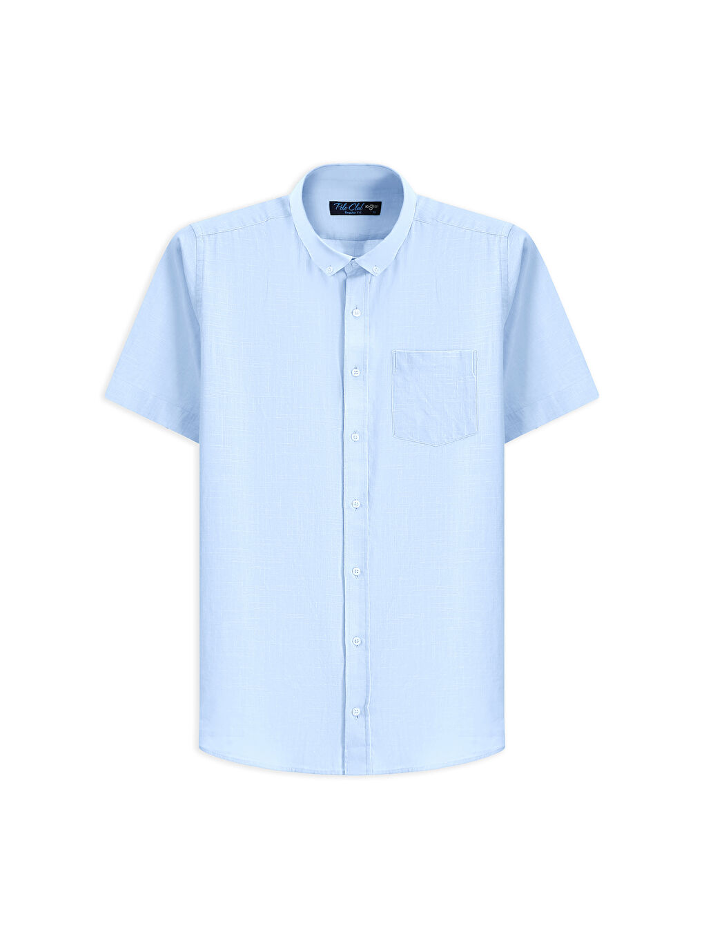 پیراهن ورزشی نخی آستین کوتاه آبی، یقه دکمهدار، طرح کتان