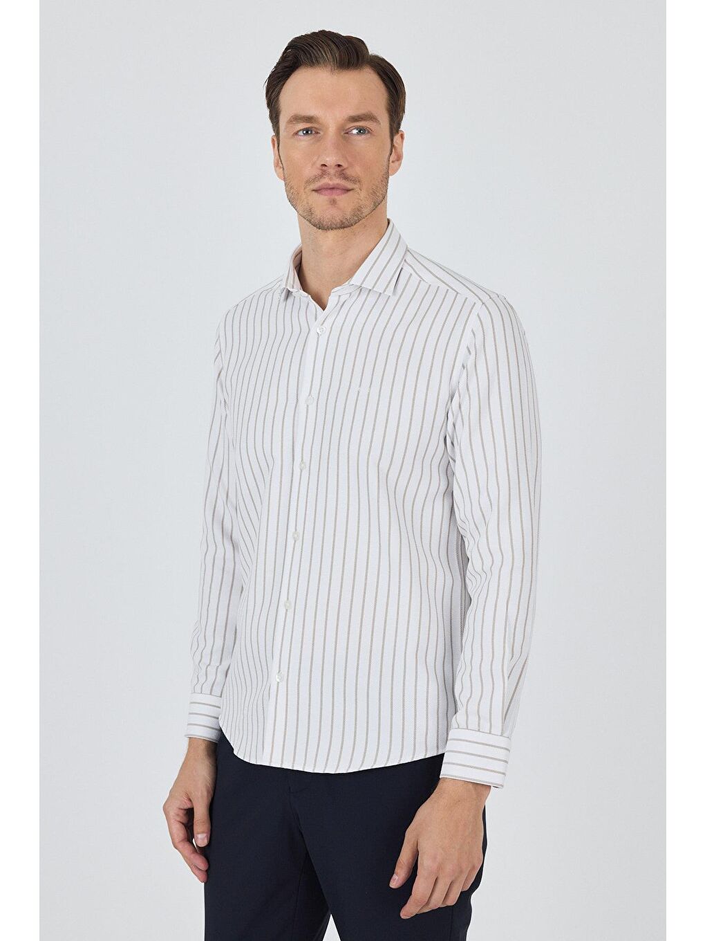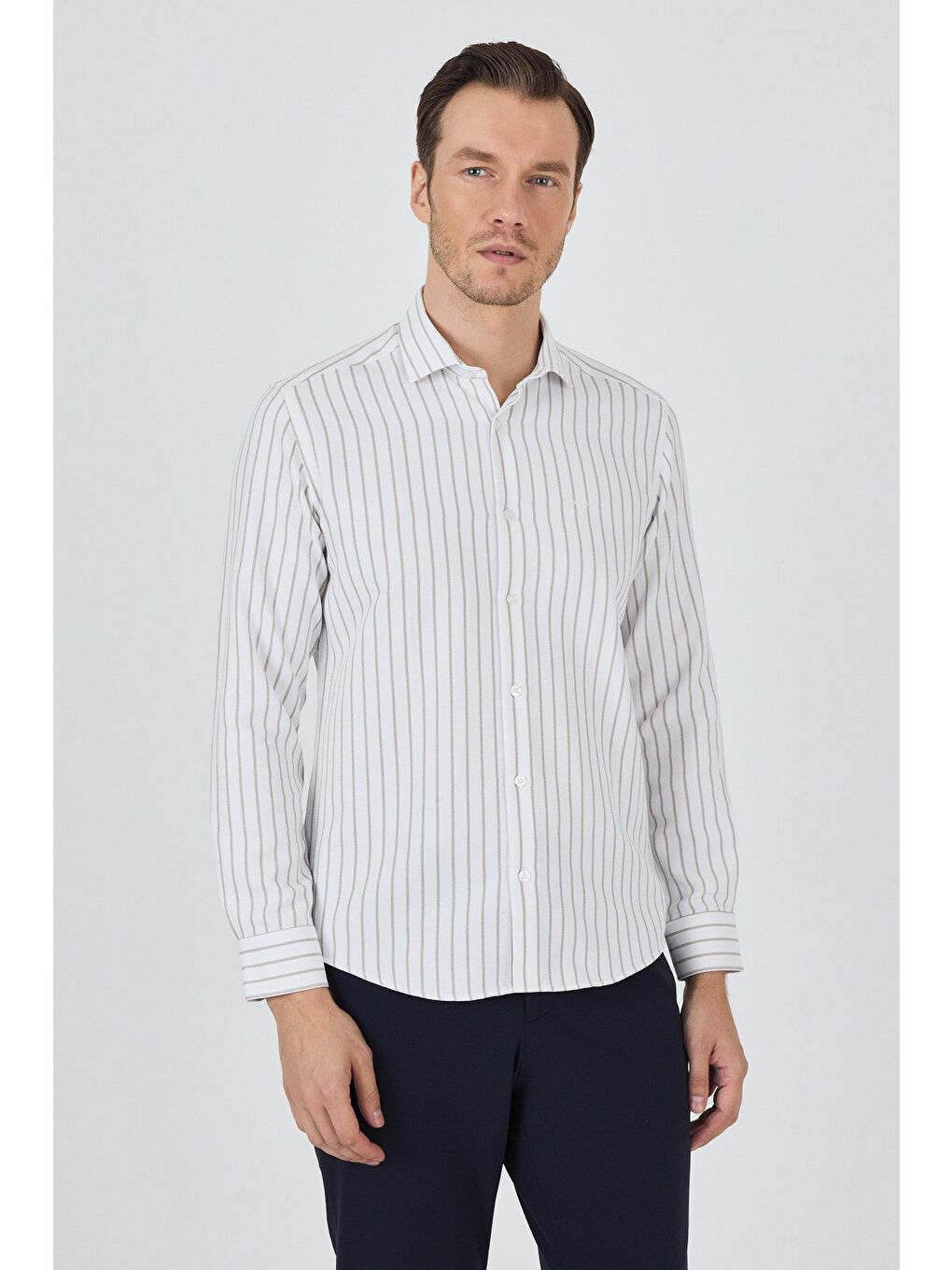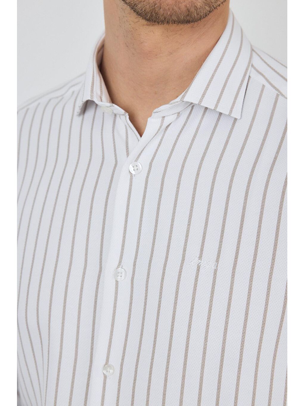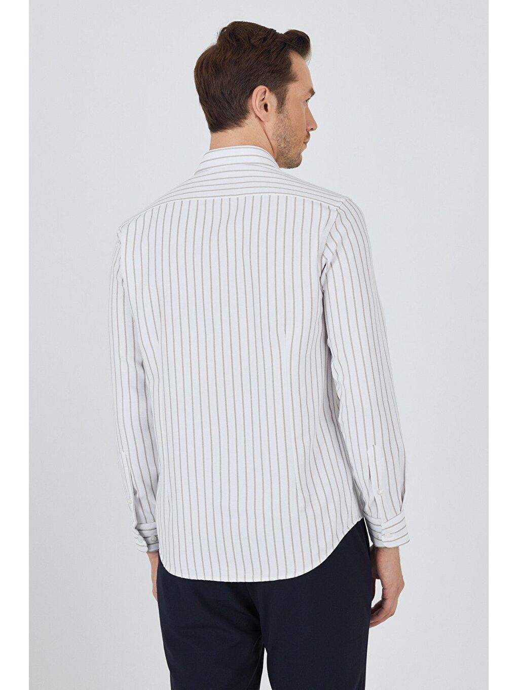 پیراهن راه راه طرح یقه ایتالیایی بژ روشن 1004250216