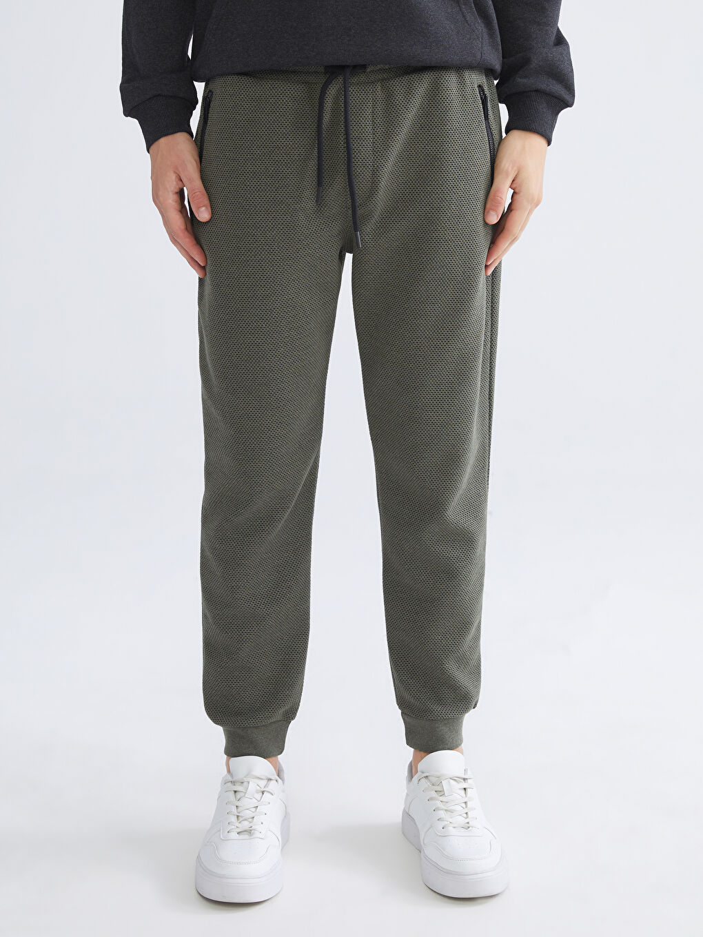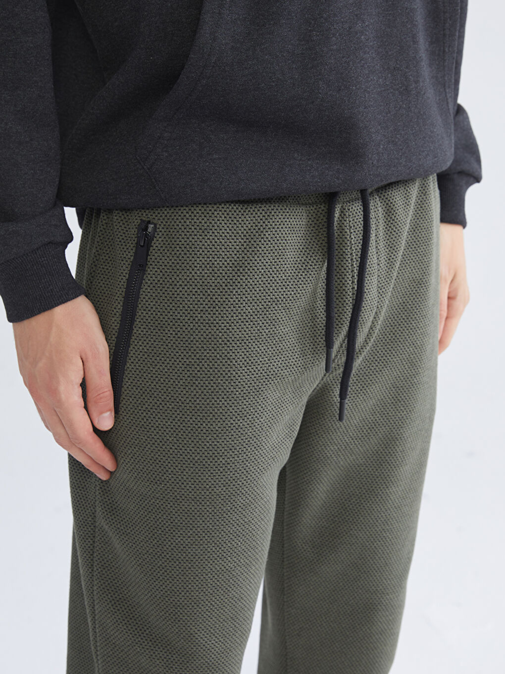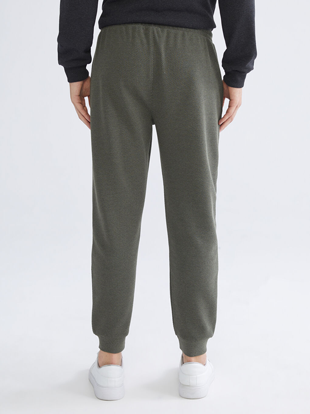 شلوار ورزشی مردانه با کمر کشی و جیب‌های کناری از پارچه اینترلاک با ضخامت متوسط ​​ساخته شده و دارای لبه‌های چین‌دار است.