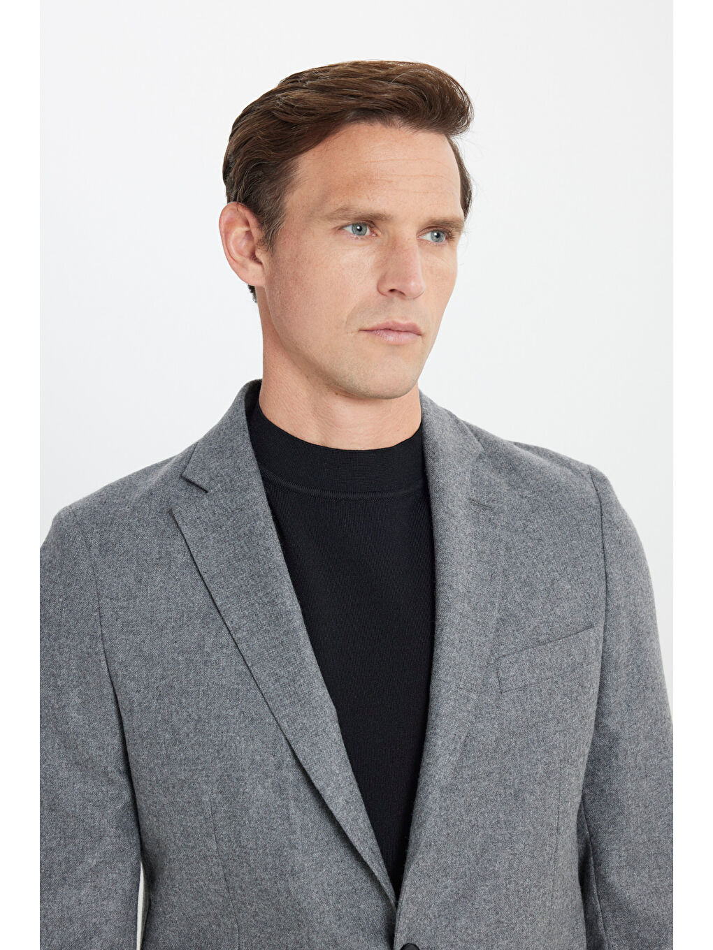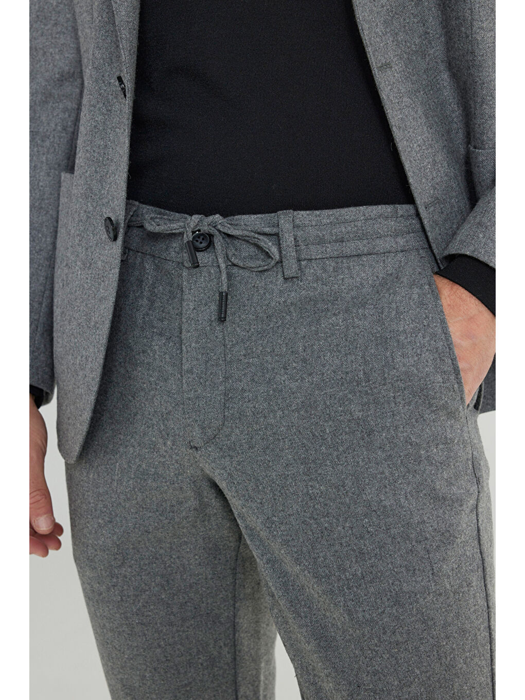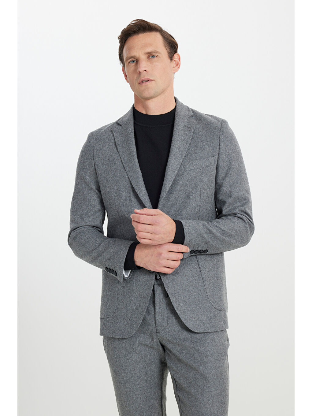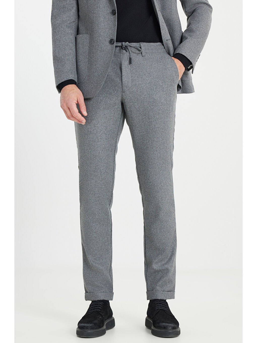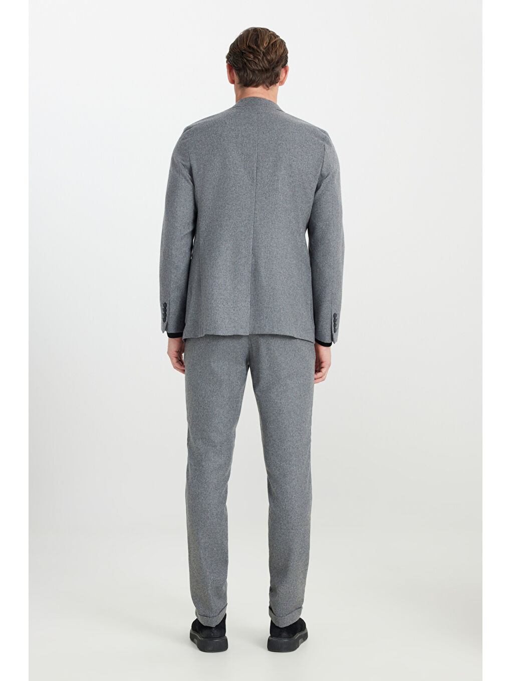 کت و شلوار مردانه پشمی خاکستری باریک، یقه گرد، کمر بند دار، جیب دار