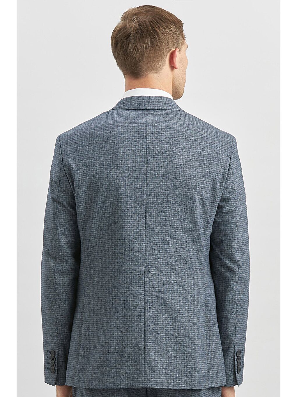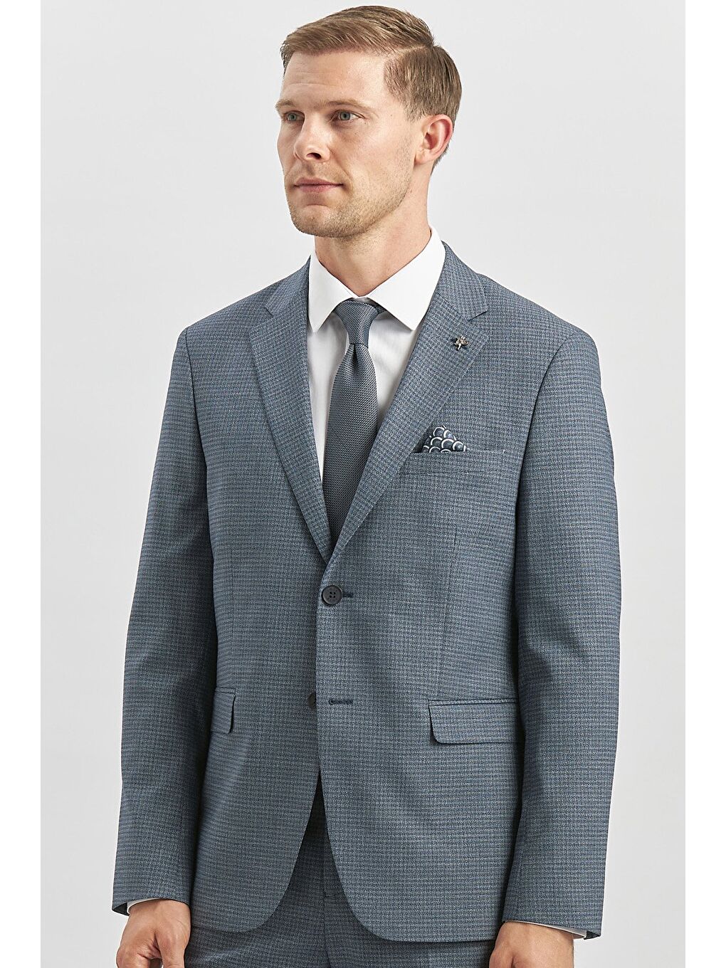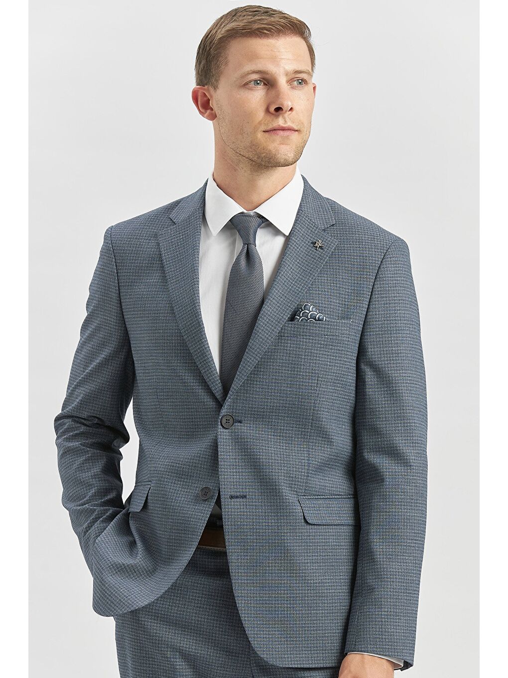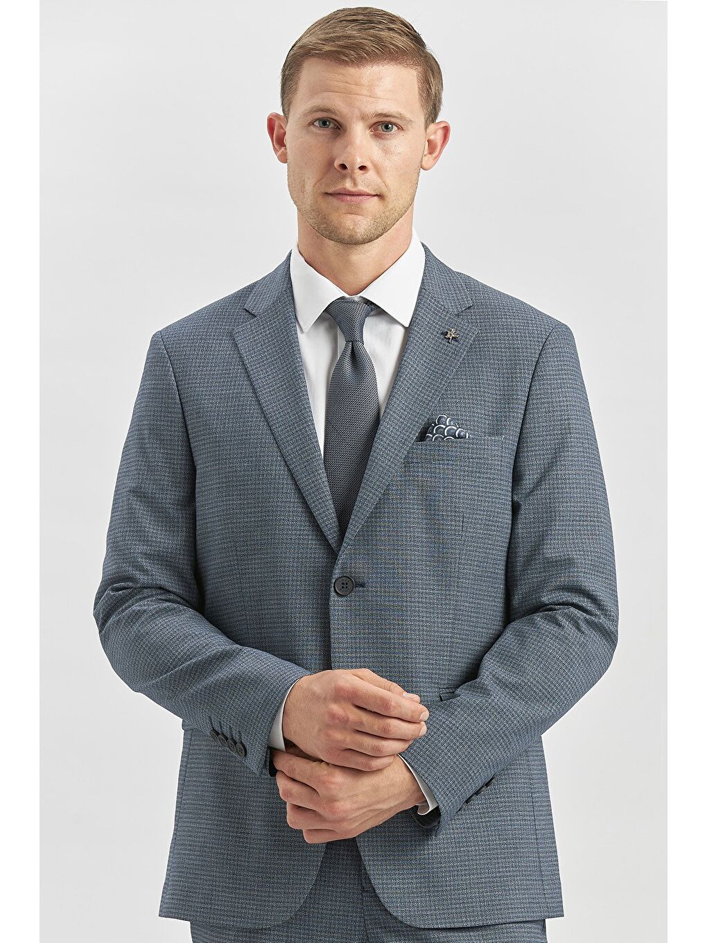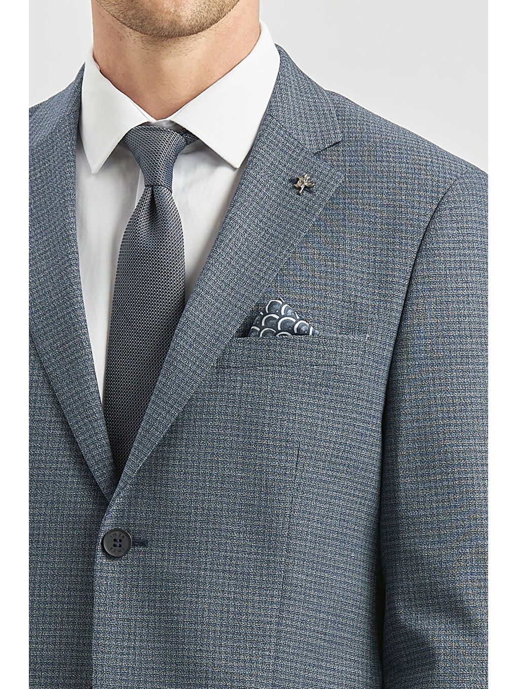 کت و شلوار اسلیم فیت طرحدار سرمهای تیره، یقه تکرنگ، آستردار، کد ۱۰۰۱۲۴۰۱۷۴