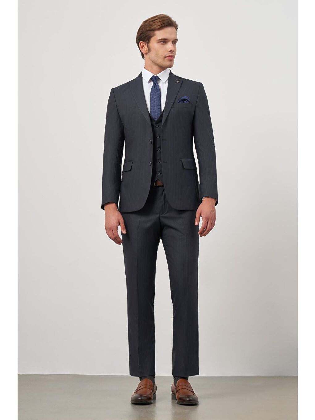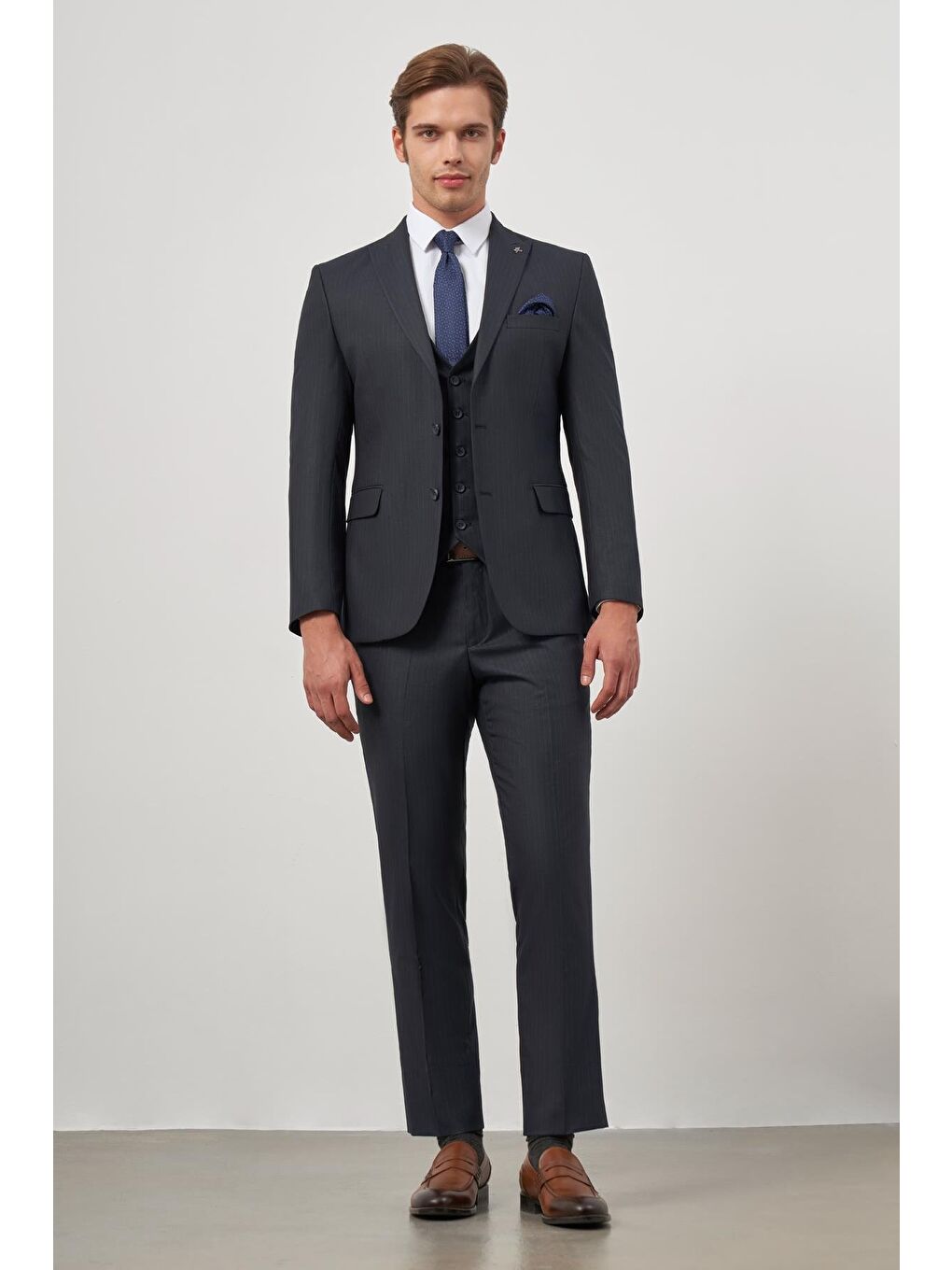 اندازه‌های مدل قد: ۱۸۸ سانتی‌متر سینه: ۱۰۰ سانتی‌متر کمر: ۷۹ سانتی‌متر باسن: ۹۶ سانتی‌متر سایز مدل بر اساس دسته‌بندی‌ها پیراهن: M کت: اسلیم فیت = ۵۰ / کامفورت فیت = ۴۸ ژاکت: اسلیم فیت = ۵۰ / کامفورت فیت = ۴۸ شلوار: اسلیم فیت = ۴۴ کامفورت فیت = ۴۲ شلوار جین: ۳۲ بافتنی: M پوئین: کامفورت فیت: ۴۸ کت: کامفورت فیت: ۴۸ پالتو: M-48 ترکیب پارچه: ۴۰٪ پلی‌استر ۳٪ الاستین ۲۳٪ پشم ۳۴٪ ویسکوز طرح: طرح راه راه ویژگی: ۲ دکمه جزئیات جنس: پارچه طول پا: سایز استاندارد شکاف: دو شکاف پایین / آستین: ۶ پایین