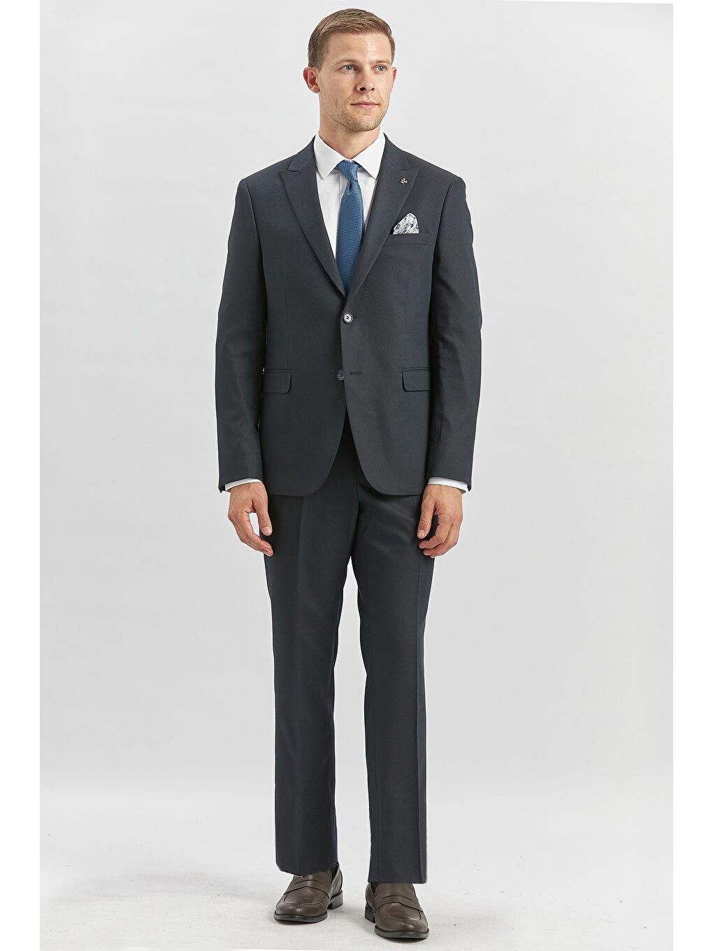 کت و شلوار باریک 1001240172 یقه دم کبوتری الاستین 6 دراپ با طرح آبی تیره