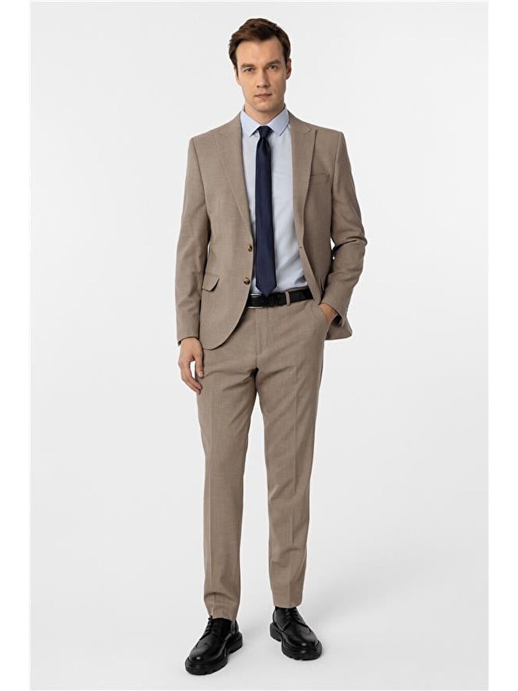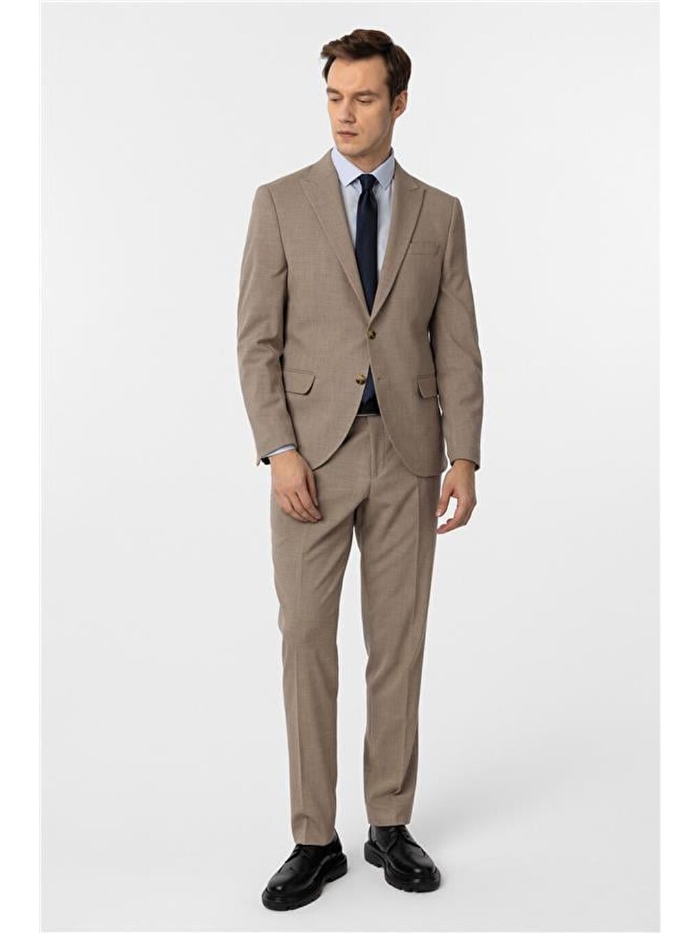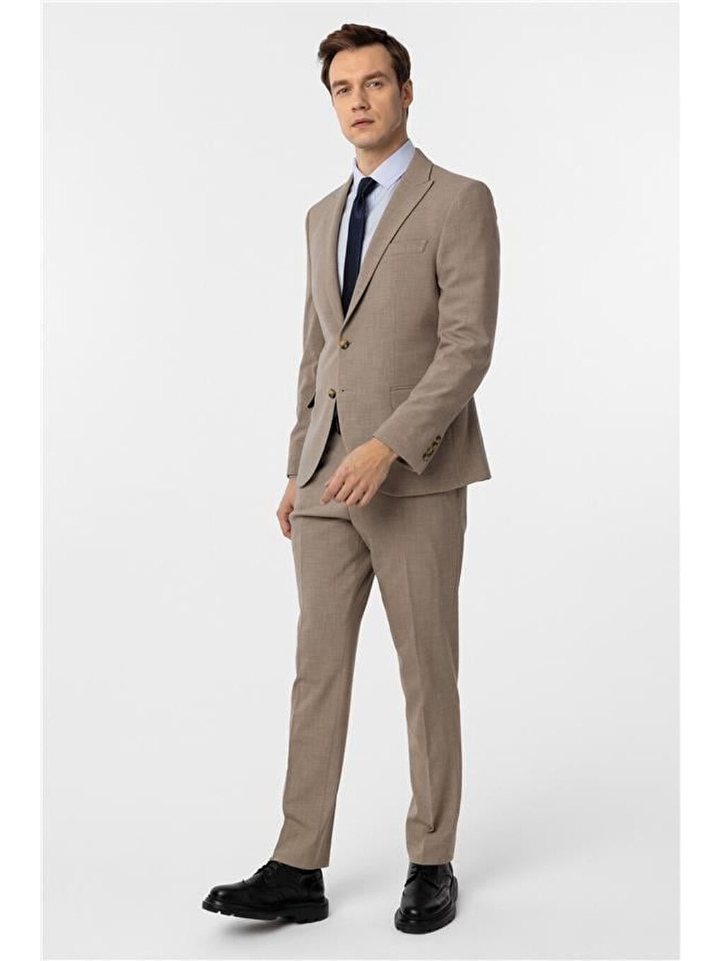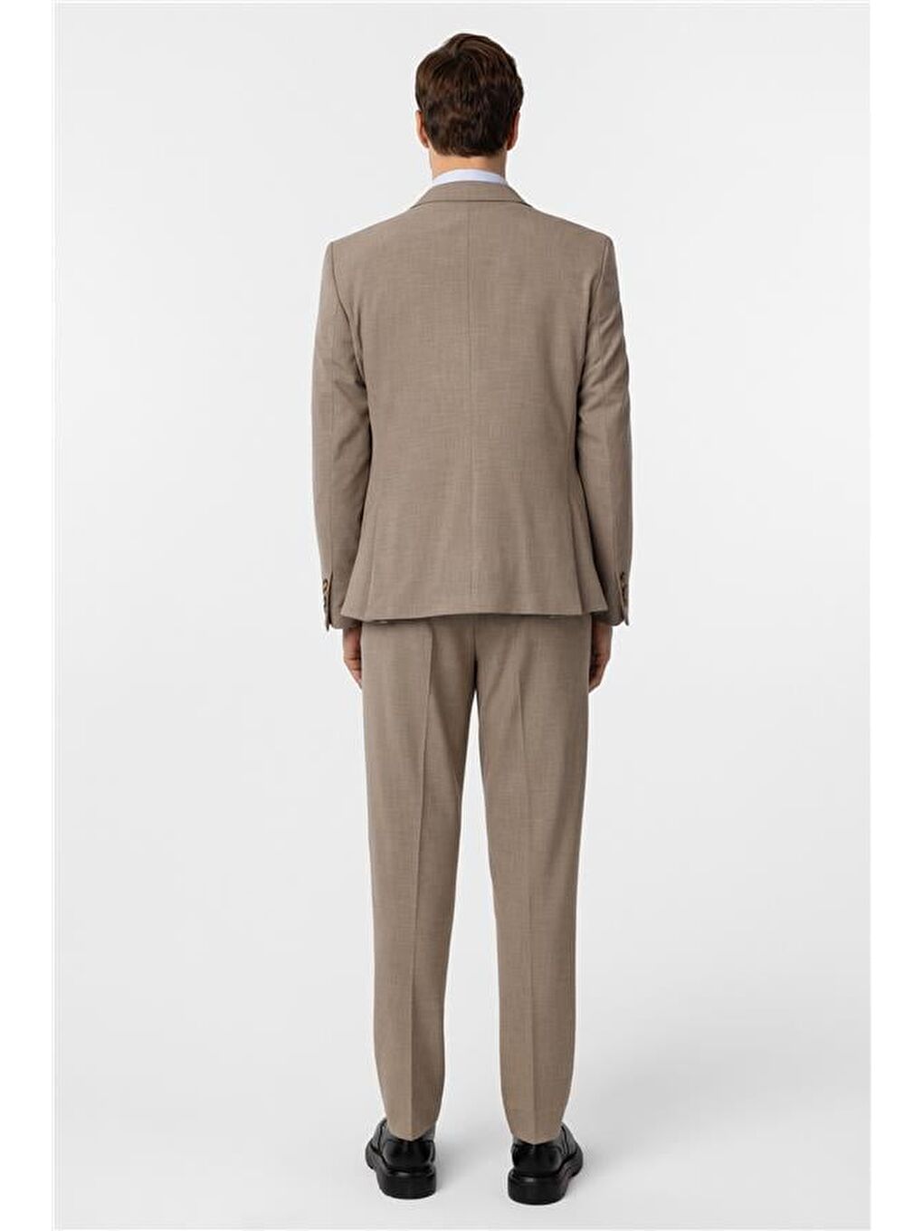 کت و شلوار یقه هفت باریک طرح دار قهوه ای شیری