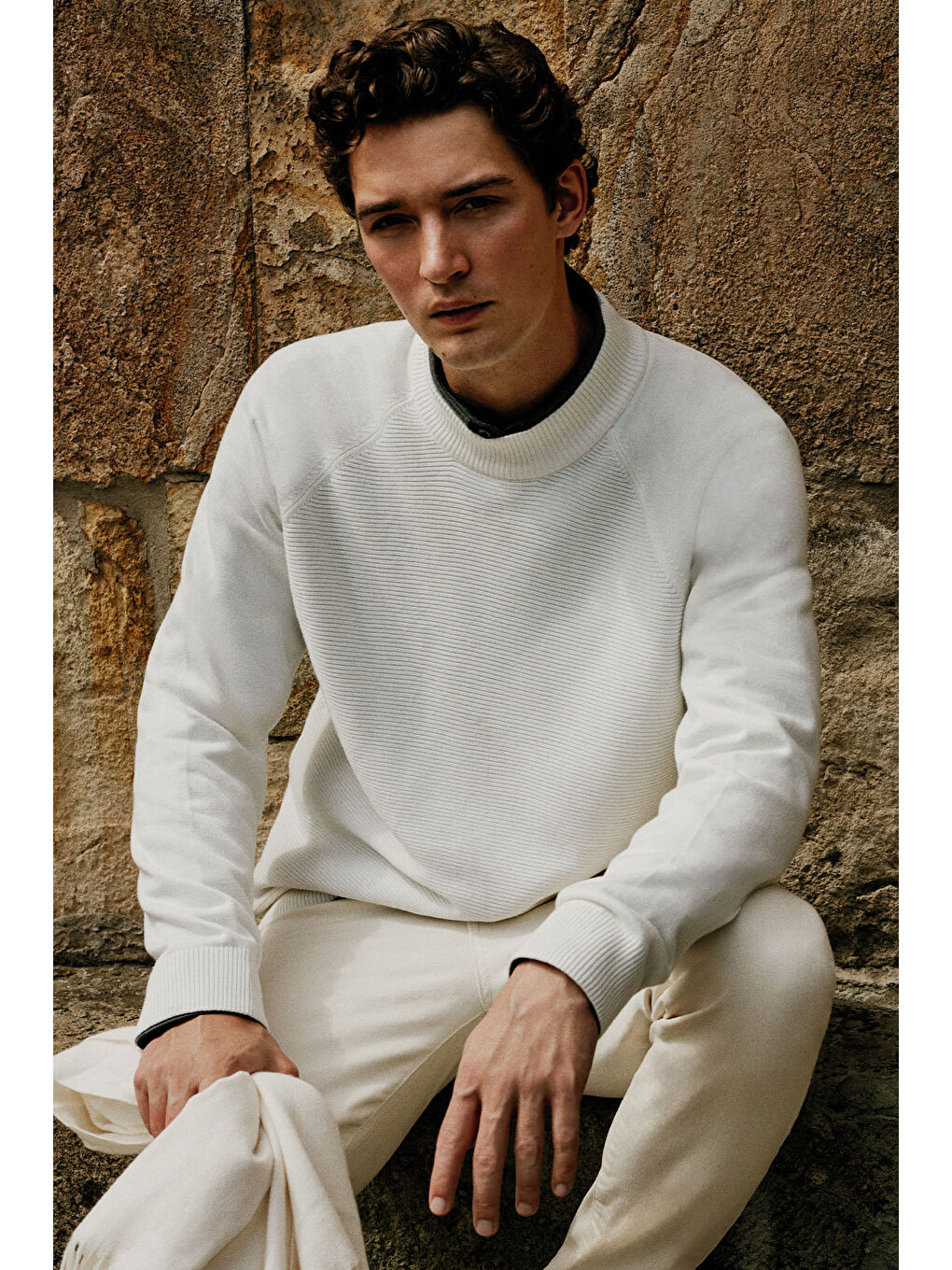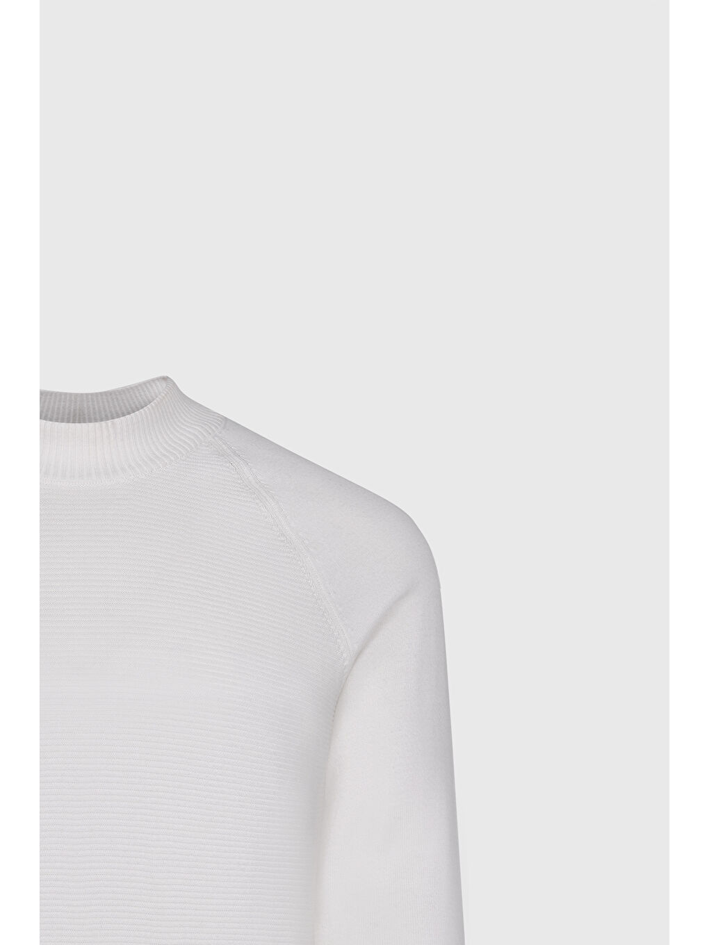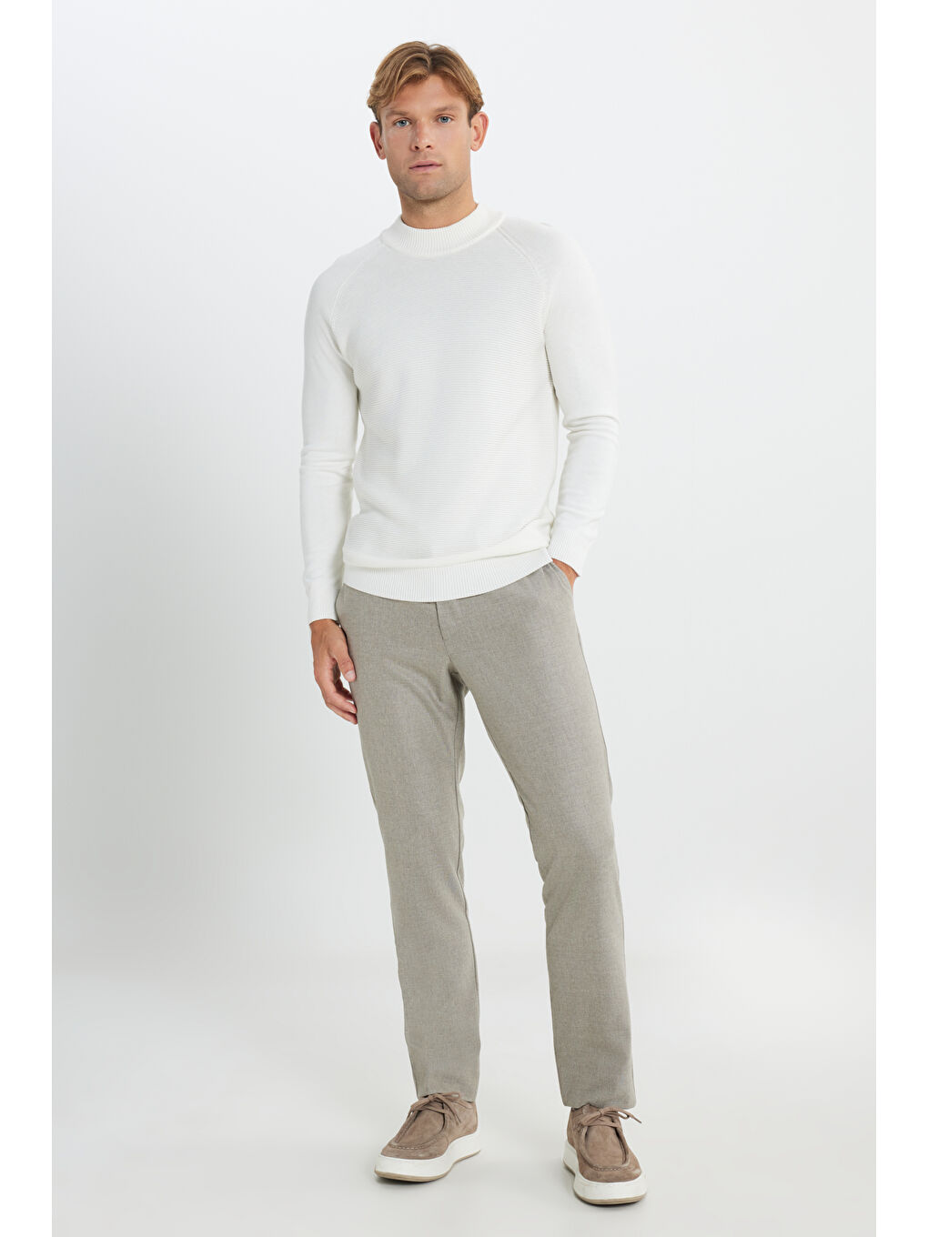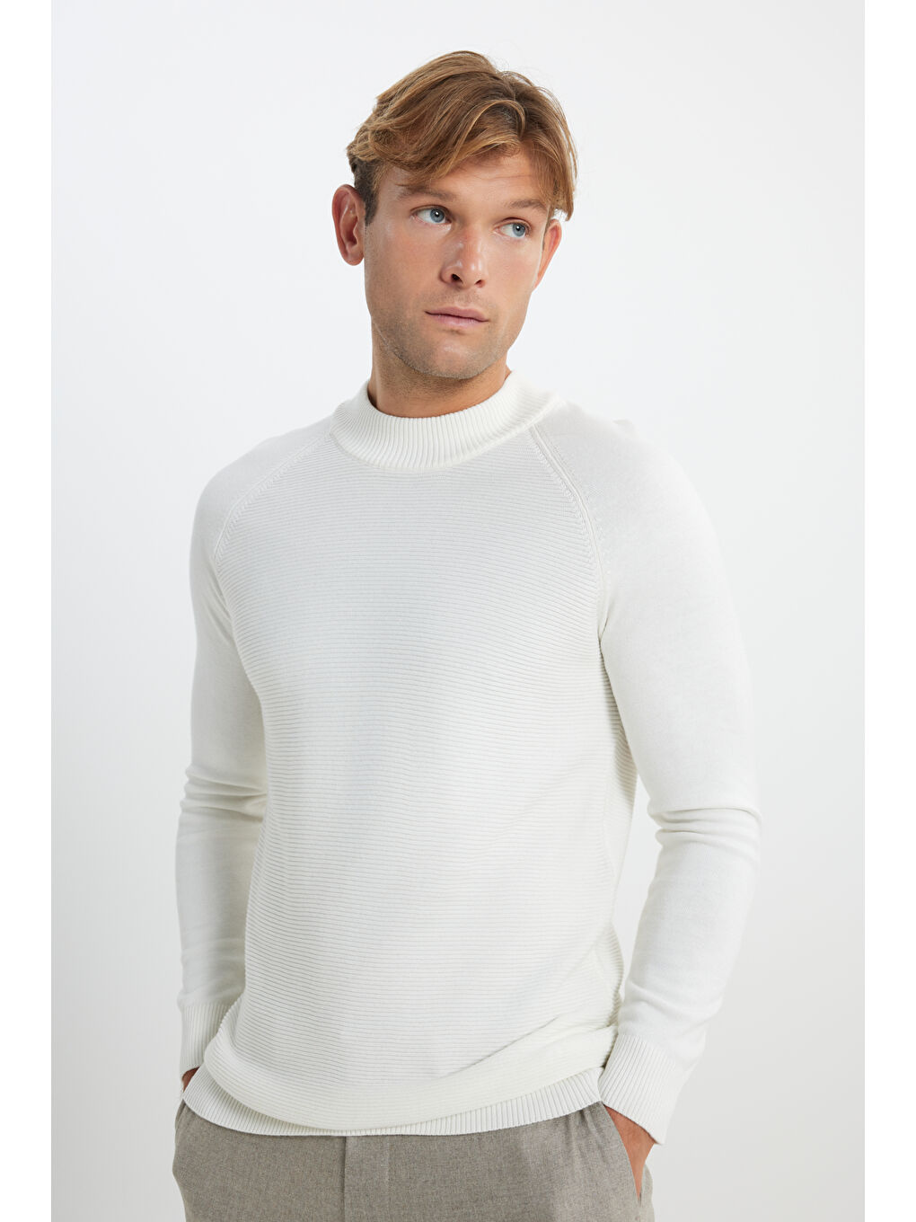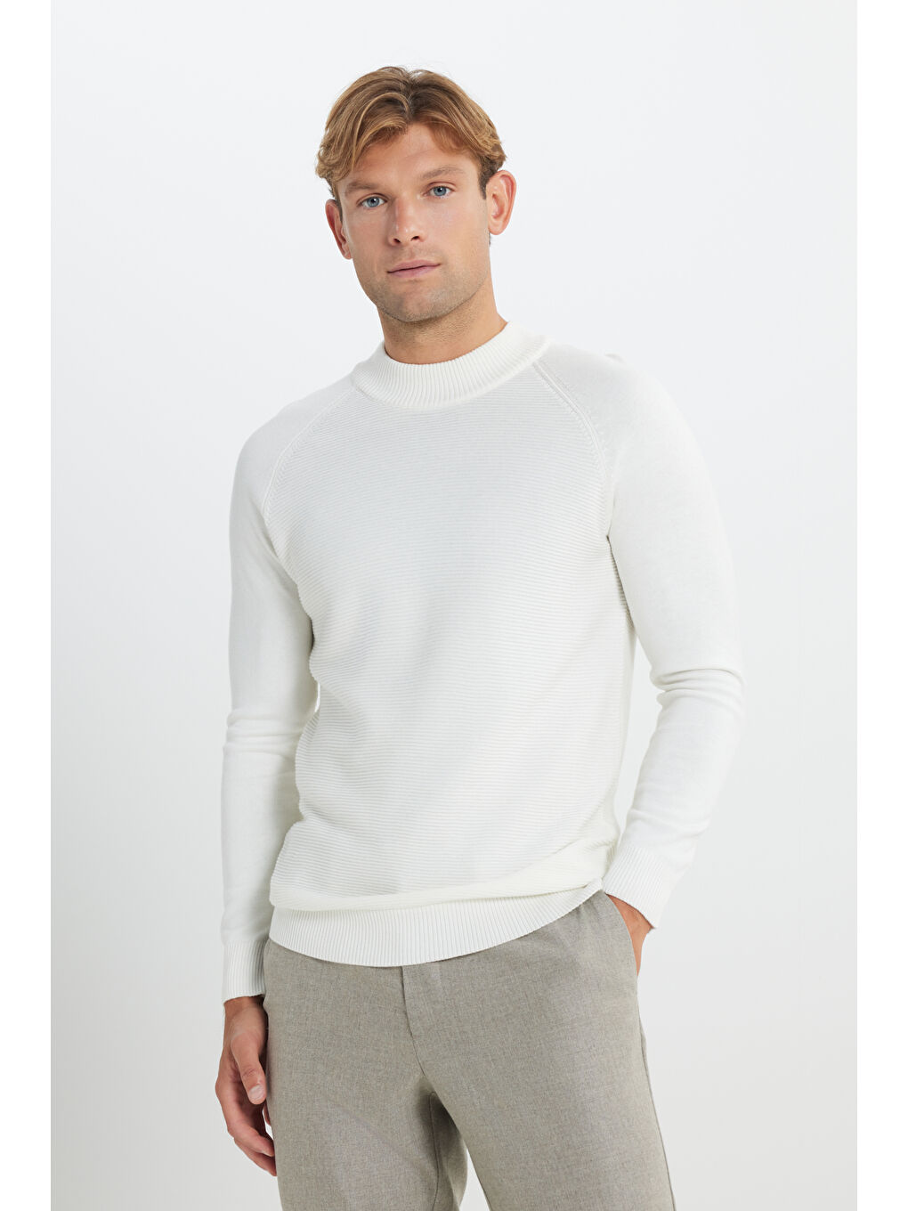 ژاکت بافتنی طرح دار یقه اسکی نیم تنه مردانه Ecru Cotton Standard Fit Regular Cut