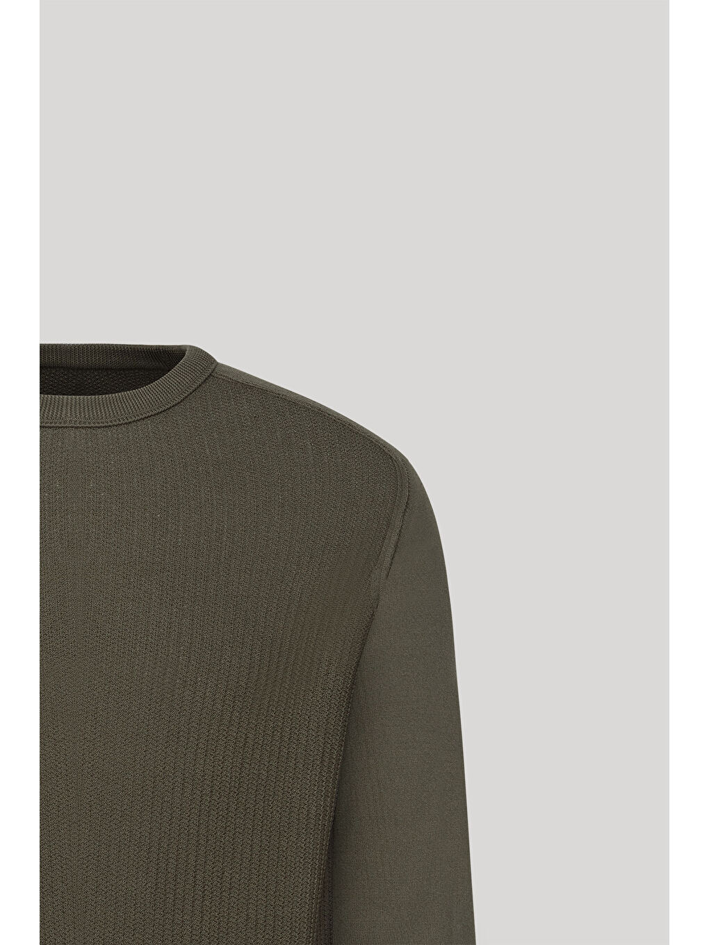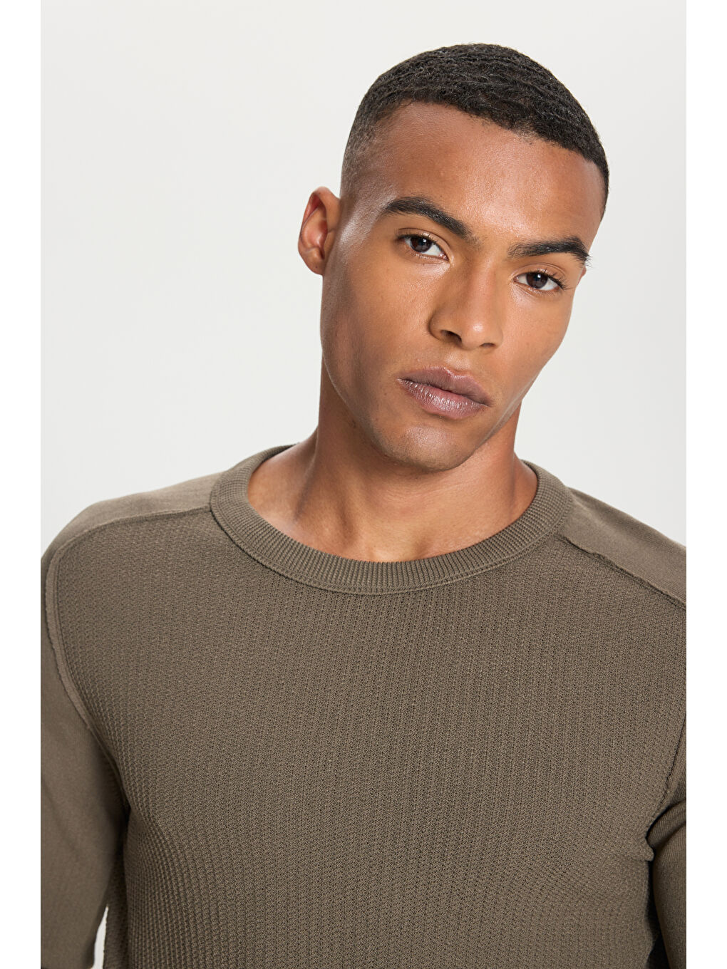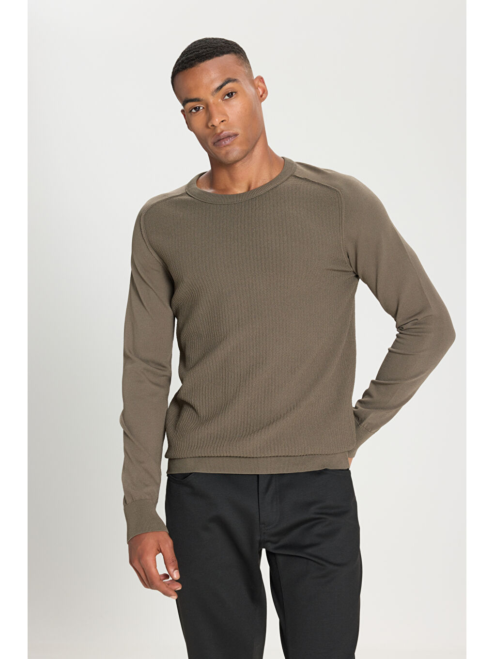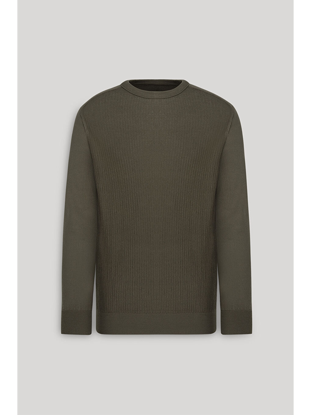 ژاکت بافتنی مردانه خاکی استاندارد، یقه گرد با برش معمولی، طرح ژاکارد