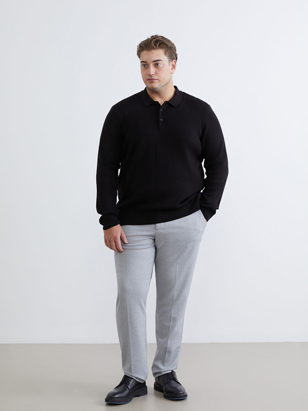 پلیور مردانه یقه پولو، آستین بلند، جلو دکمهدار، سرآستینها و لبهی چیندار.