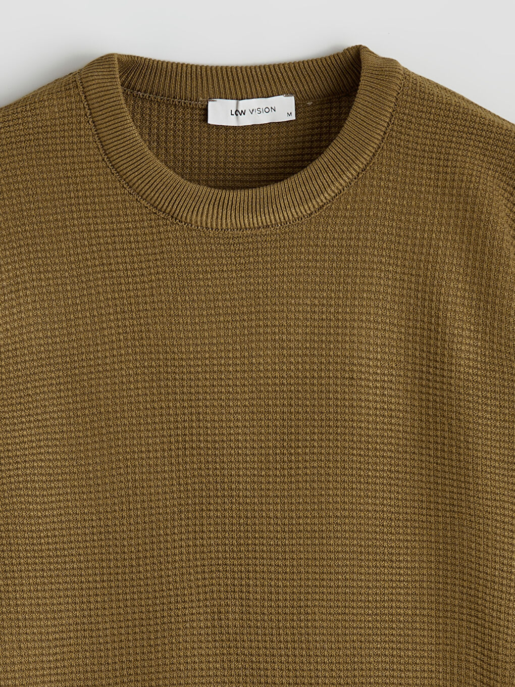 این پلیور مردانه یقه گرد و آستین بلند از پارچه طرح لانه زنبوری ساخته شده است. سر آستینها و لبه آن کشبافت است.