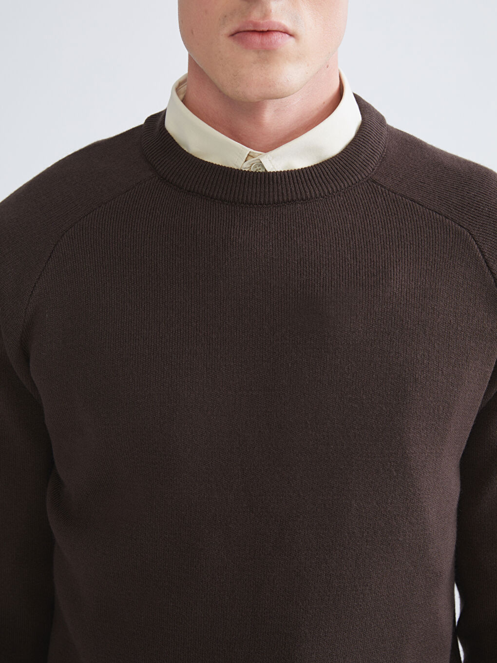 این پلیور یقه گرد مردانه از پارچه کشباف با ضخامت متوسط ساخته شده و آستینهای بلند رگلان دارد.