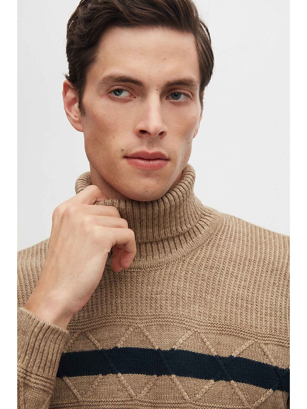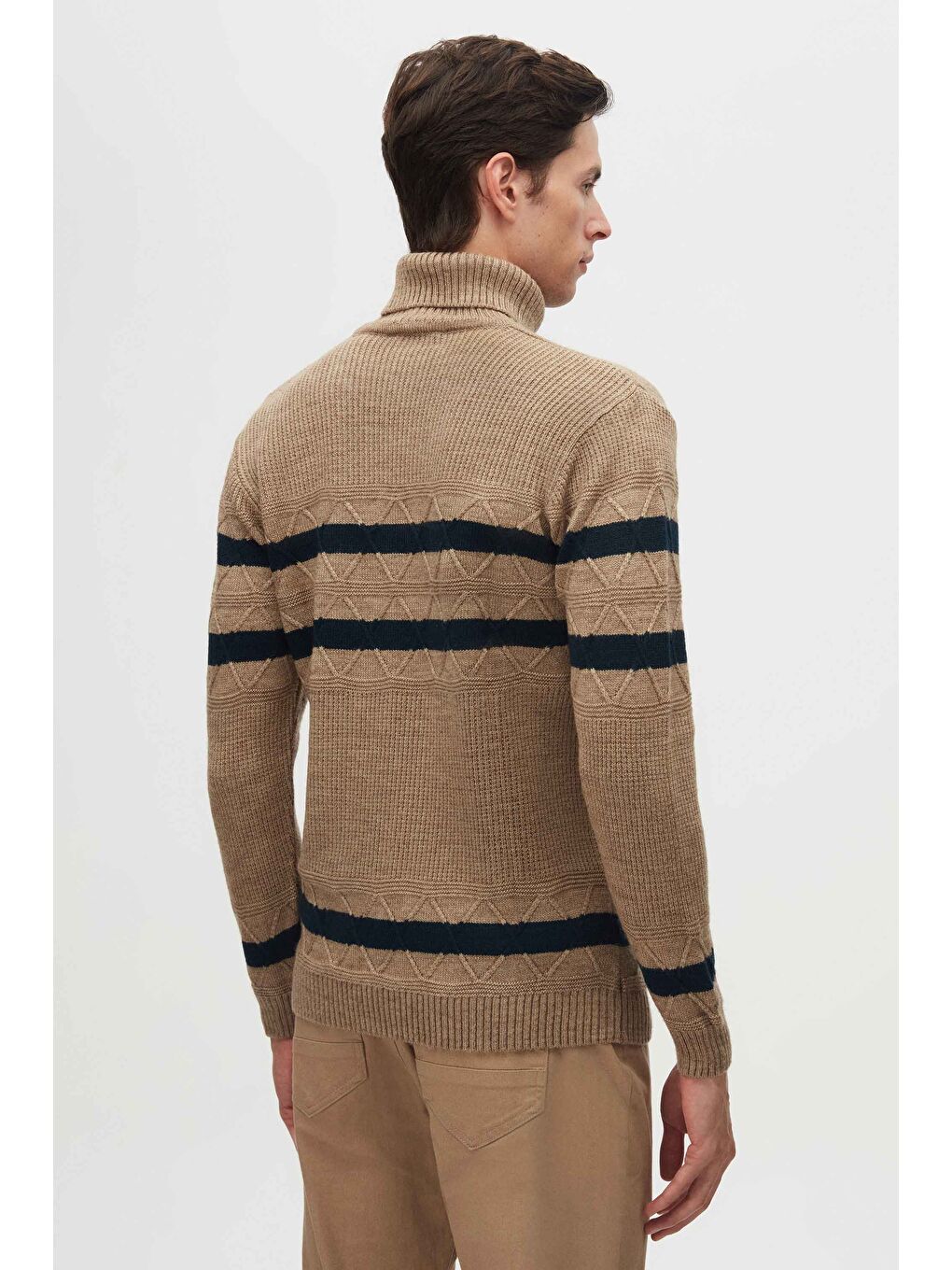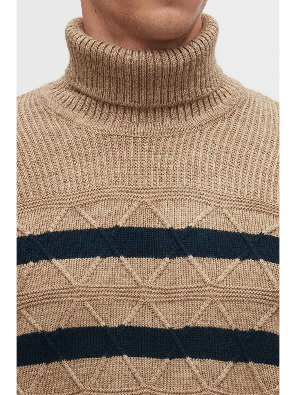ژاکت بافتنی یقه اسکی کامل قهوهای طرح راه راه شتری بدون پرز، سایز معمولی