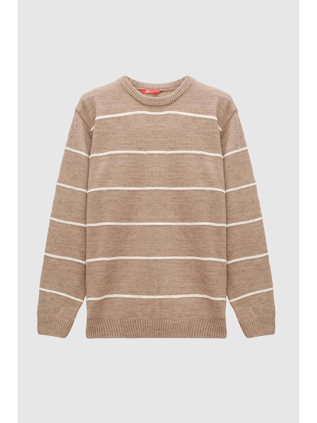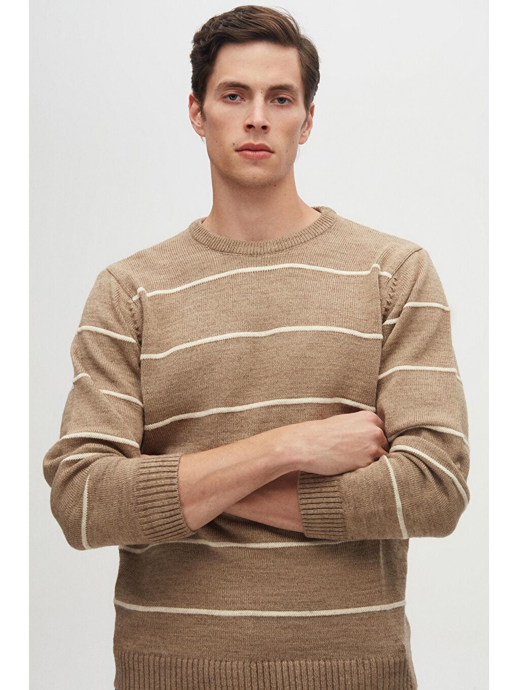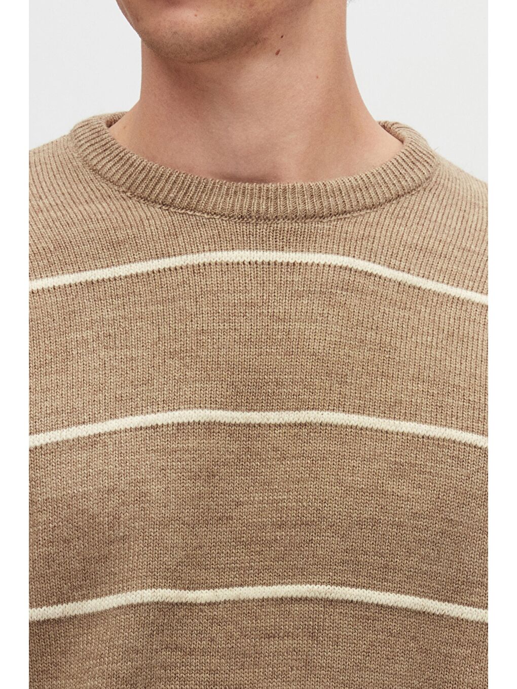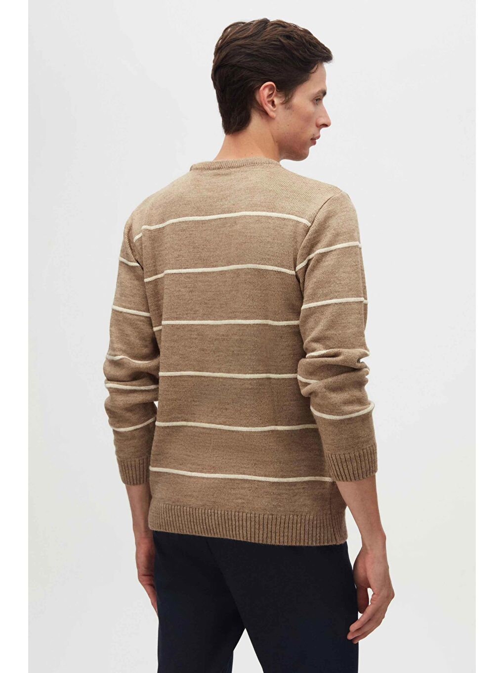 ژاکت بافتنی یقه گرد راه راه سمور یا راسو بدون پرز بژ معمولی