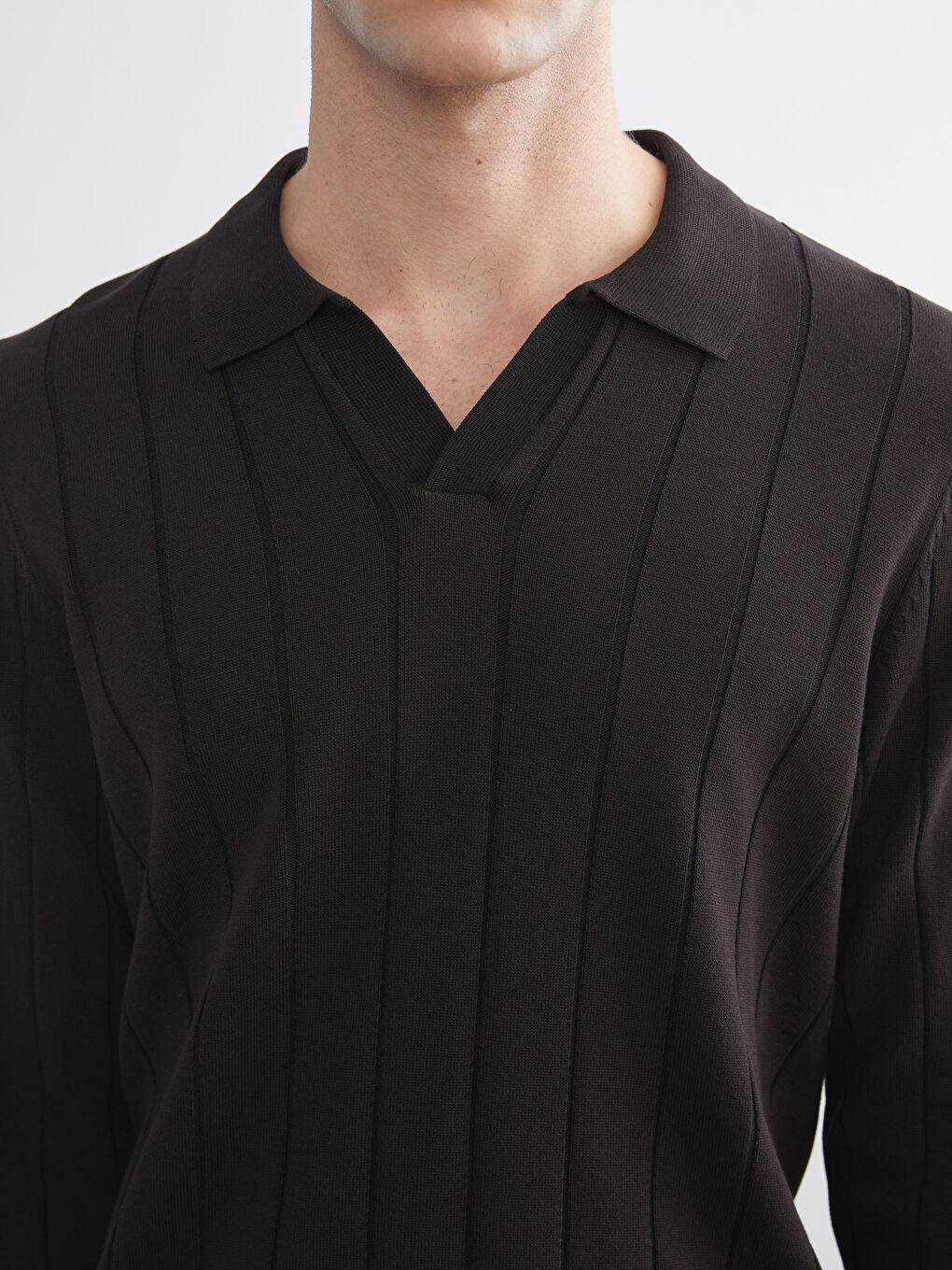پلیور مردانه یقه پولو با آستین بلند و طرح راه راه عمودی. سرآستین‌ها و لبه‌ی لباس راه راه است.