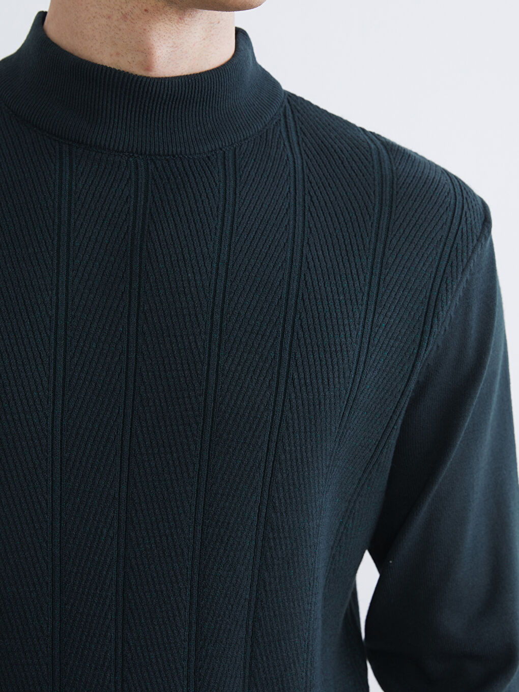 این پلیور مردانه، دارای یقه اسکی و آستین بلند، از پارچه کشباف با ضخامت متوسط و بافت راه راه عمودی ساخته شده است.