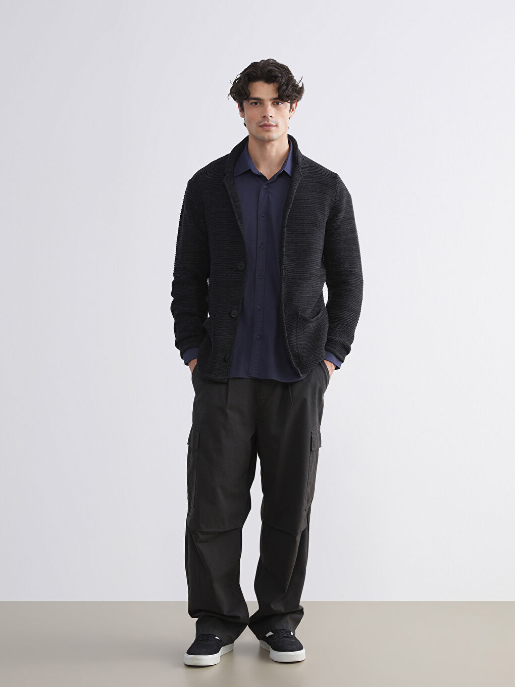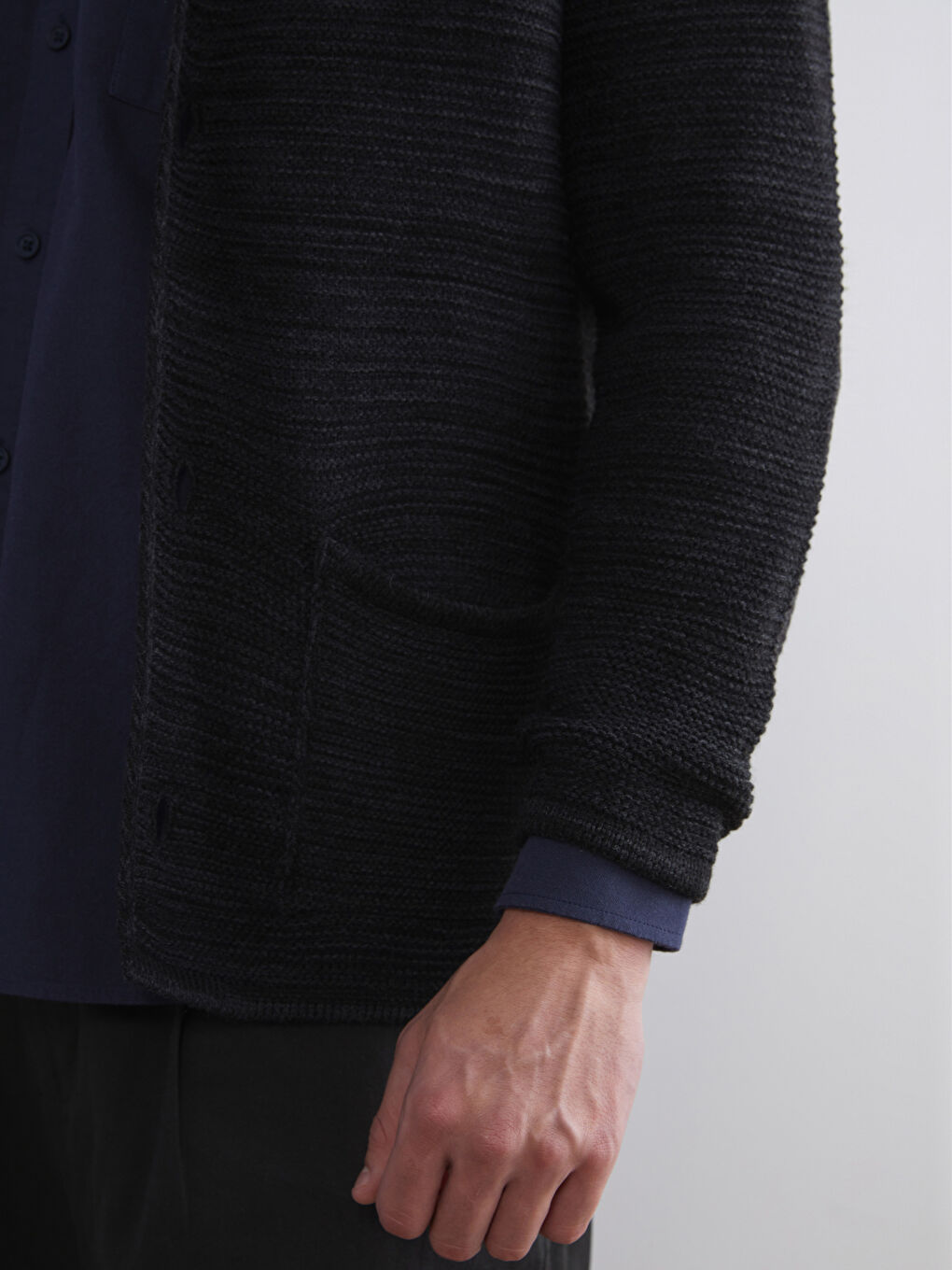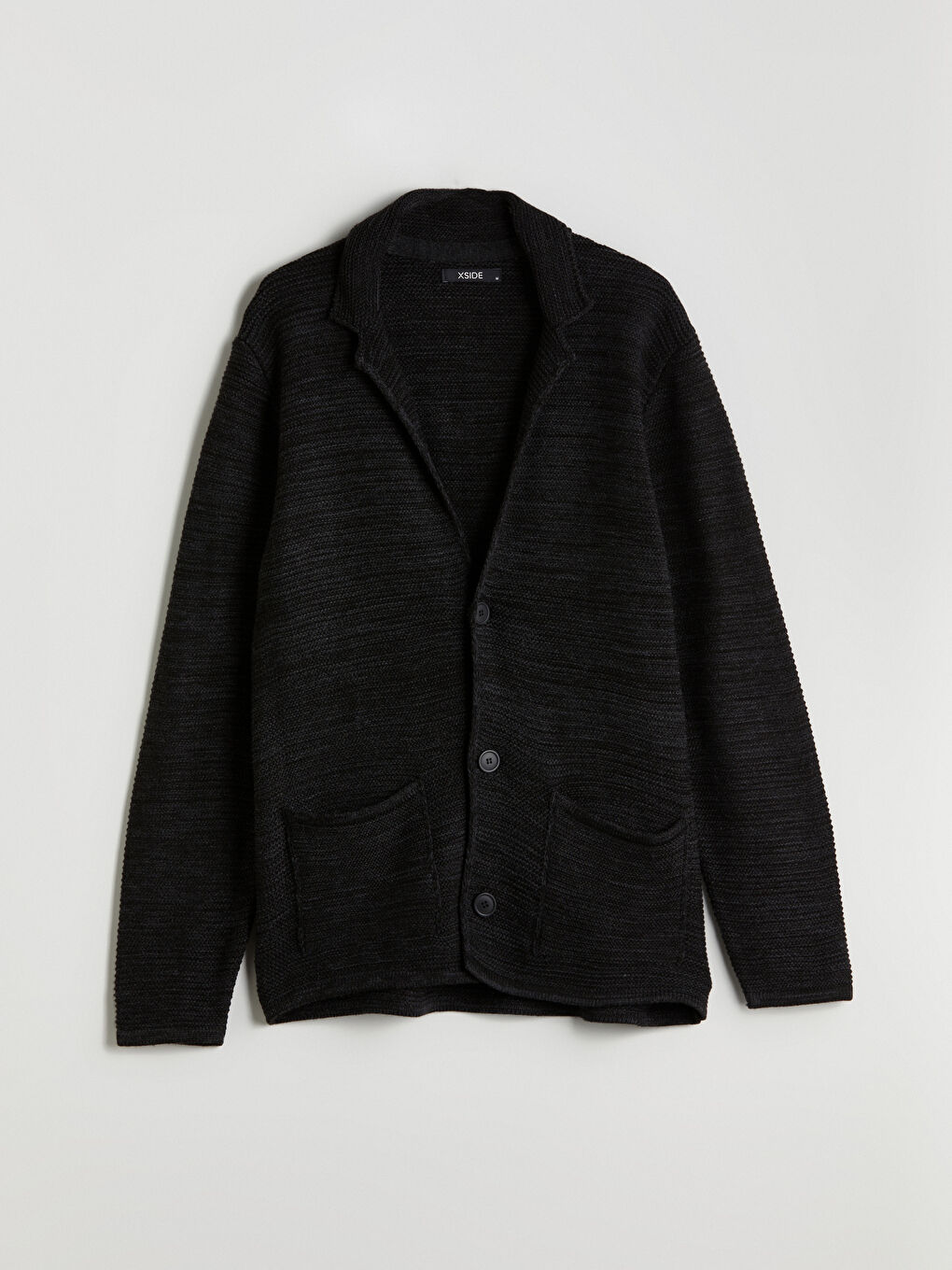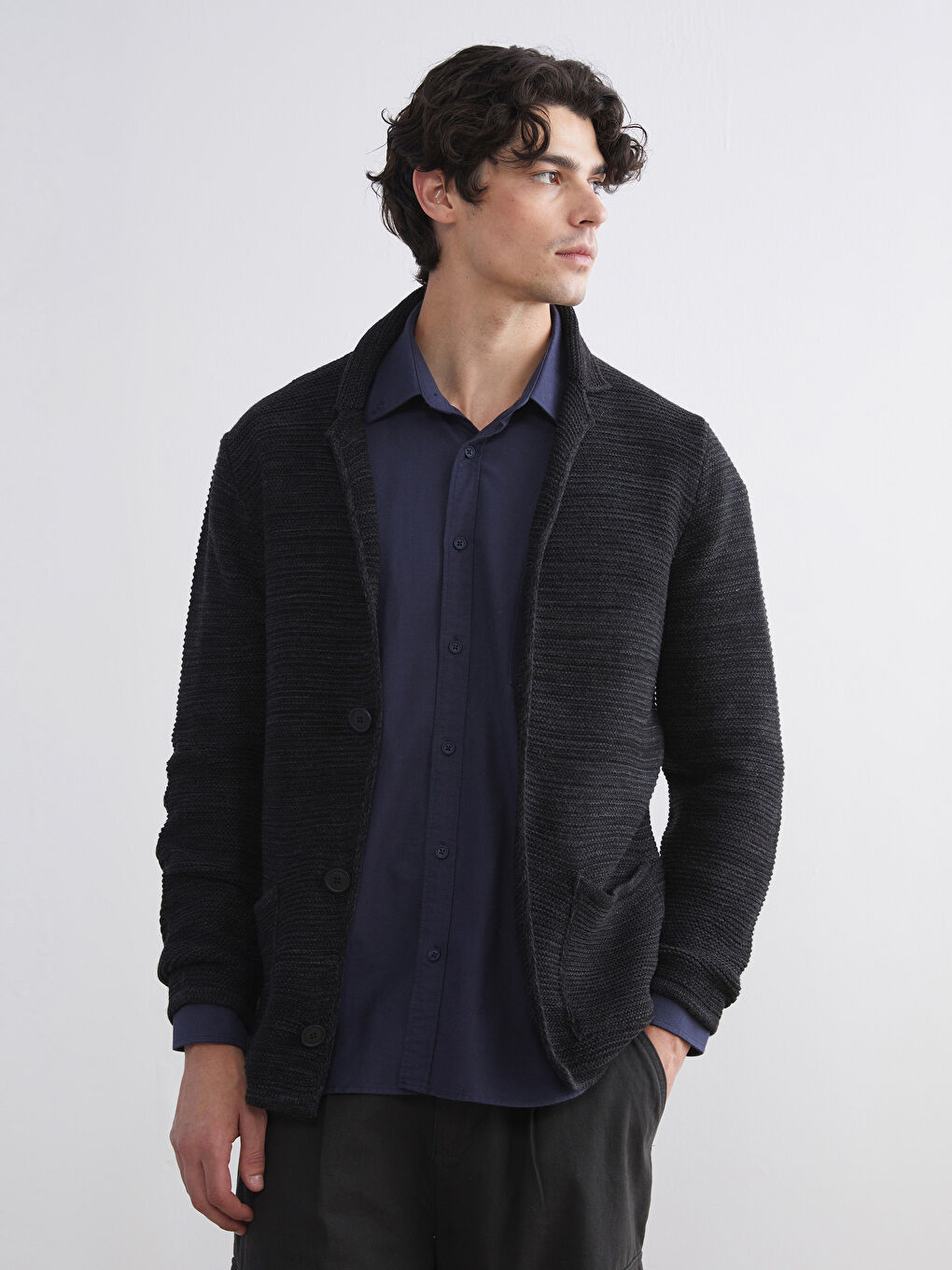 ژاکت کش باف پشمی مردانه با طرح استاندارد از پارچه کشباف با یقه هفت دوخته شده است.