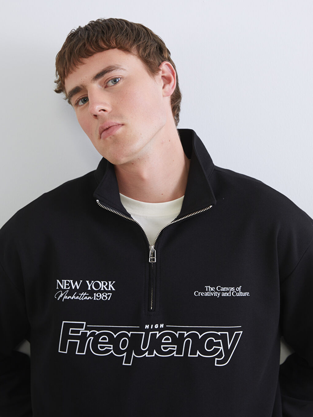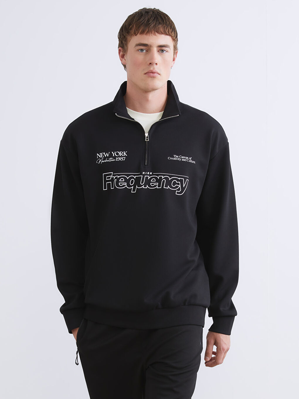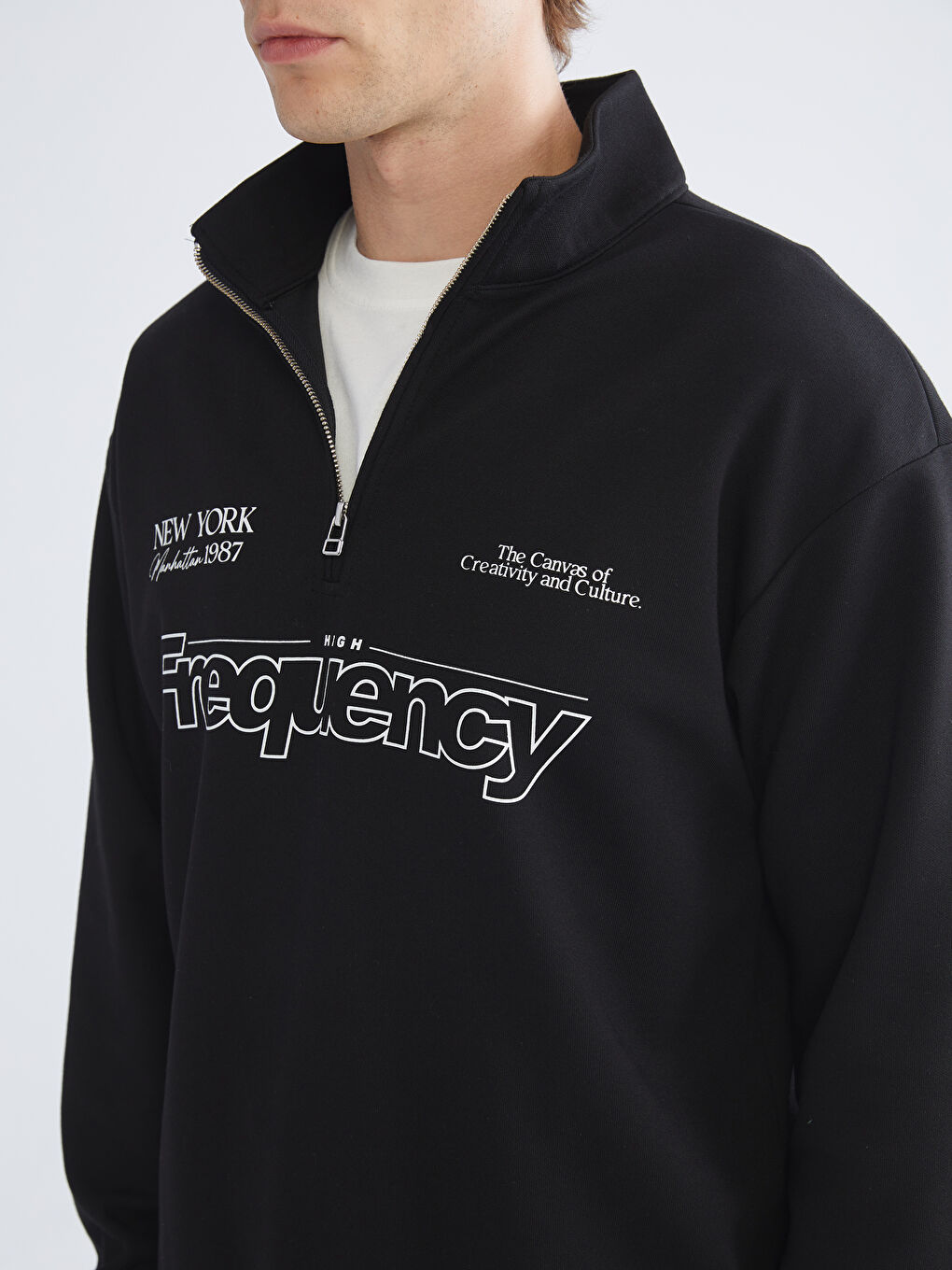 سویشرت مردانه با نیم زیپ، یقه ایستاده، آستین بلند و طرح چاپی در جلو. آستینها و لبهی تیشرت کشدوزی شده است.