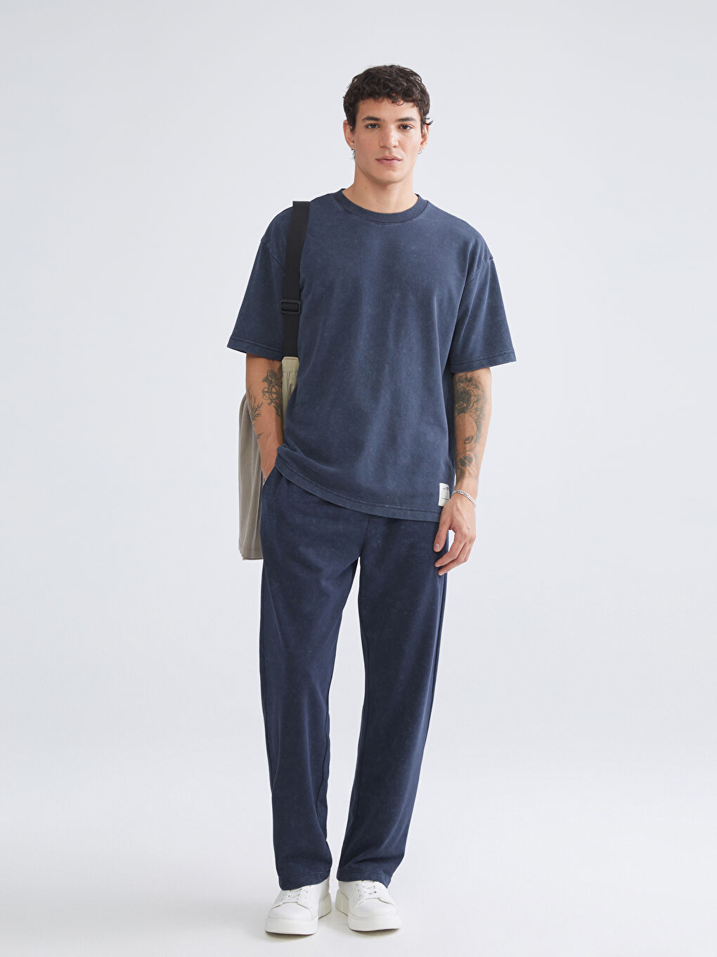 این سویشرت مردانه یقه گرد، سرشانه افتاده و آستین کوتاه است. از پارچه سه نخ با ضخامت متوسط ساخته شده است.