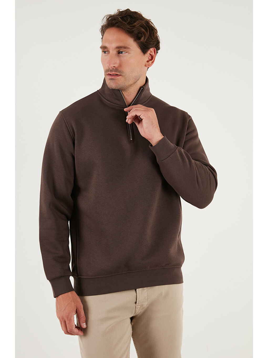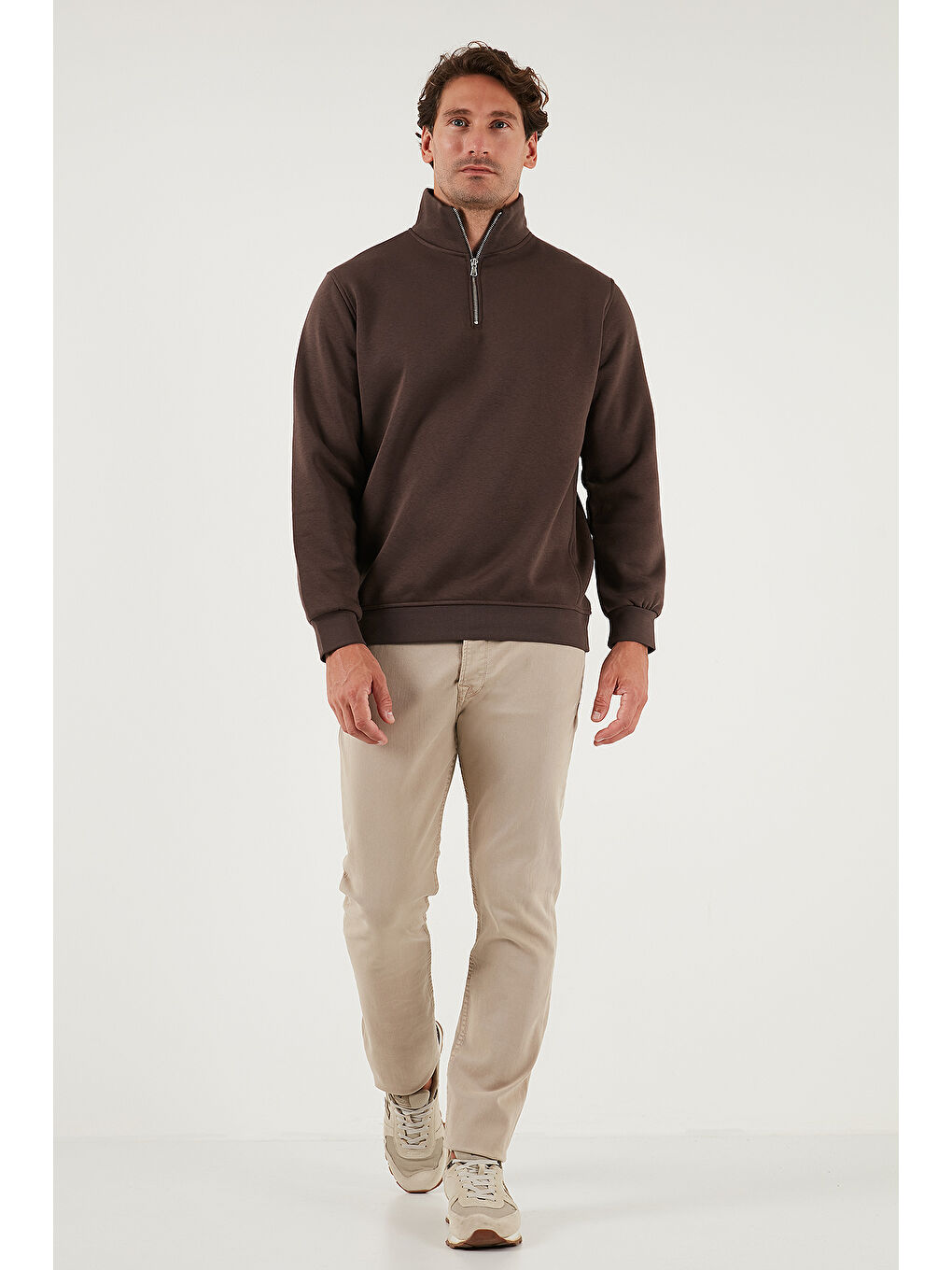 سویشرت مردانه قهوهای نخی معمولی یقه ایستاده نیم زیپ کد ۵۹۰۵۲۵۹۲
