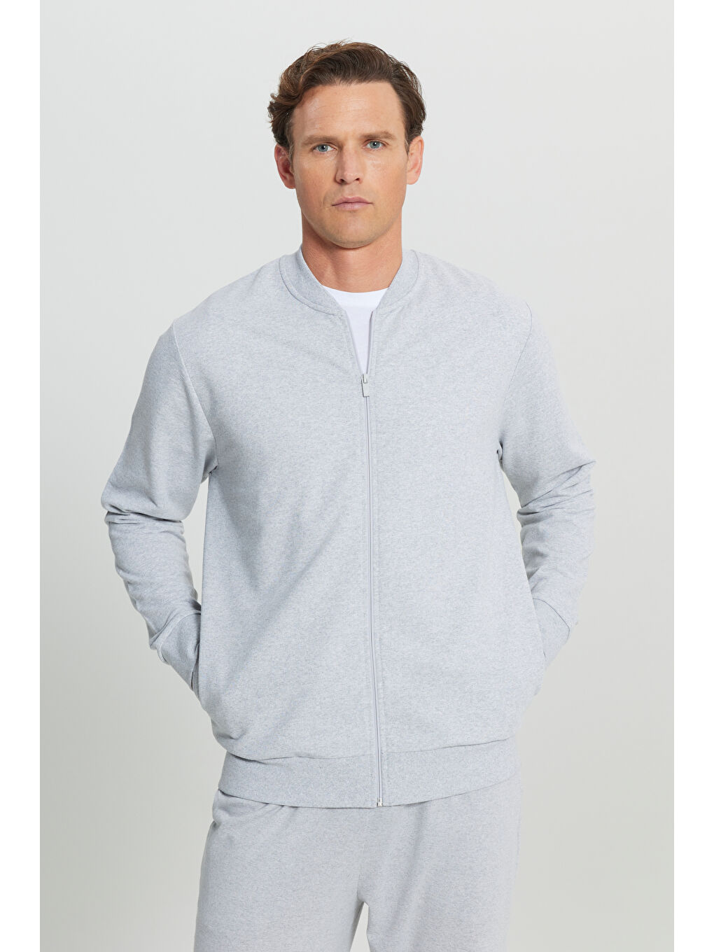 سویشرت مردانه خاکستری ملانژ نخی، یقه دانشگاهی برش معمولی، سایز استاندارد، جیب کناری