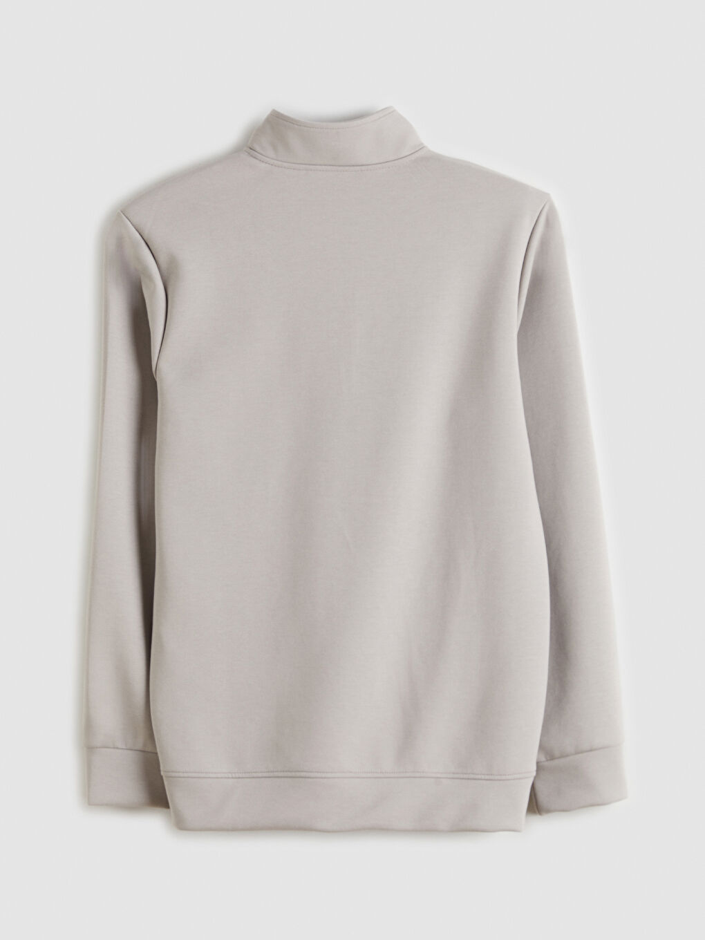 این سویشرت مردانه با یقه ایستاده و آستین بلند، از پارچه اینترلاک ساخته شده است. این سویشرت در جلو با نیم زیپ بسته میشود و آستینها و لبه آن کشباف است.