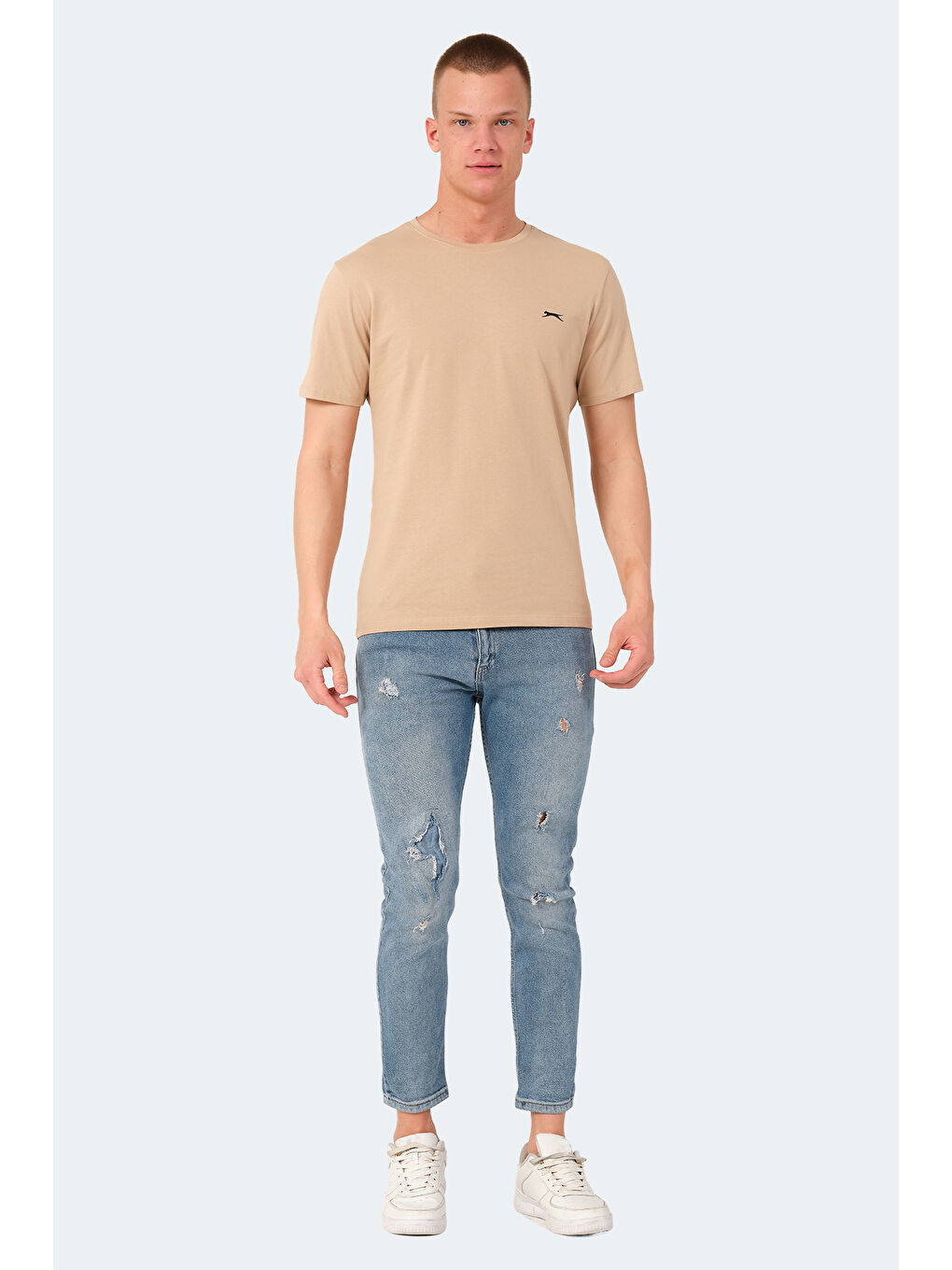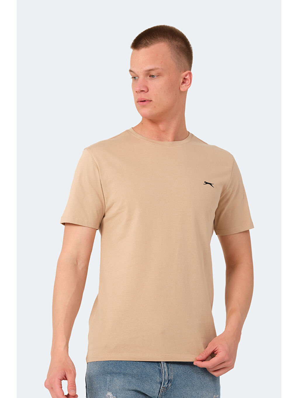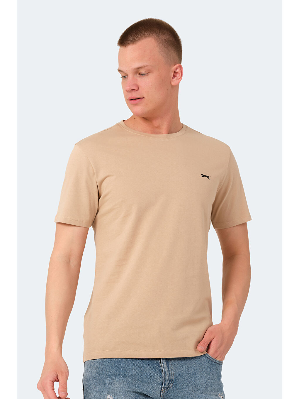 تیشرت آستین کوتاه مردانه یقه گرد بژ با نوشته پشت