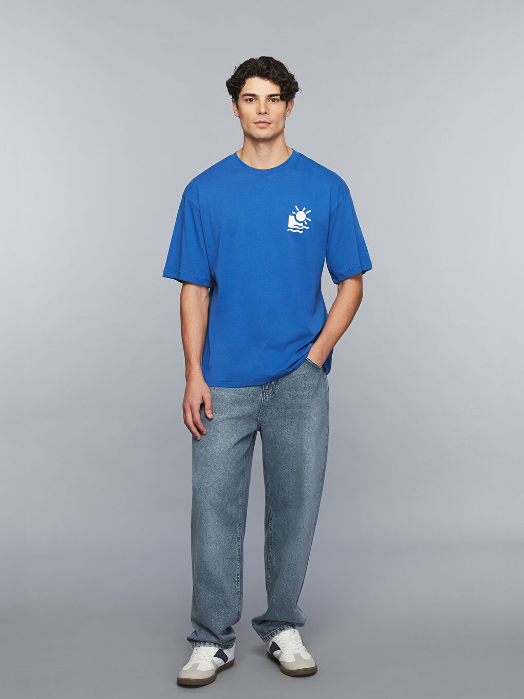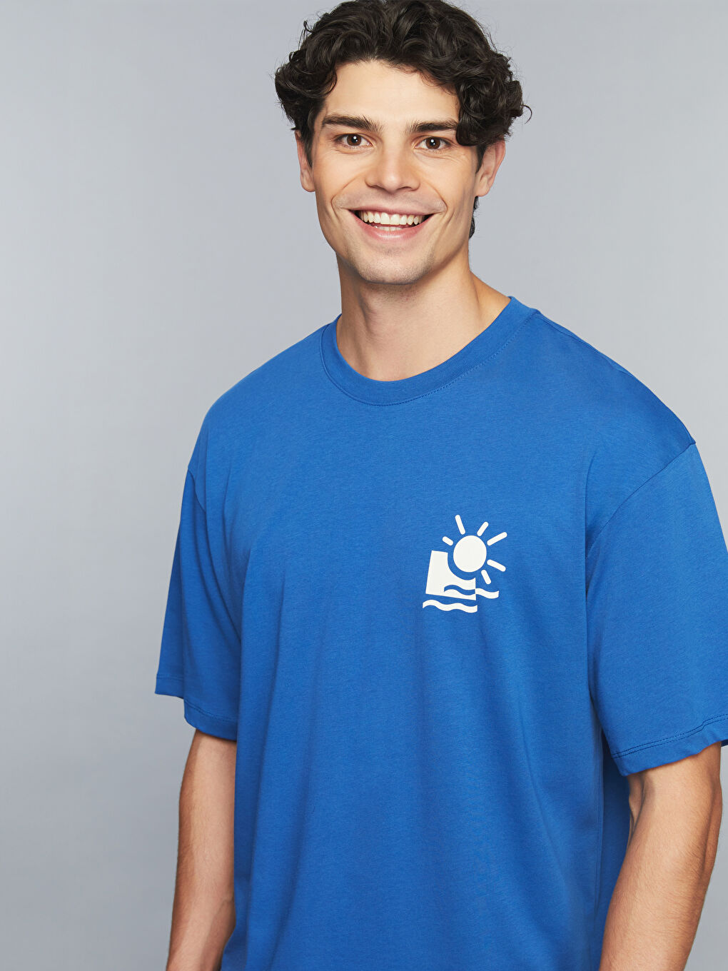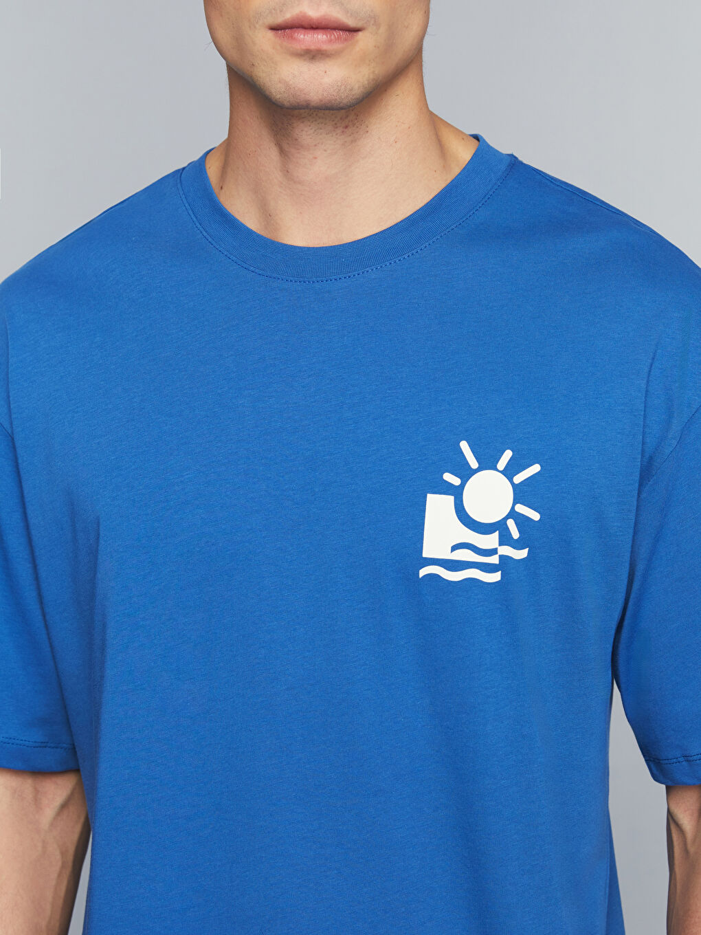 تی شرت مردانه طرح یقه گرد آبی با طرح چاپی نخی شانه شده