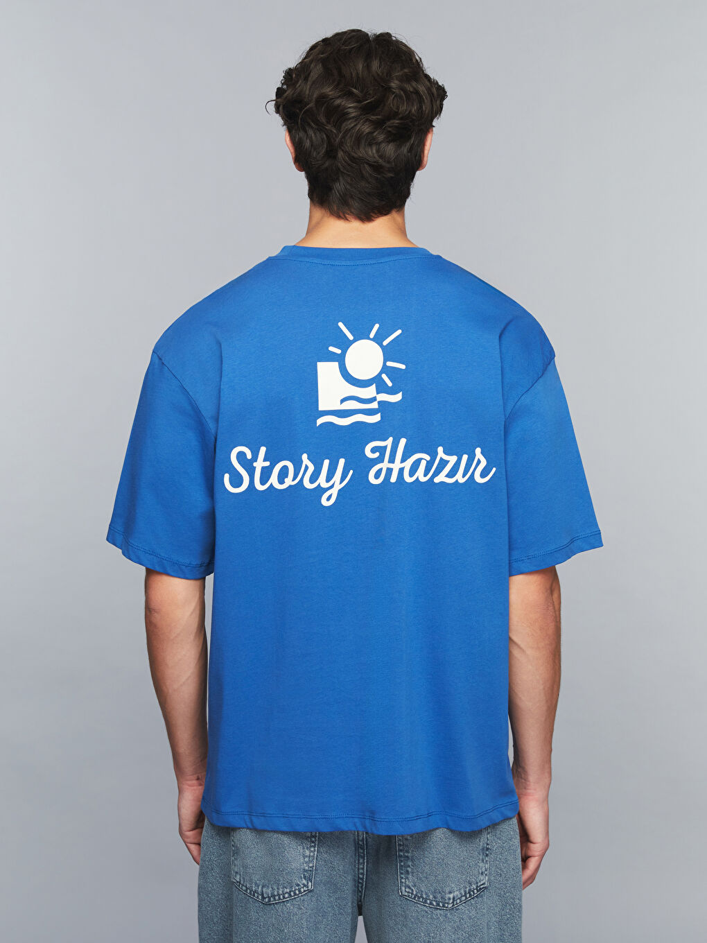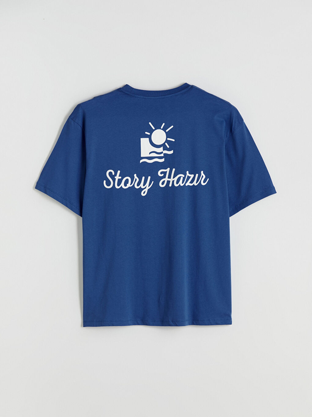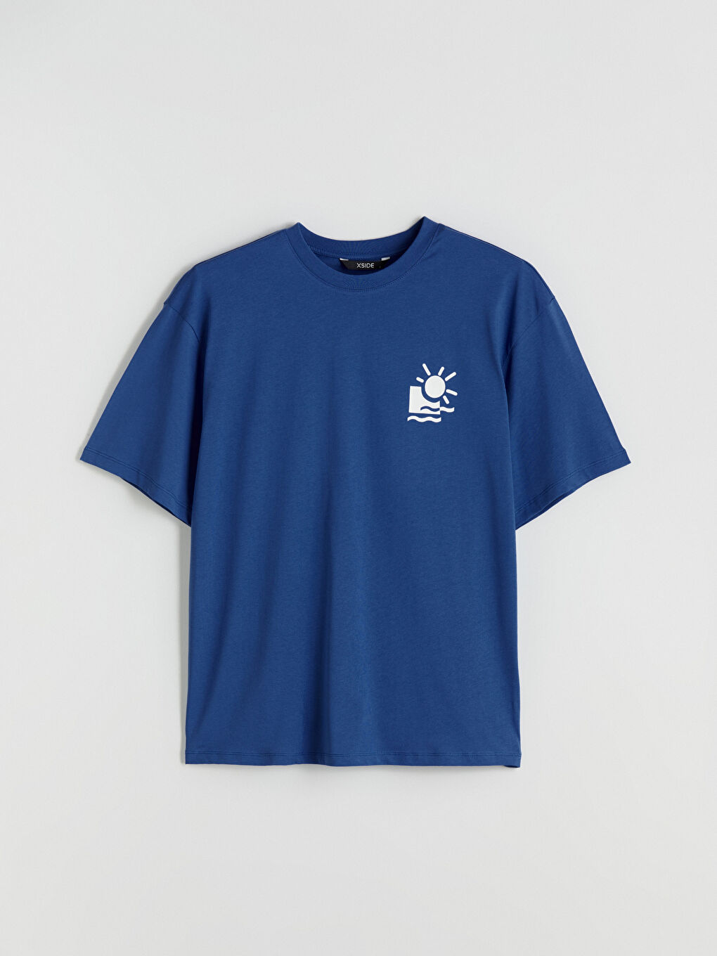 تی شرت مردانه طرح یقه گرد آبی با طرح چاپی نخی شانه شده