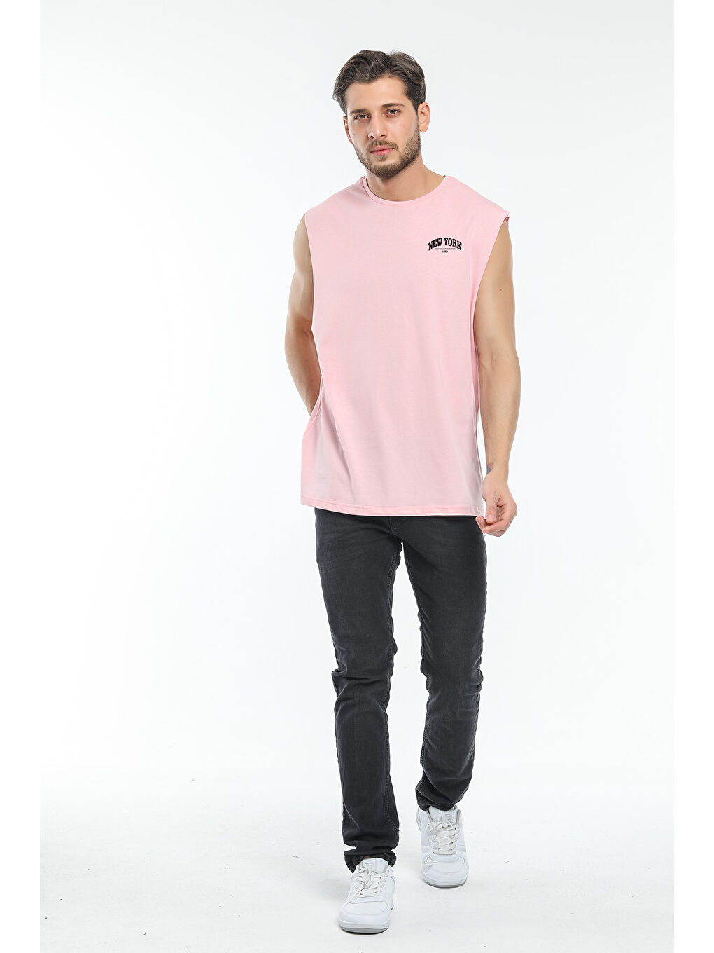 تی شرت مردانه طرح نیویورک بدون آستین یقه گرد صورتی SPR25AT941