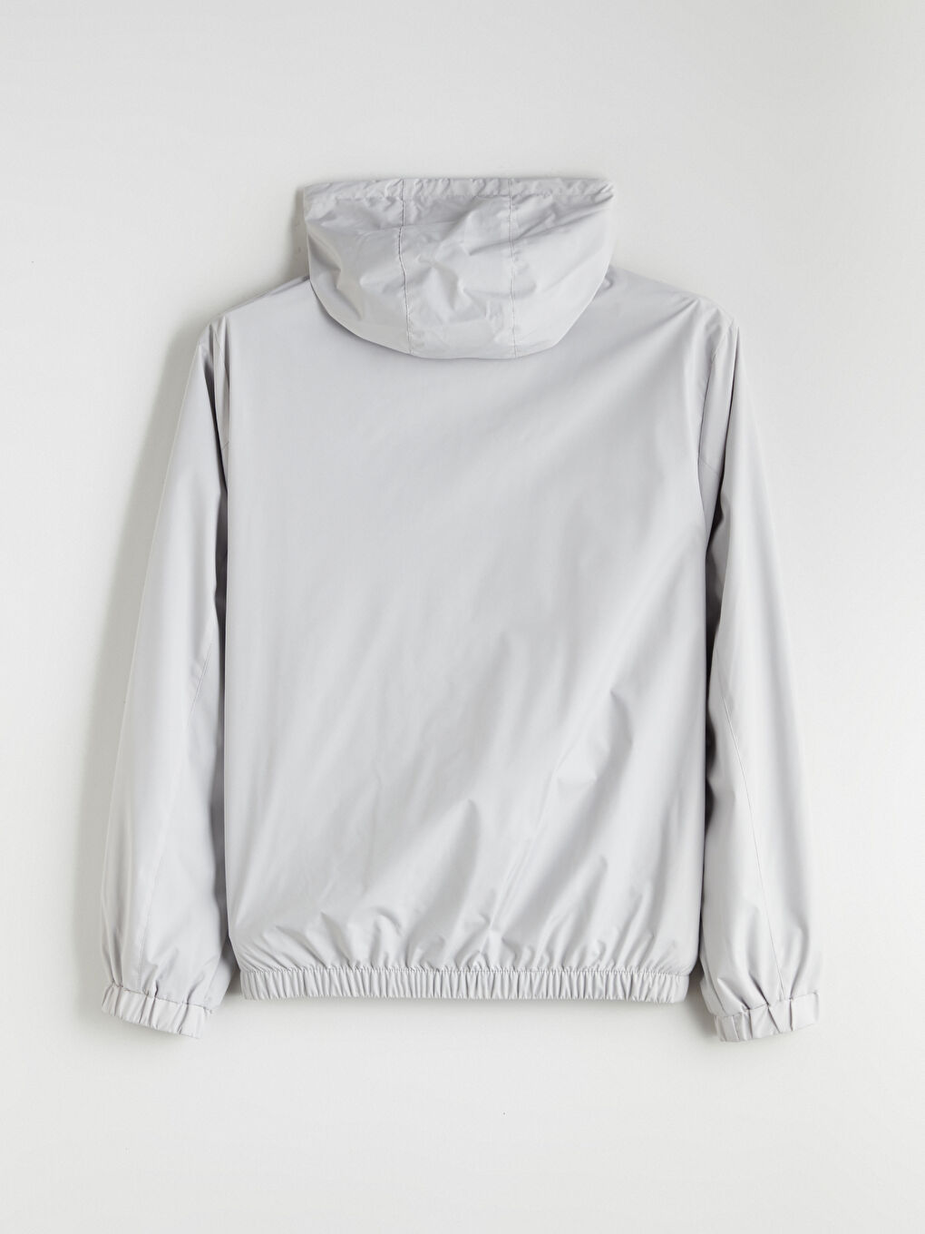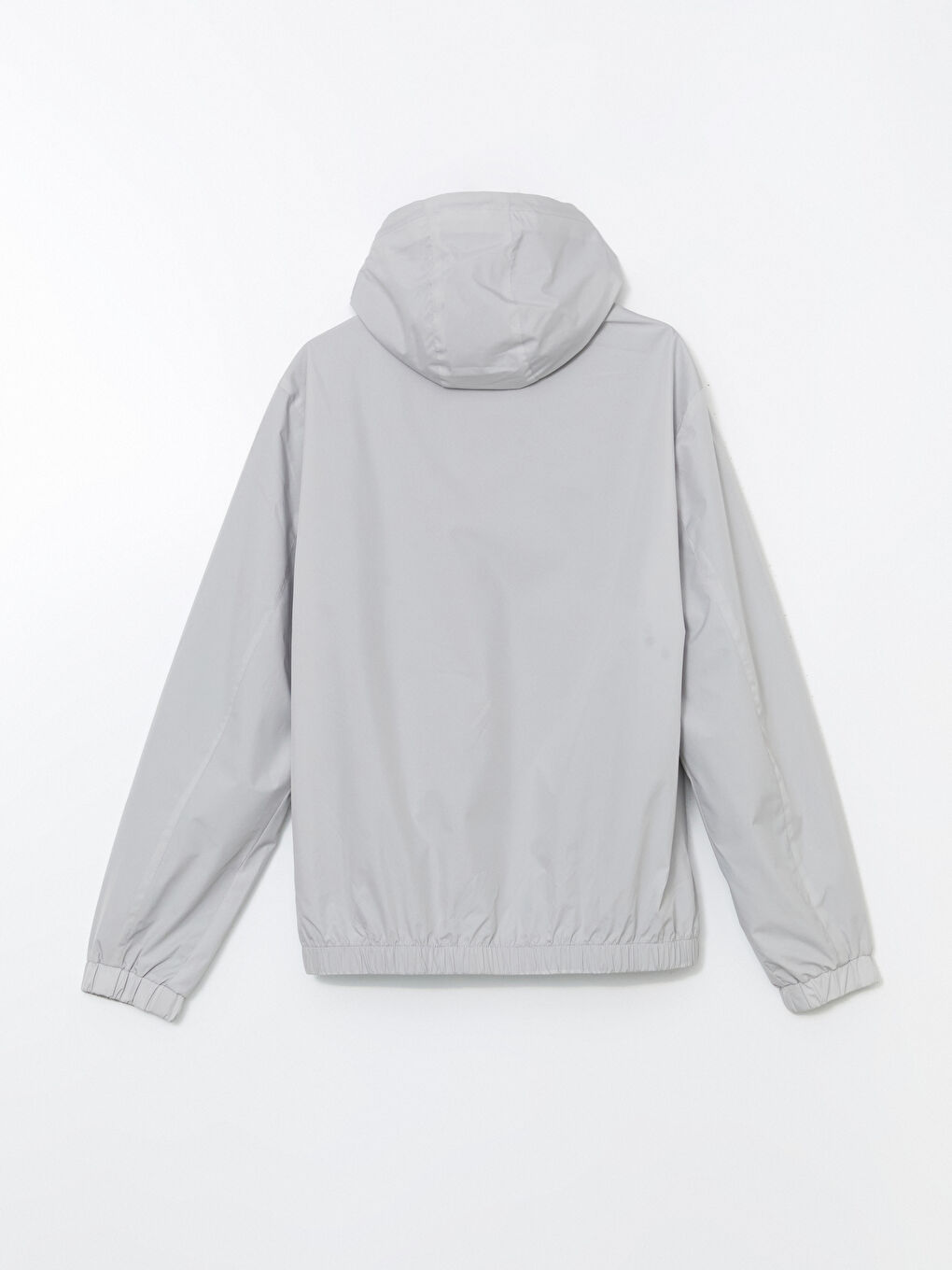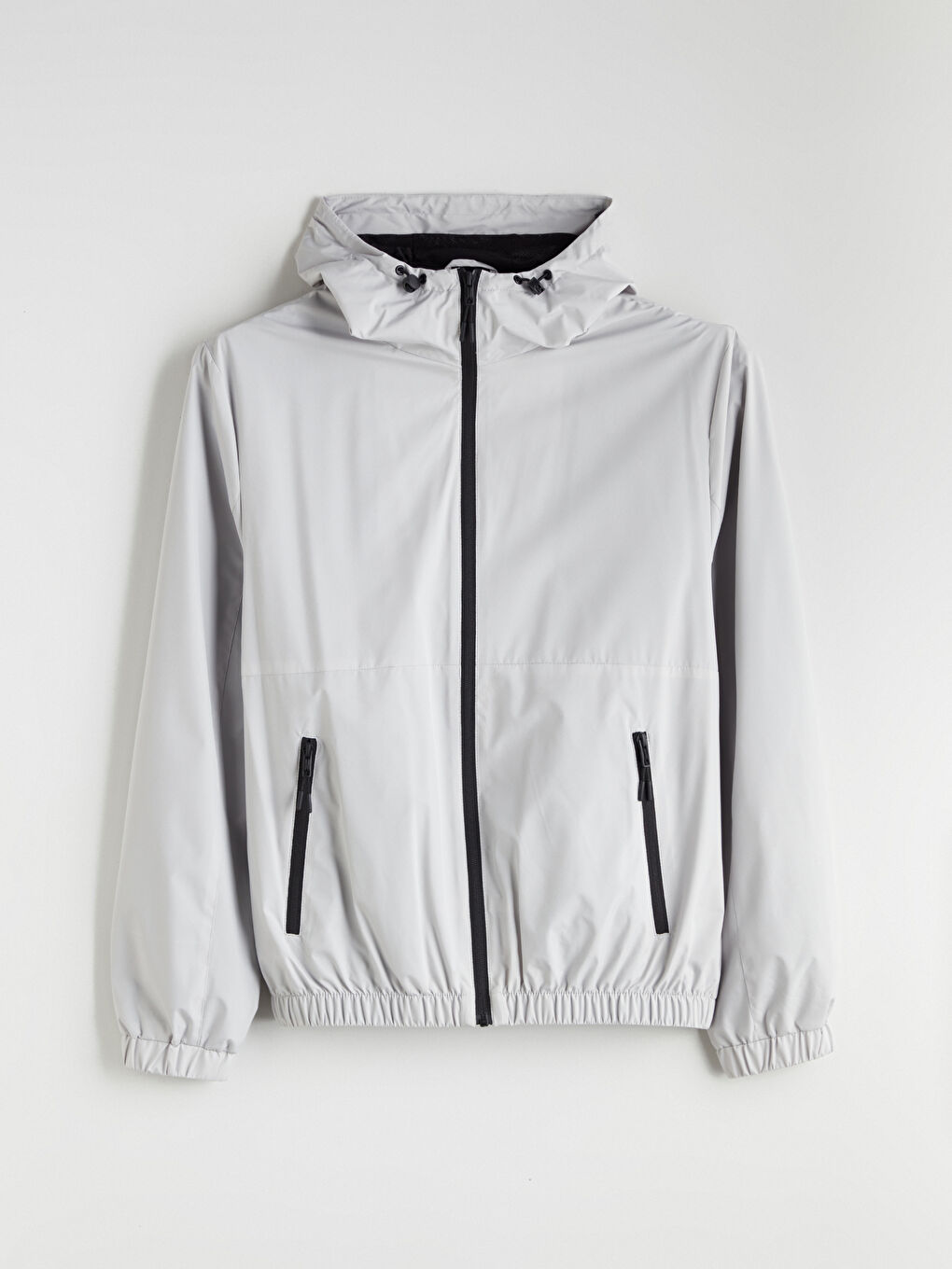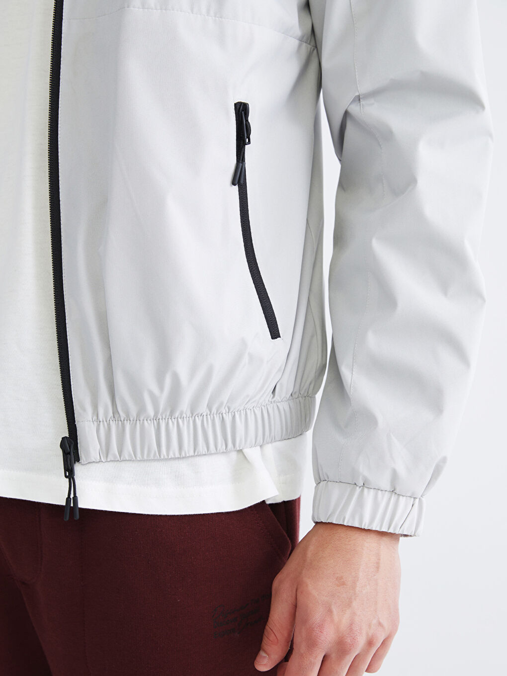 بارانی مردانه آستین بلند کلاه‌دار با زیپ جلو. جیب‌های کناری زیپ‌دار، کمر کشی و لبه‌ی لباس.