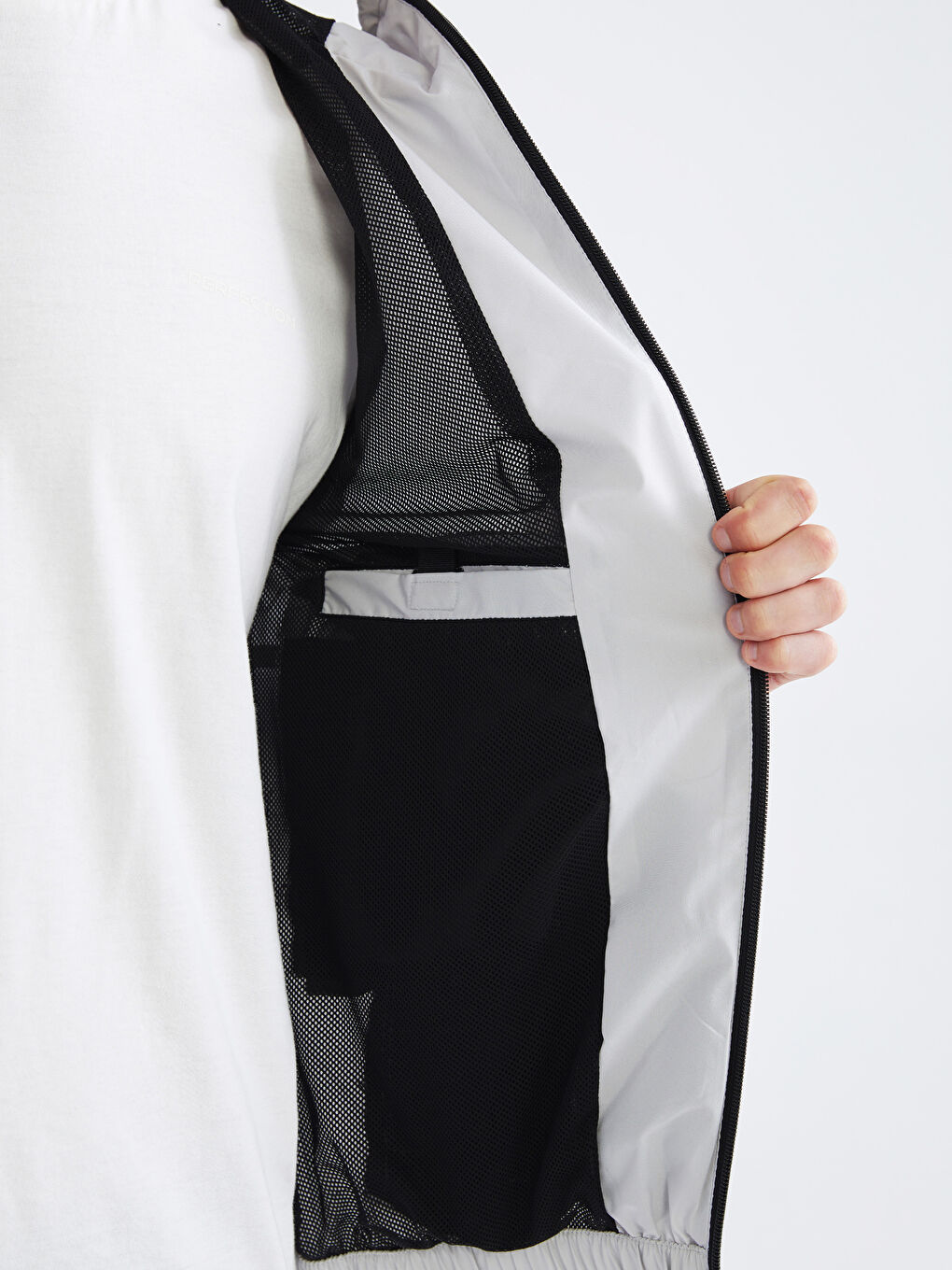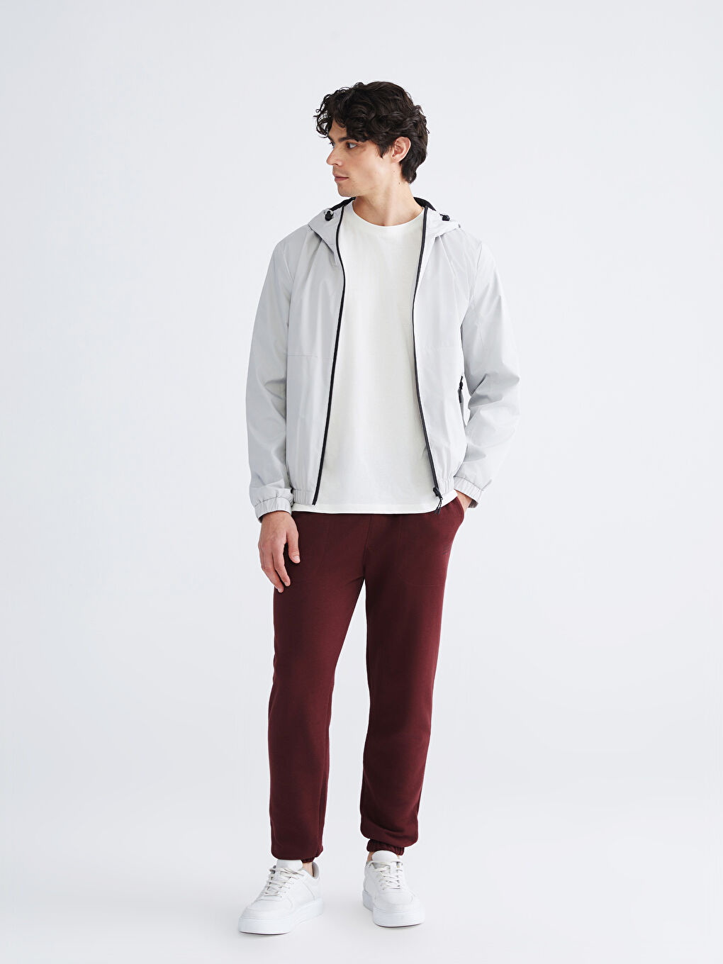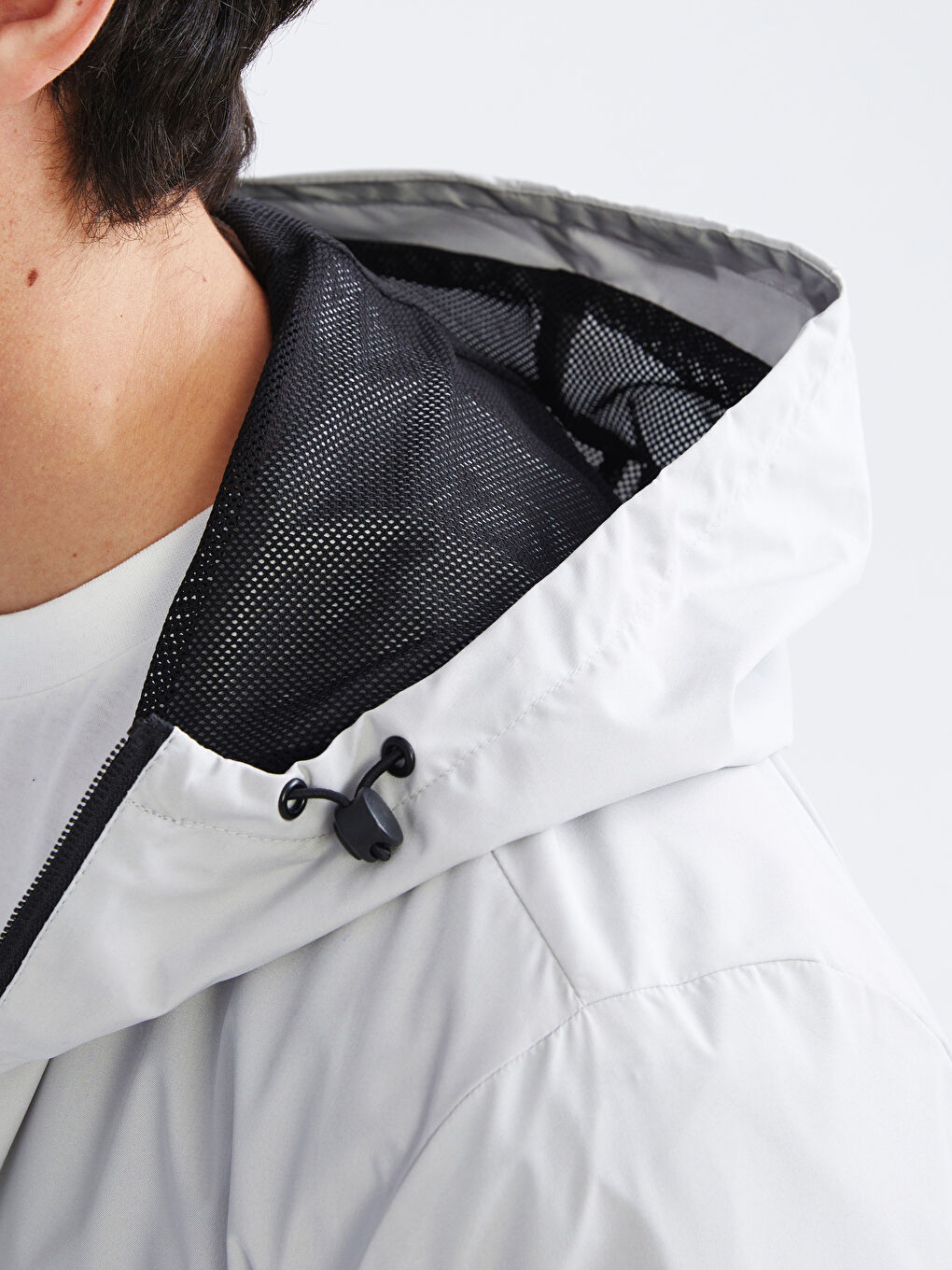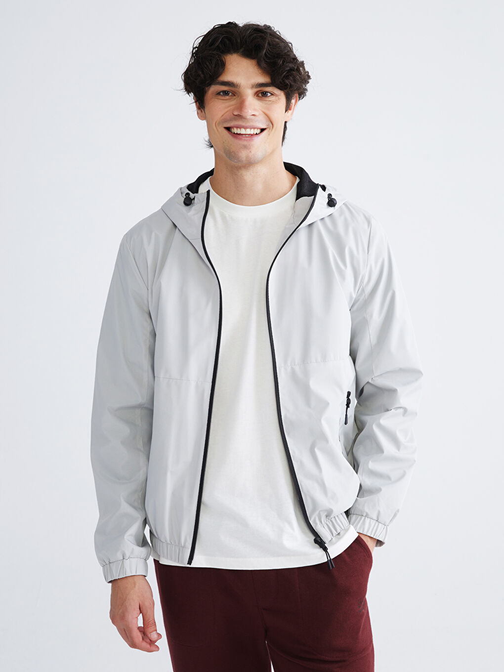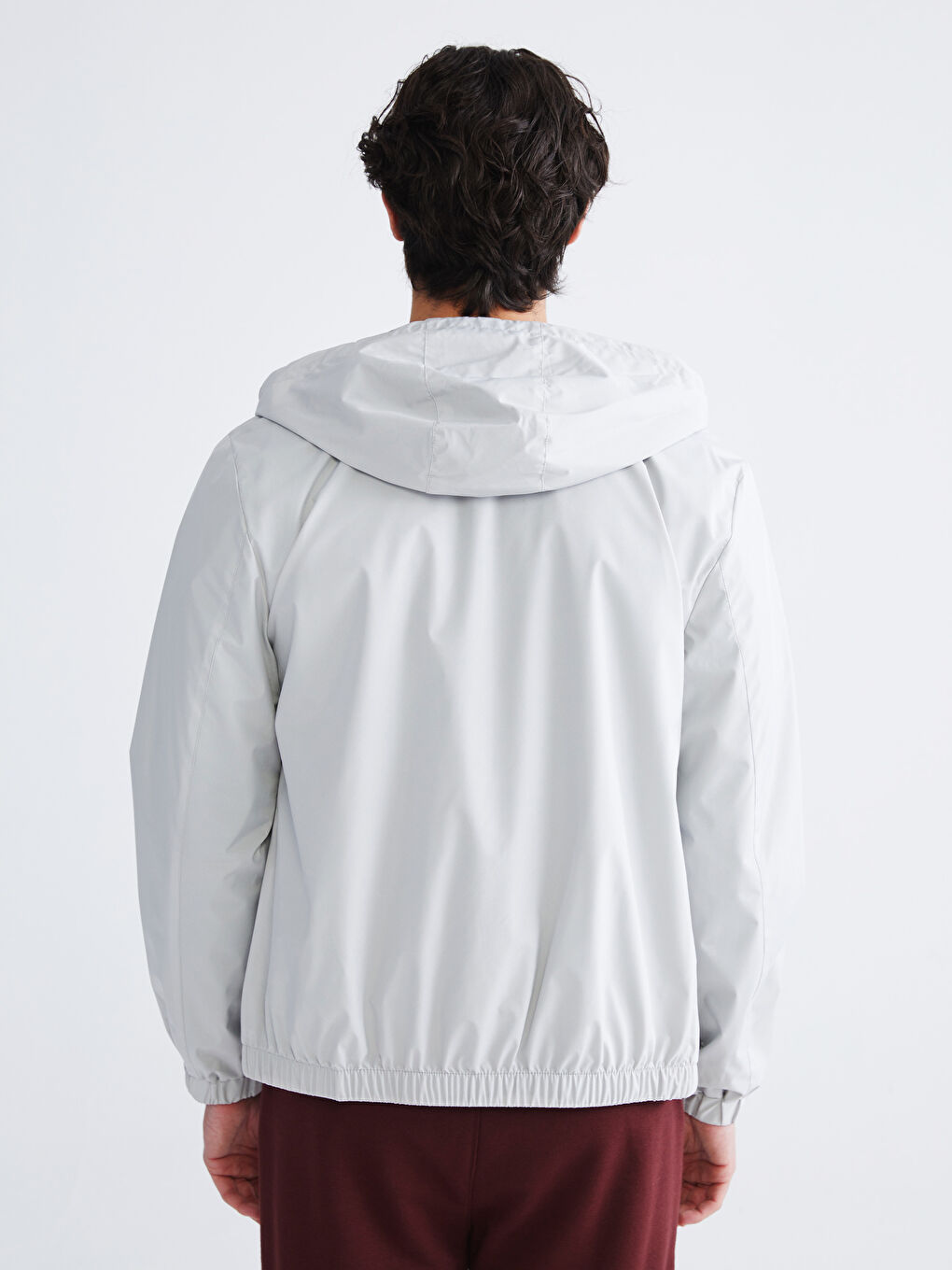 بارانی مردانه آستین بلند کلاه‌دار با زیپ جلو. جیب‌های کناری زیپ‌دار، کمر کشی و لبه‌ی لباس.