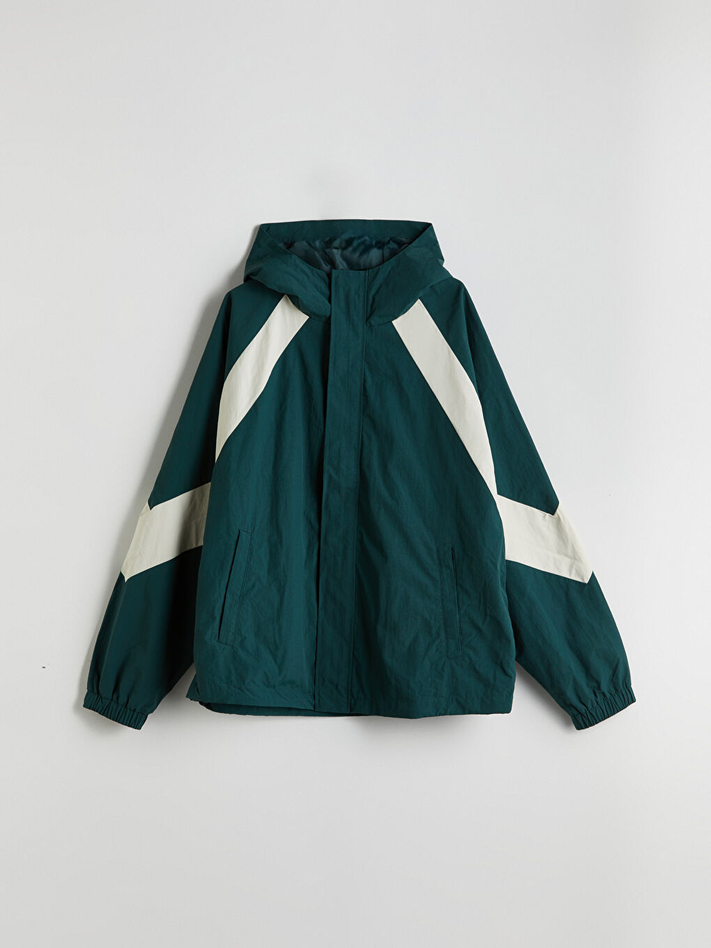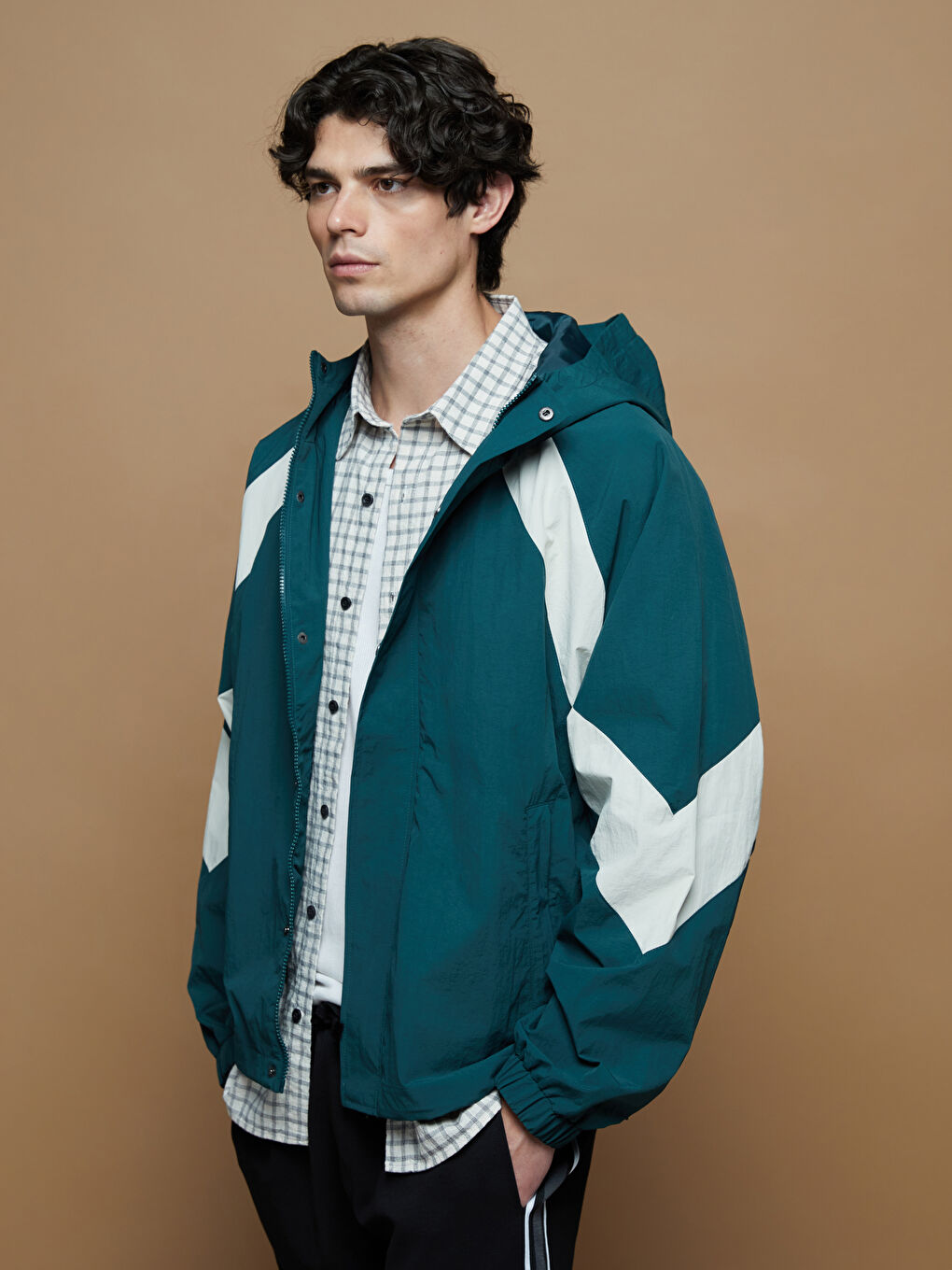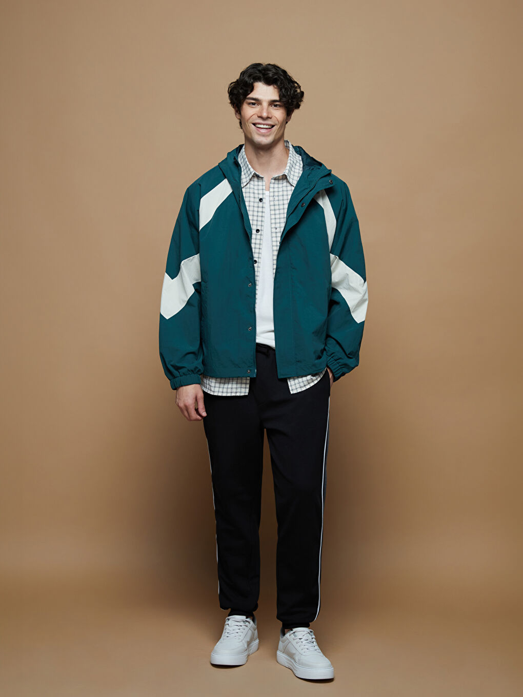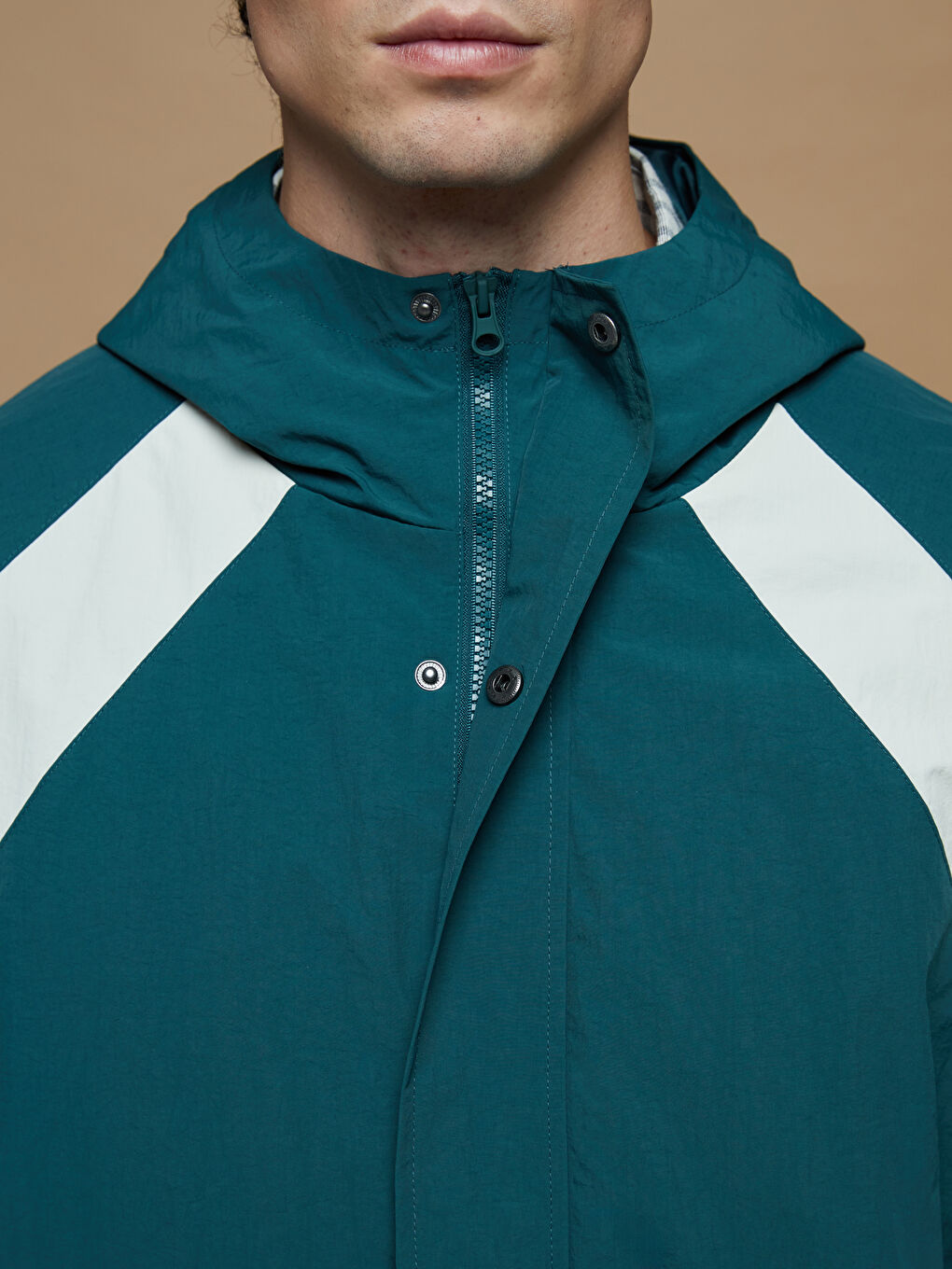 بارانی مردانهی کلاهدار و آستینبلند. طراحی رنگی. جلو زیپدار، سر آستینها کشسان و جیبهای کناری.