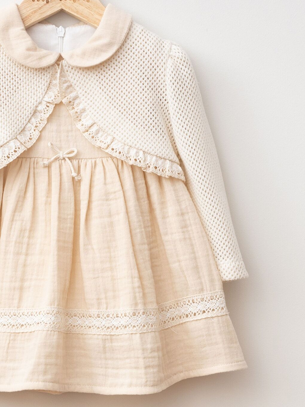لباس بژ دخترانه و ست 2 تیکه بولرو با جزئیات توری