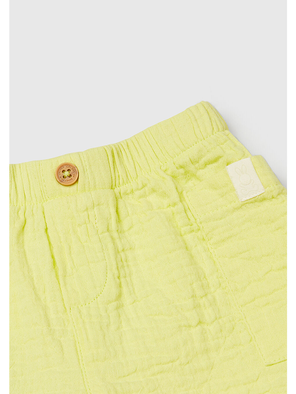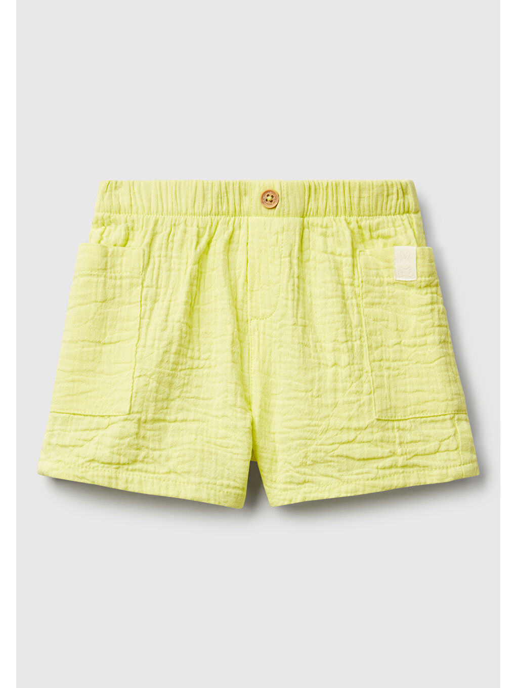 شلوارک بچه گانه زرد با کمربند الاستیک، جیب وصله و برچسب لوگو
