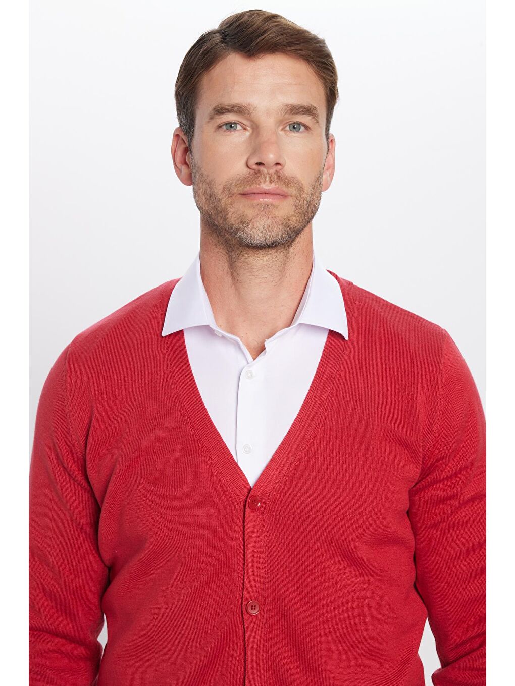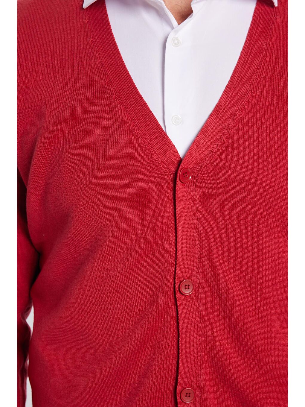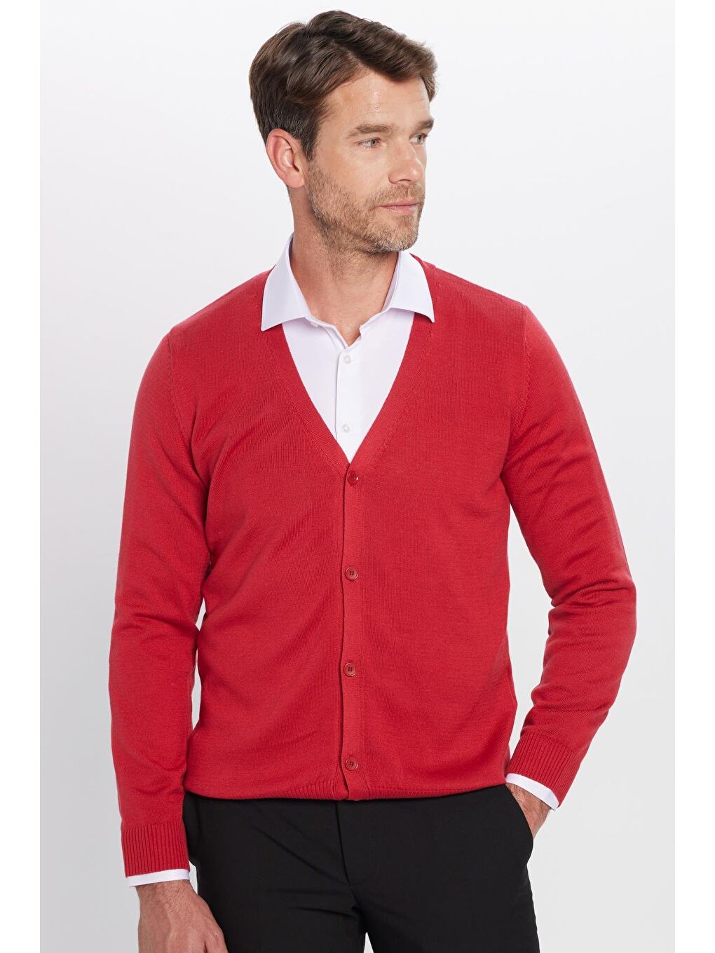 ژاکت کشباف مردانه طرح استاندارد، دکمهدار، نخی ساده، برش معمولی، قرمز
