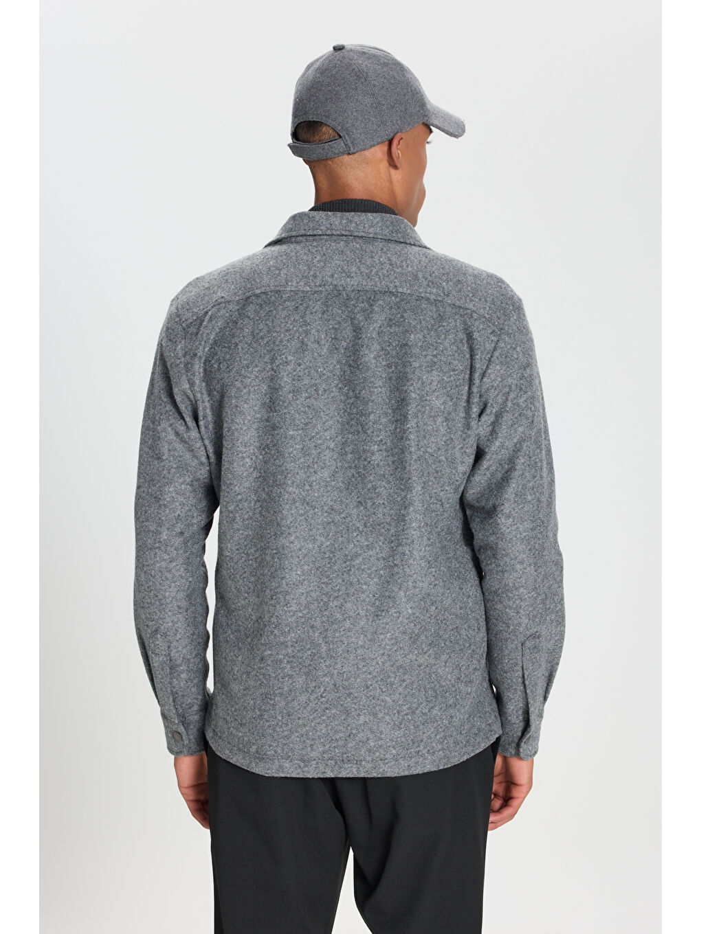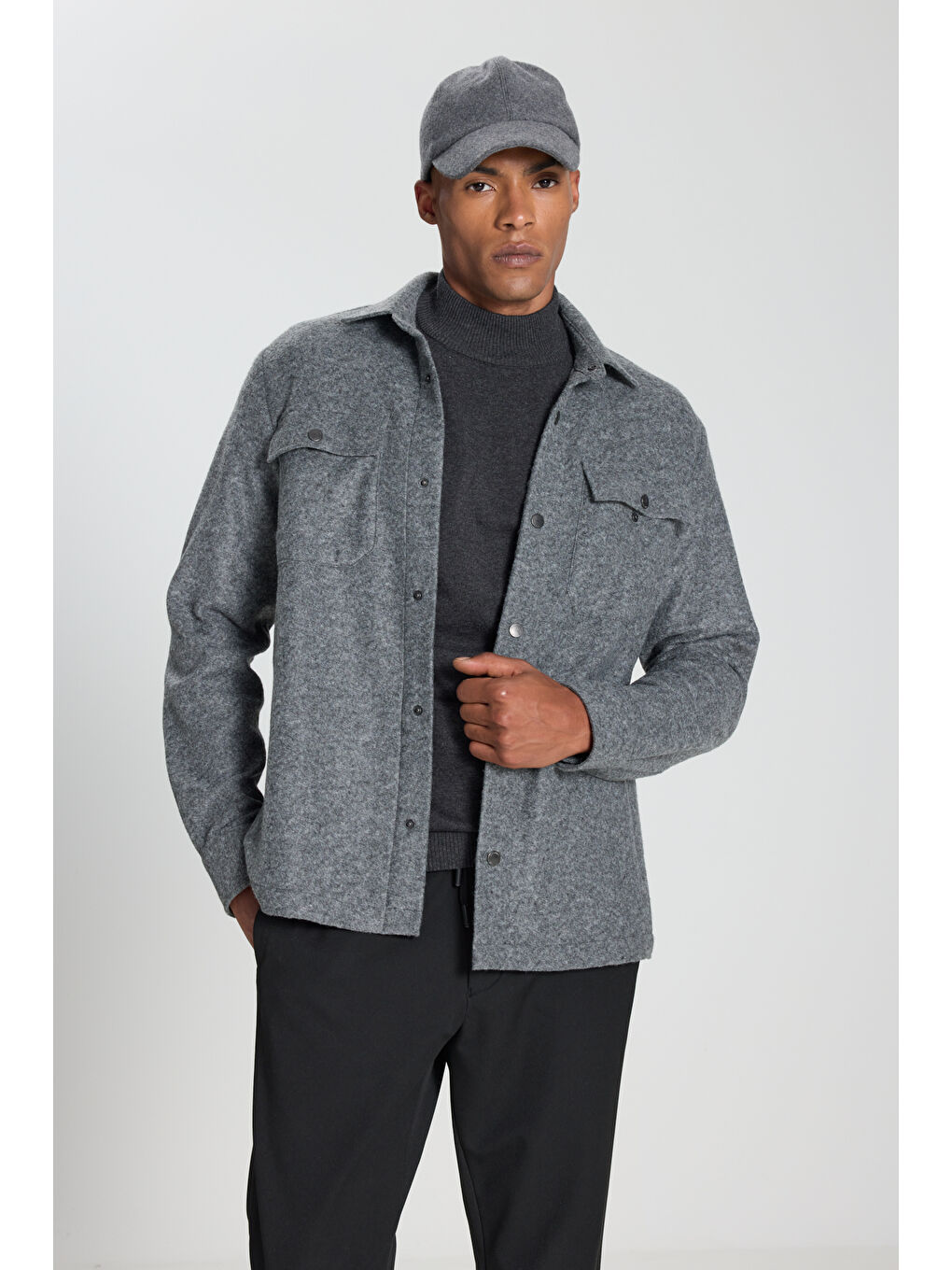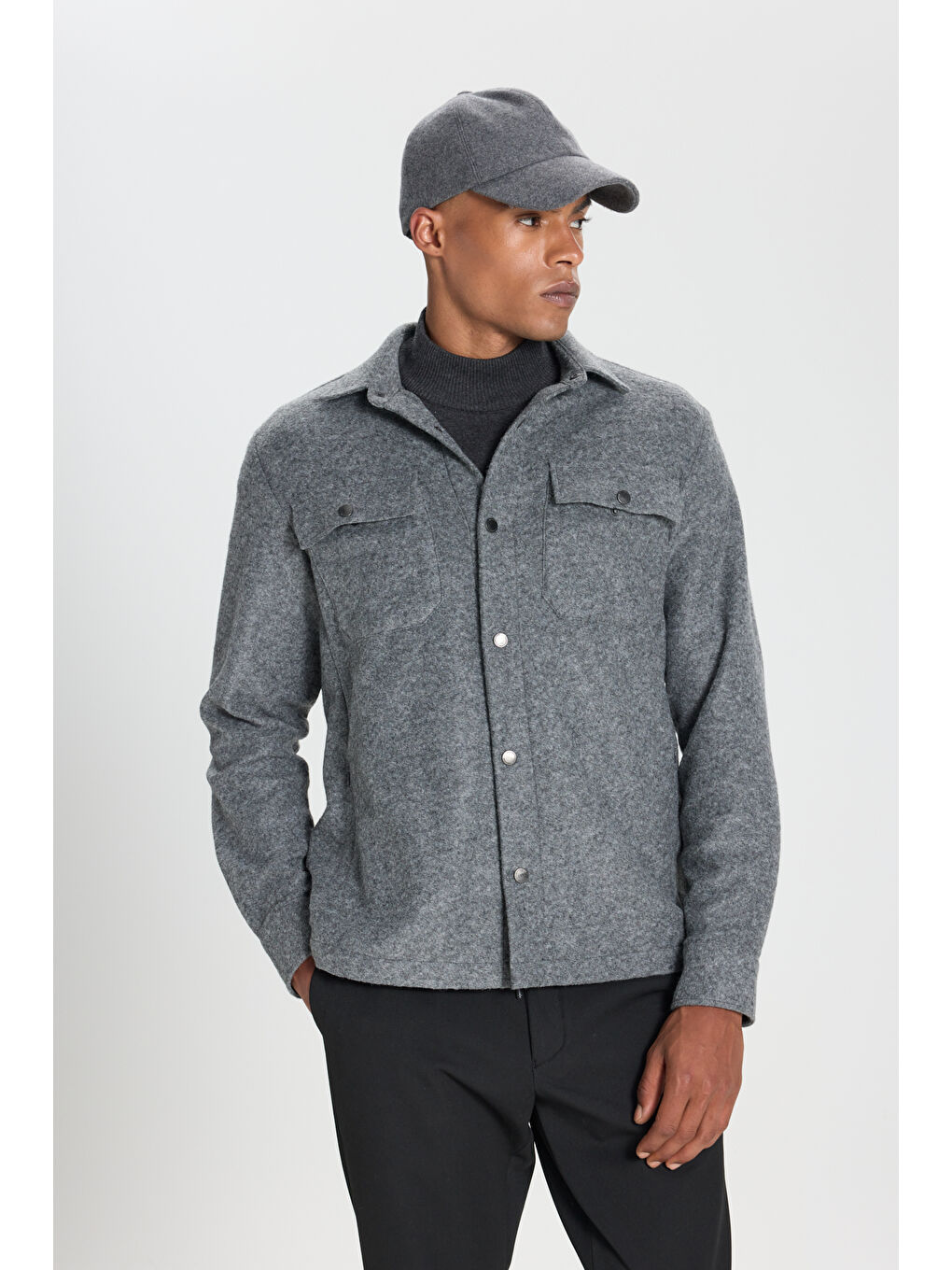 ژاکت پیراهن مردانه پشمی خاکستری گرم و راحت، یقه کلاسیک برش آرام