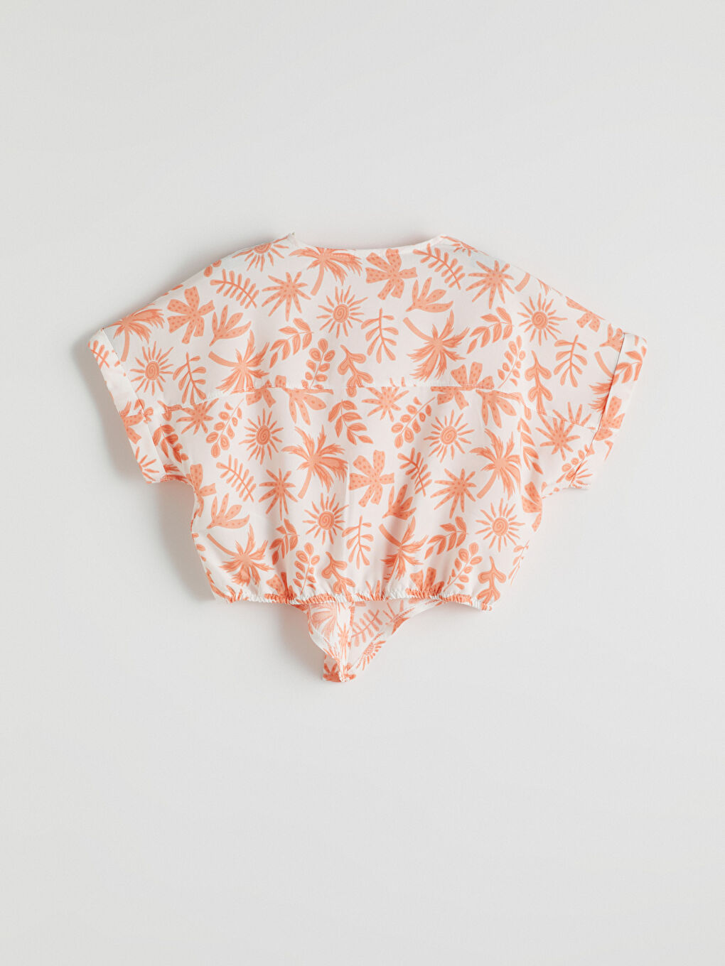 بلوز یقه ای طرح دار دخترانه. آستین های کوتاه با سرآستین های تاشو، بسته شدن دکمه در جلو، و جزئیات کراوات در لبه.