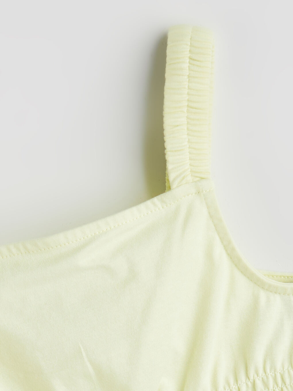 بلوز دخترانه یقه مربعی، بندهای ضخیم و کمر بسته از پارچه نخی صد در صد شانه شده تهیه شده است.