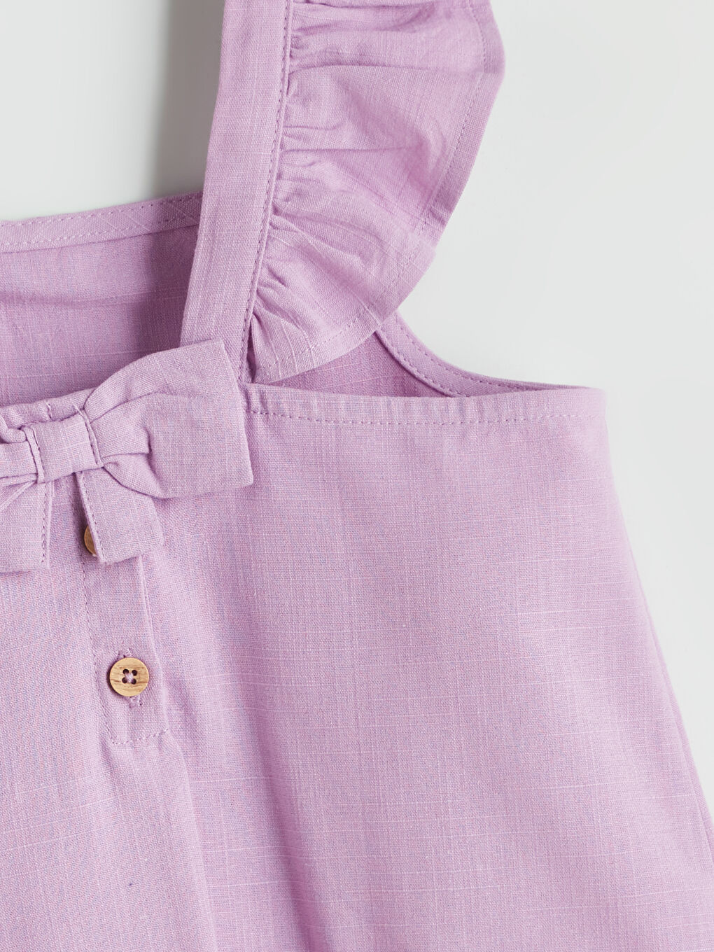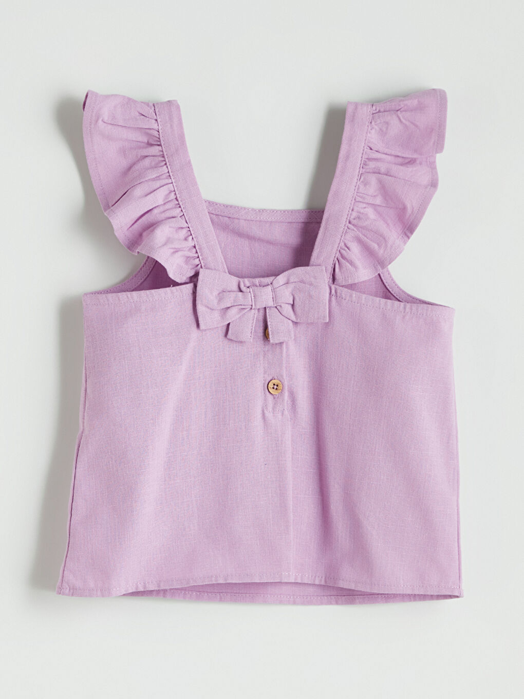 بلوز یقه مربعی دارای طرح رفل با جزئیات پاپیونی و بسته شدن دکمه در پشت است.