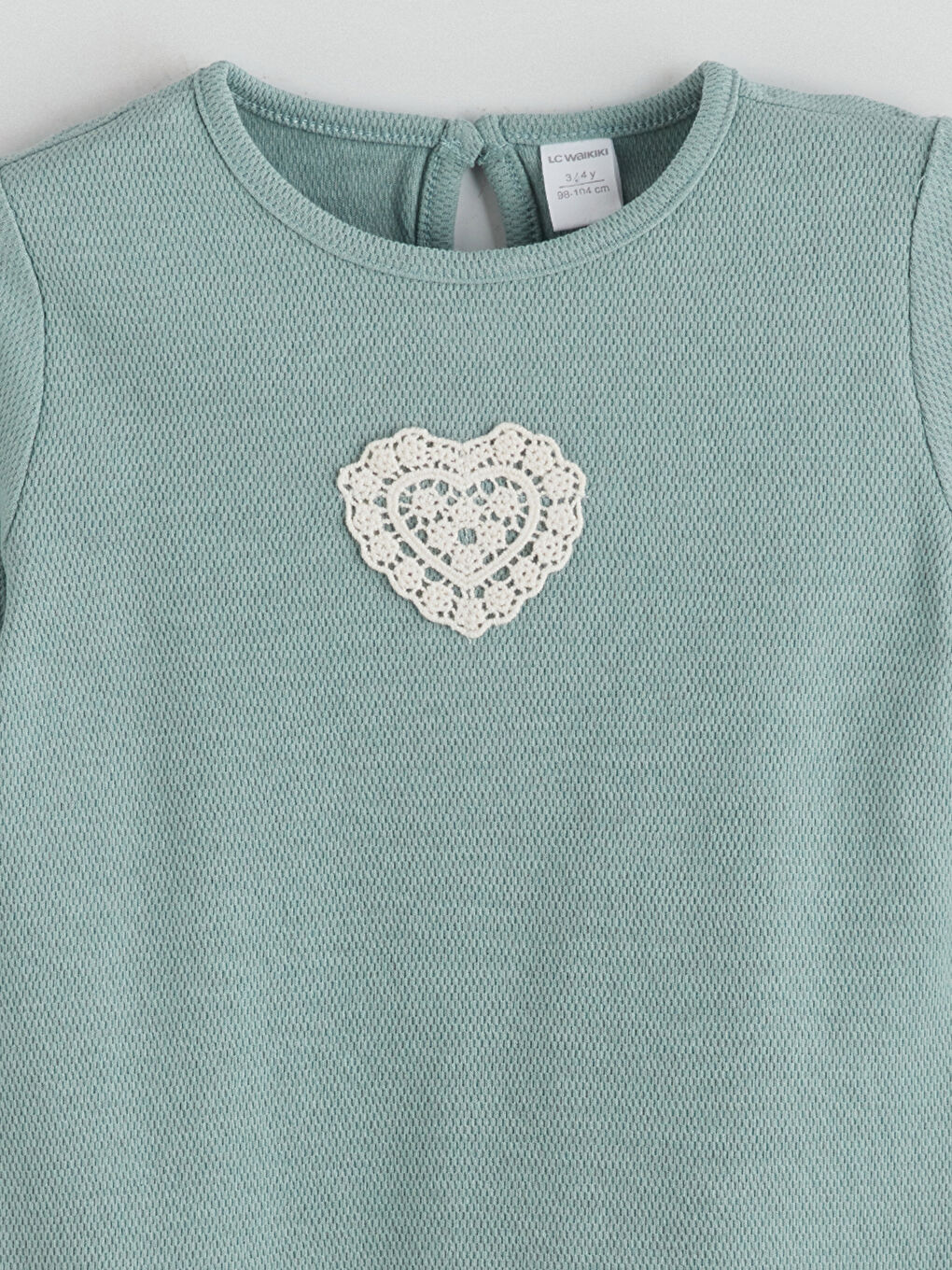 این بلوز دخترانه با گلدوزی قلب از پارچه پنبه ای ساخته شده است. دارای یک یقه کودک و بسته شدن دکمه ای در پشت گردن است.