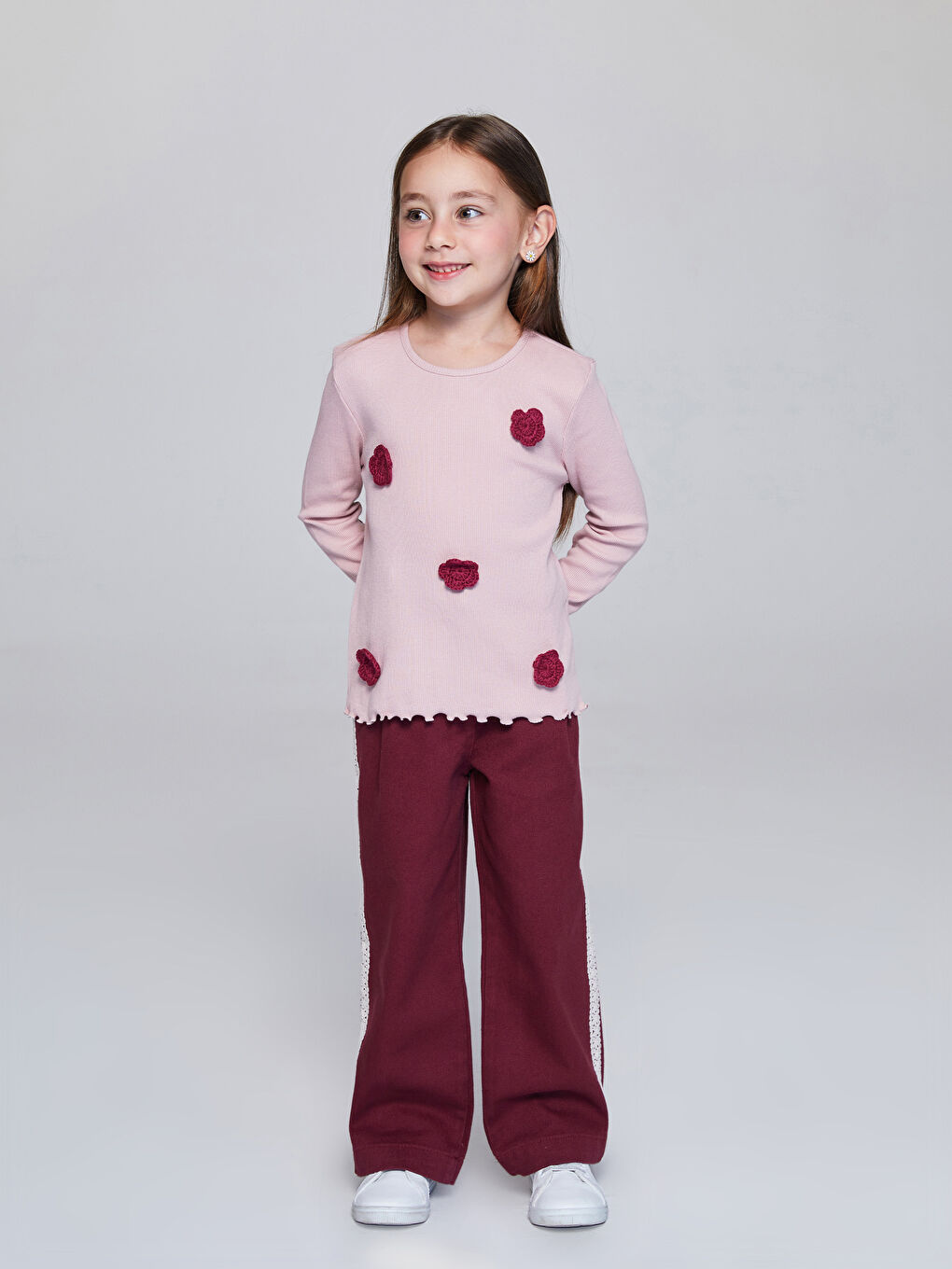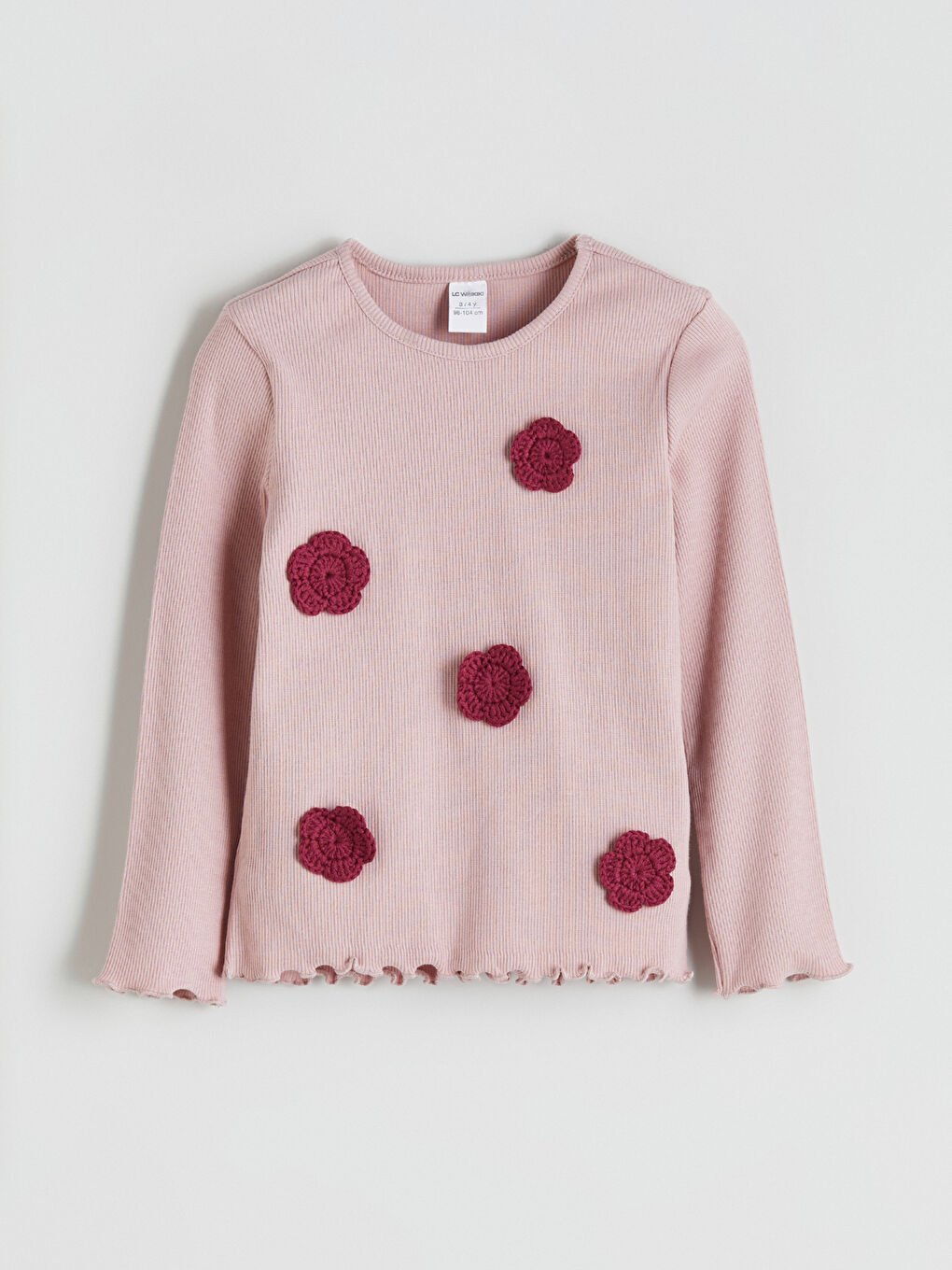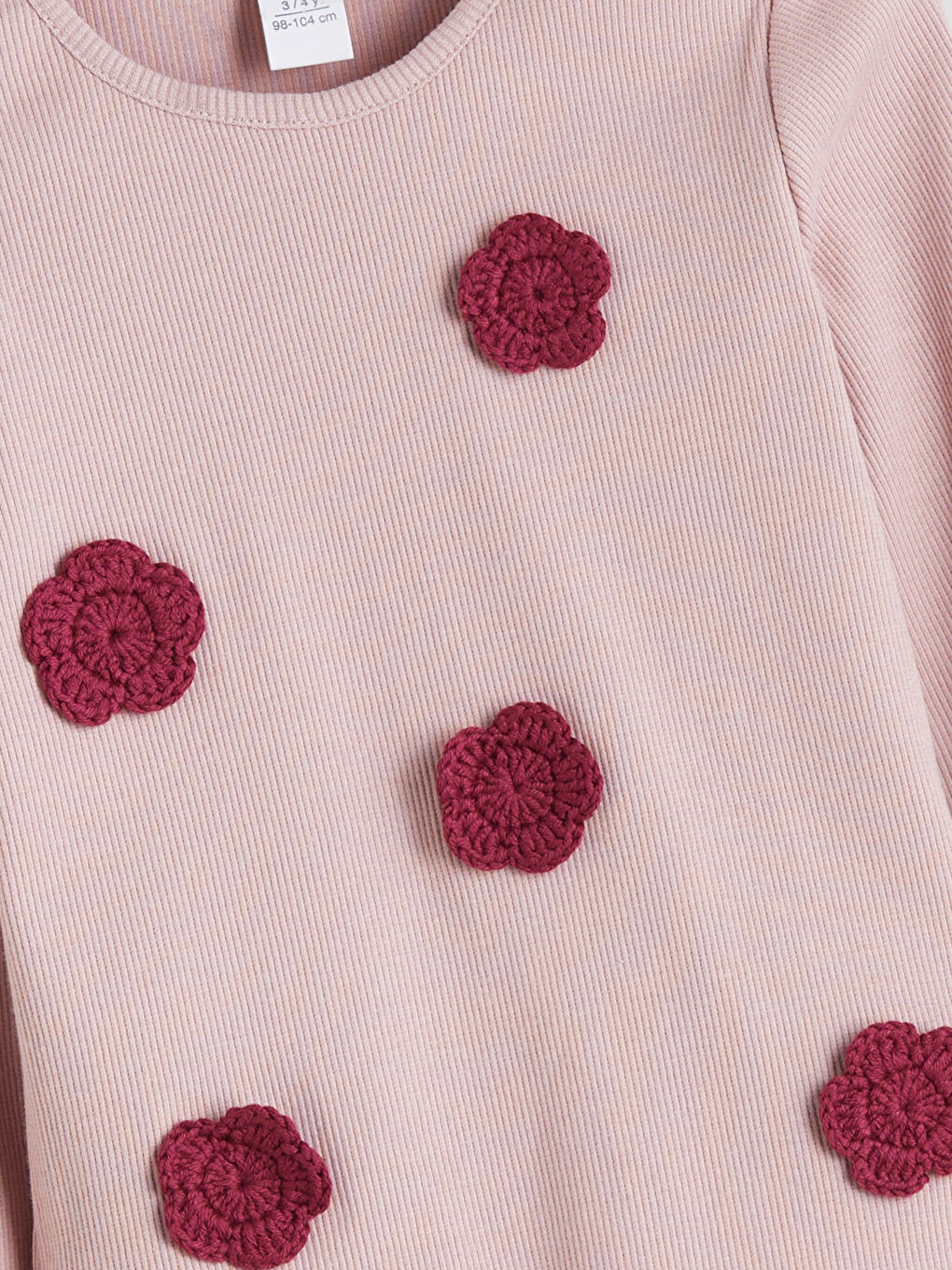 این تی شرت دخترانه باریک دارای یقه خدمه و آستین بلند است. پارچه جلیقه دارای طرح های گلدار بافتنی در جلو است.