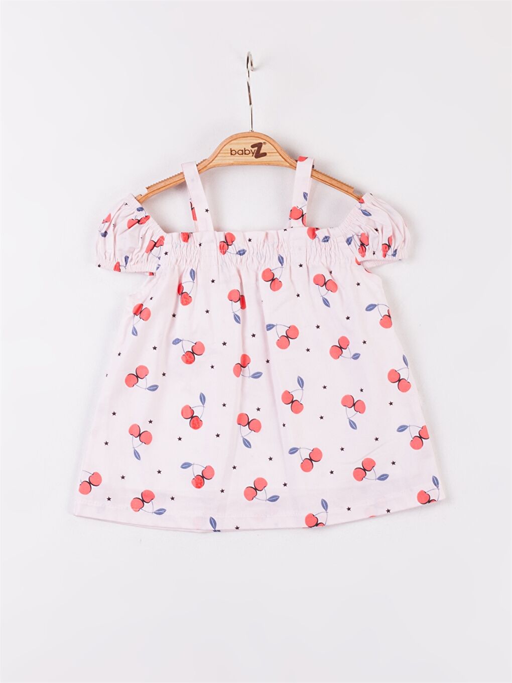 بلوز دخترانه طرح دار گیلاسی و ستاره ای، پارچه پوپلین، سرشانه، بند، یقه سرآستین و آستین کوتاه.