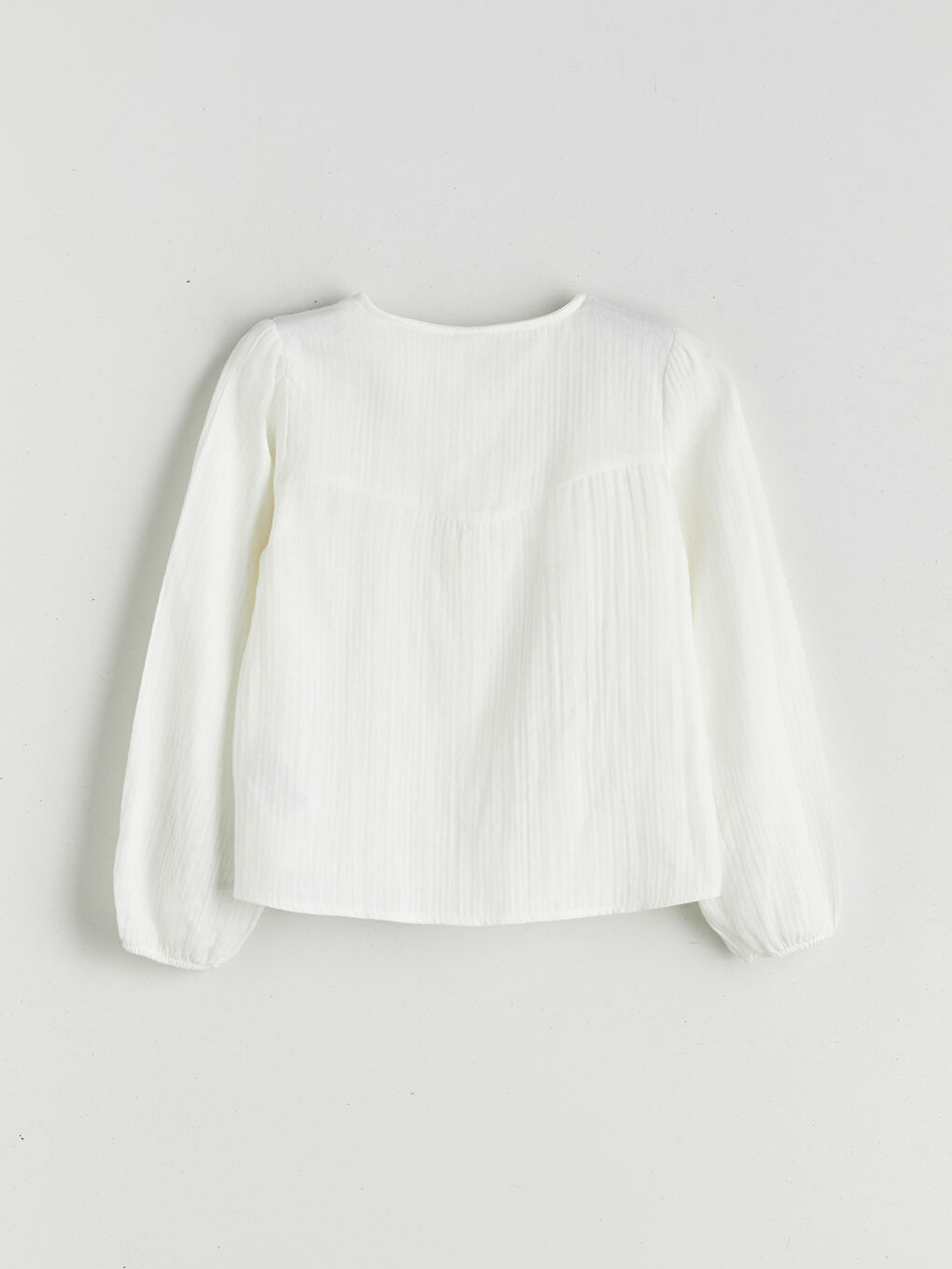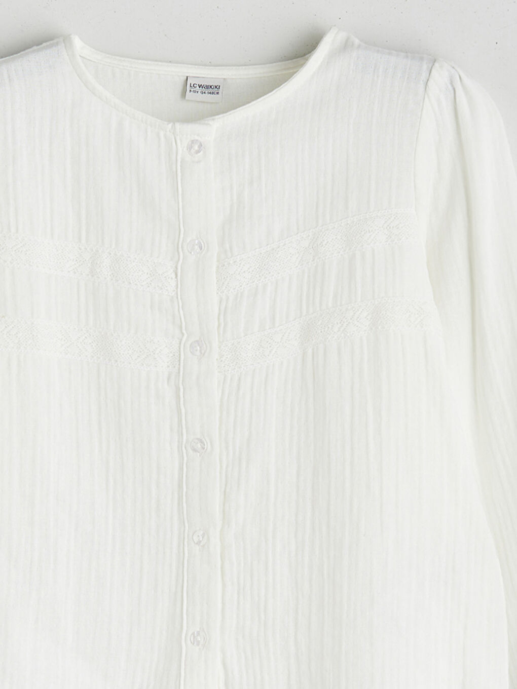 این پیراهن دخترانه از پارچه موسلین با جزئیات توری ساخته شده است. دارای یقه دکمه دار و آستین های بلند است.
