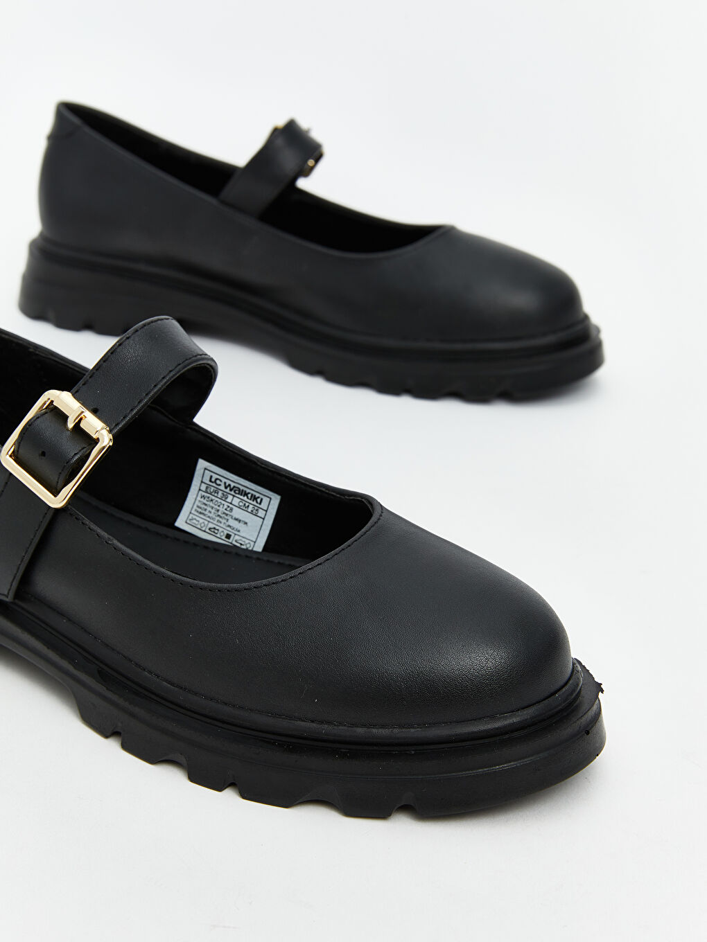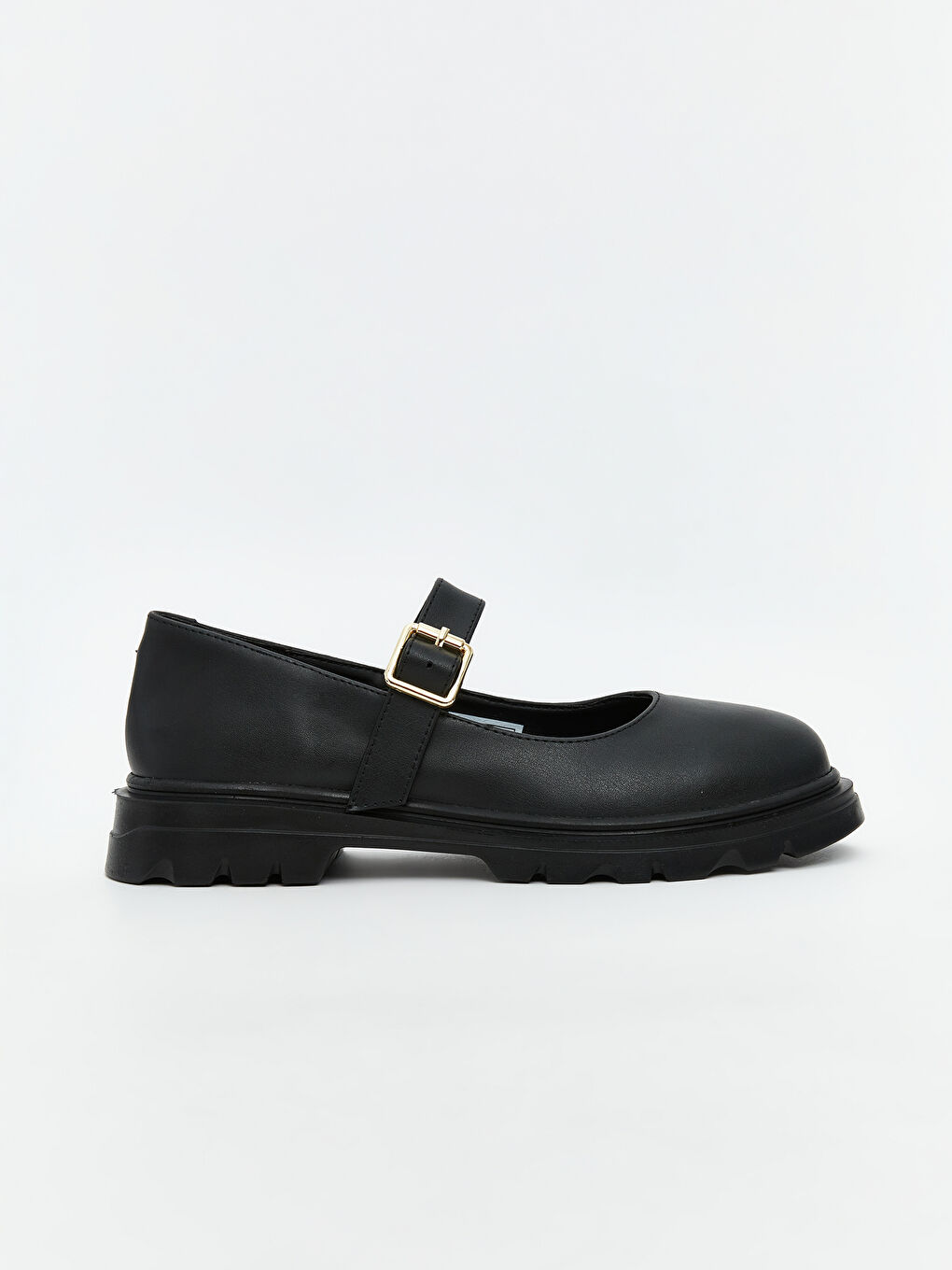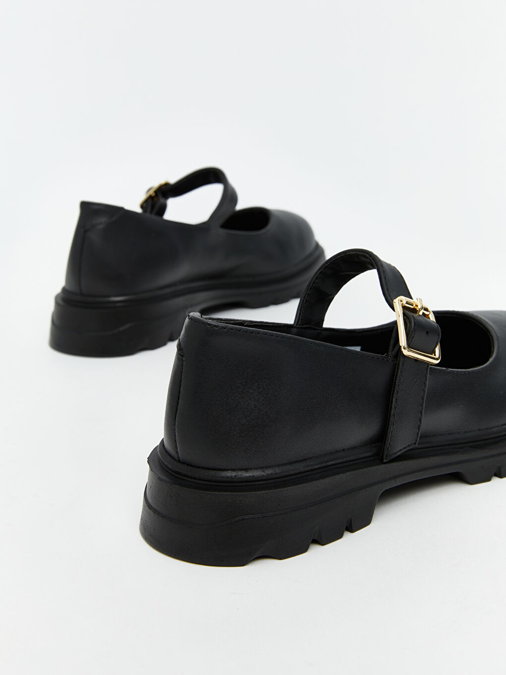 کفشهای کلاسیک زنانه با روکش براق، پنجه گرد، بند سگکدار در بالا و کفی ضخیم و دندانهدار.
