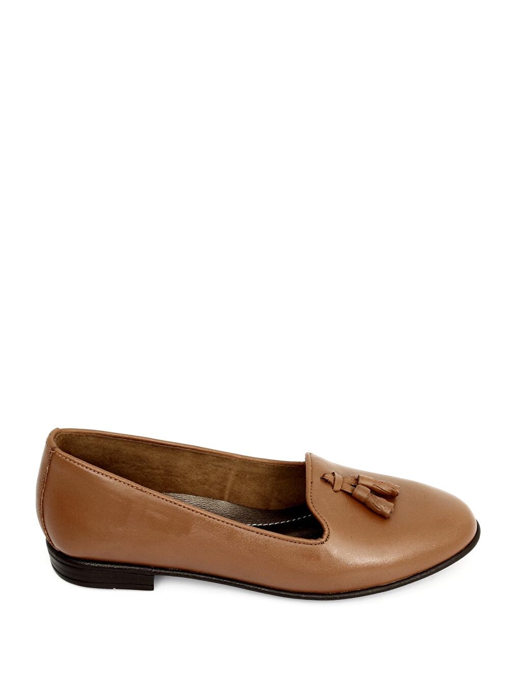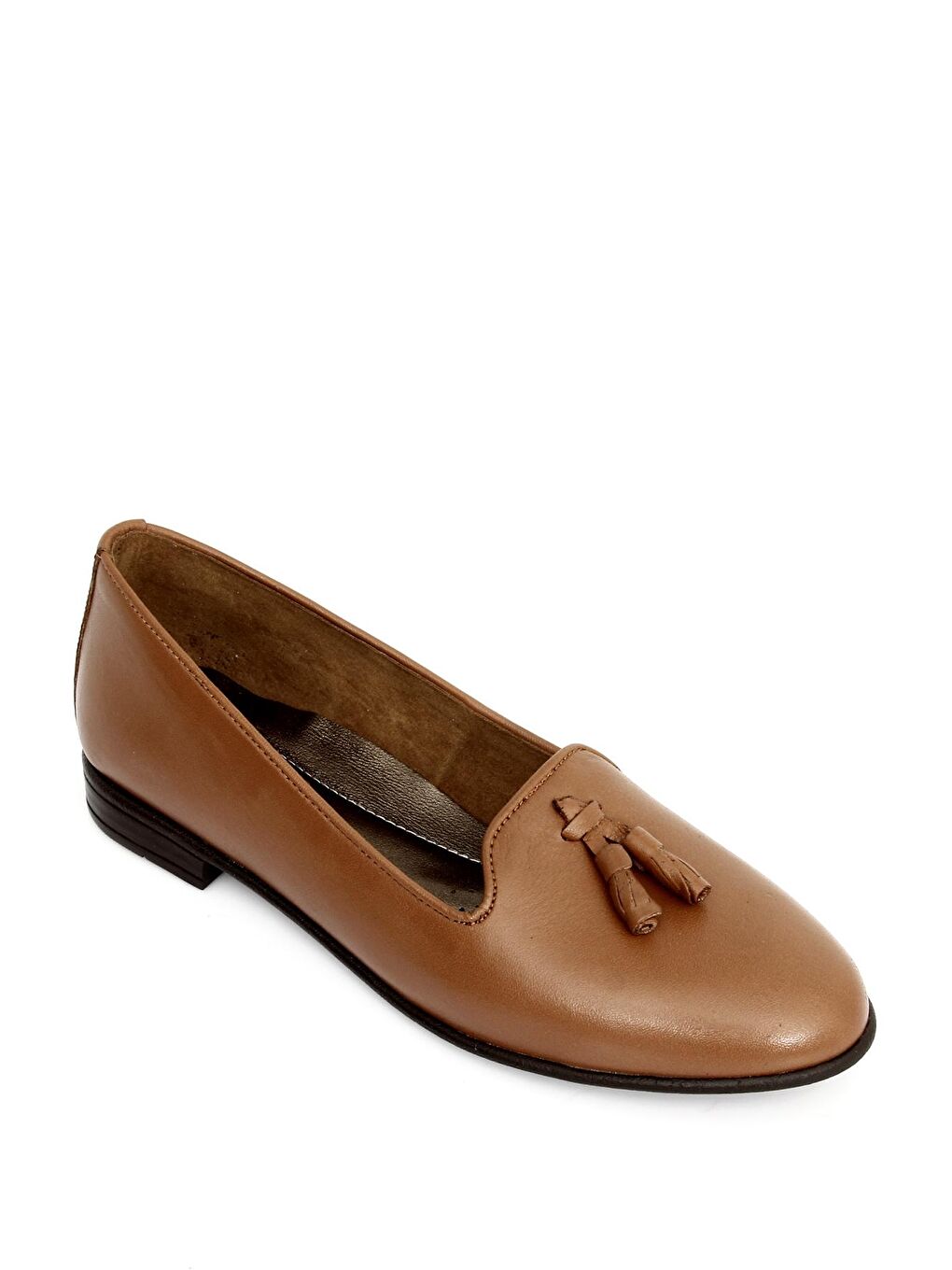 کفشهای بالرین زنانه قهوهای چرم اصل، نوک گرد، کف تخت، منگولهدار، کد ۲۴۱۶۰