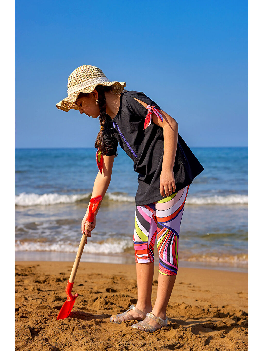 UPF50 + محافظت تا 98% از UVA / UVB 100 خورشید توسط پارچه دارای گواهی Oeko-Tex®. پارچه الاستین: 78٪ پلی آمید PA، 22٪ الاستین LYCRA® (لگینگ). پارچه بافته شده انعطاف پذیر: 90% پلی استر، 10% الاستین (تونیک). محتویات بسته بندی: تونیک و شلوار – 2 عدد قد: 55 سانتی متر عرض بین سایزها +3 سانتی متر، قد +6 سانتی متر با افزایش سایز: 6 اندازه: سن 6 سال، قد 123 سانتی متر، وزن 22 کیلوگرم.