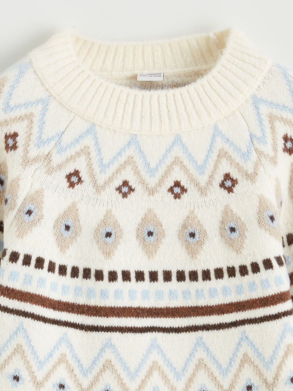 یک پلیور دخترانه یقه گرد، آستین بلند با طرح هندسی روی سینه و بازوها. یقه، سرآستینها و لبهی لباس کشباف است.