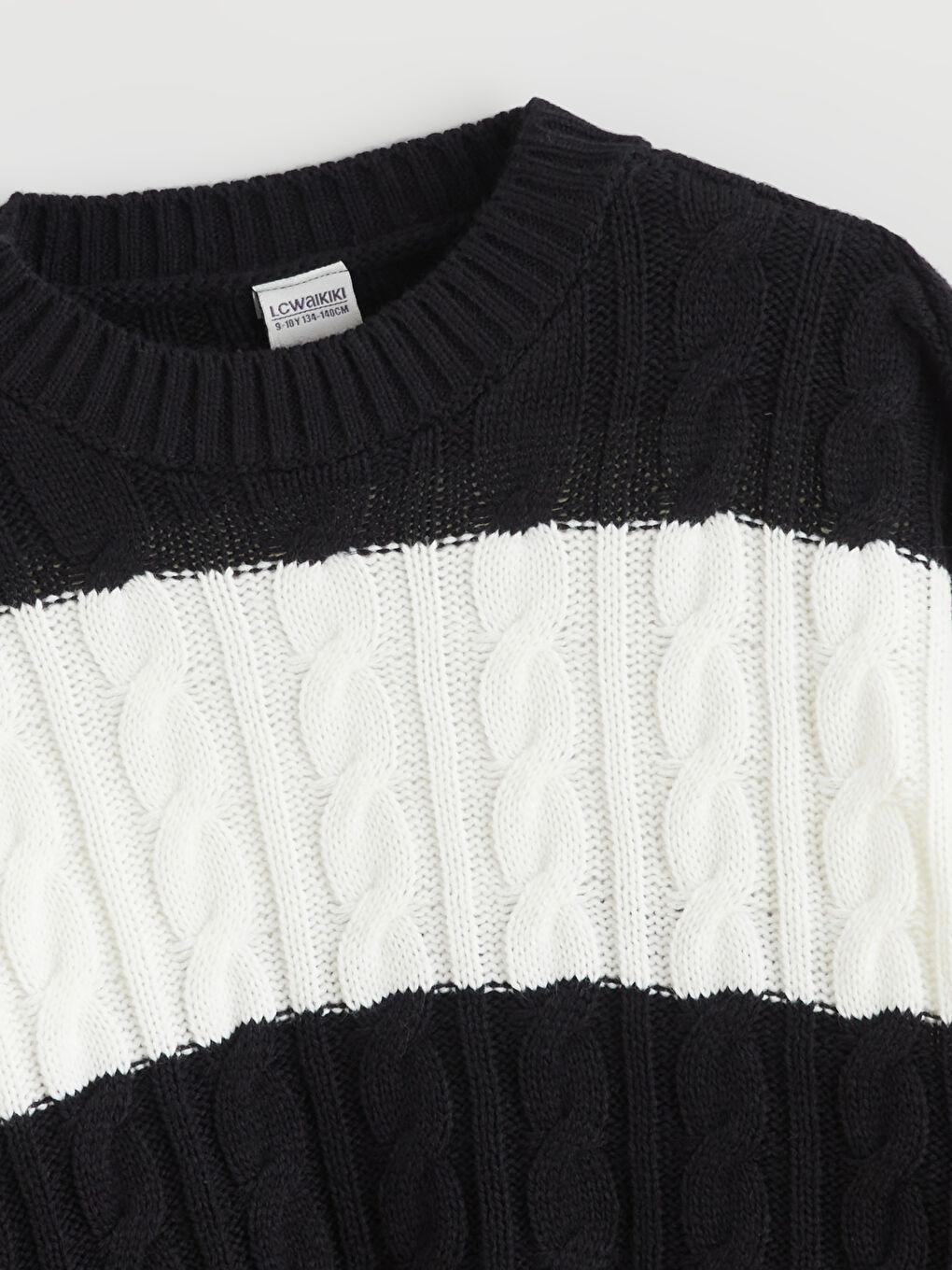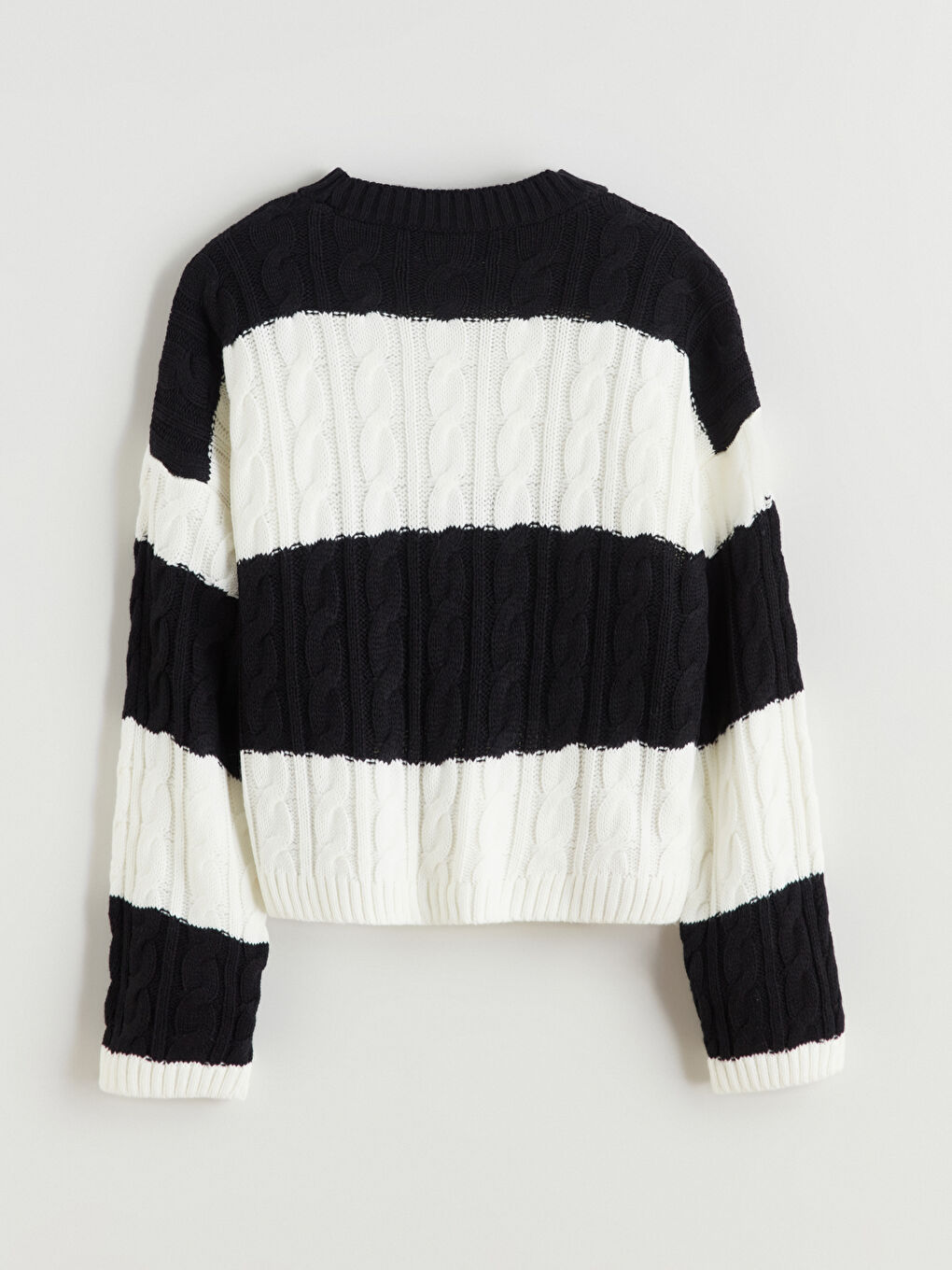 این پلیور دخترانه آستین بلند و یقه خدمه از پارچه کشباف و راه راه ساخته شده است. سرآستین و سجاف آجدار است.