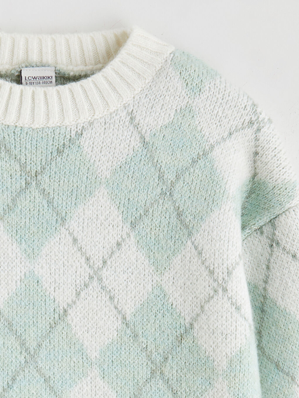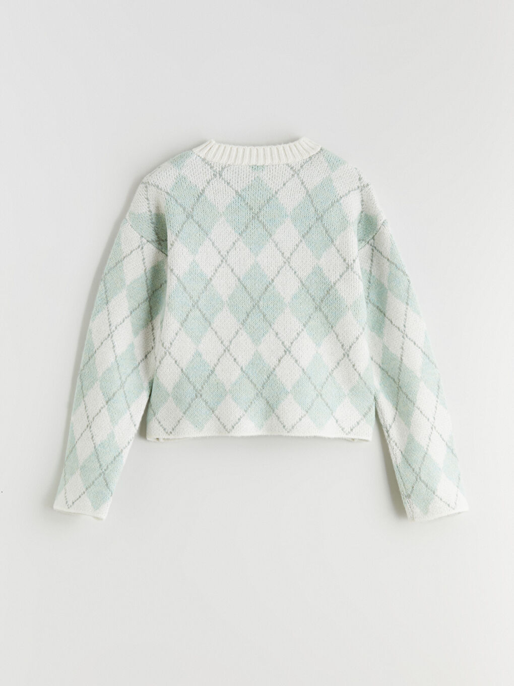 ژاکت بافتنی دخترانه دارای یقه خدمه و آستین بلند است. دارای طرح الماس است.
