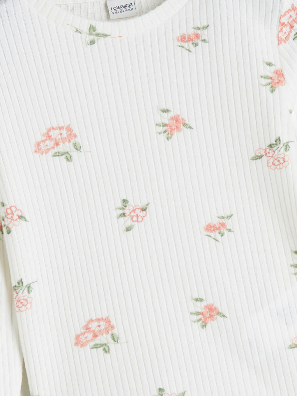 تی شرت دخترانه باریک، یقه خدمه و آستین بلند از پارچه مجلسی طرح دار گلدار ساخته شده است.