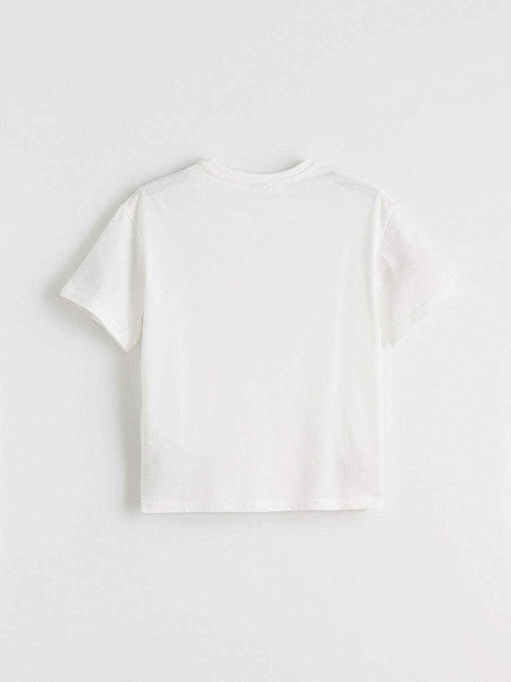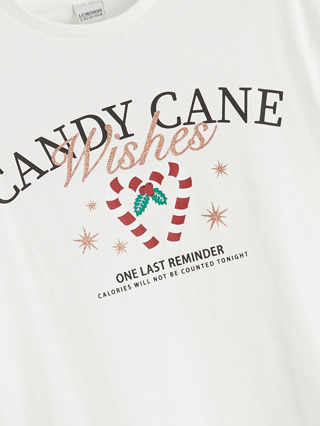 این تیشرت دخترانه یقه گرد از پارچه نخی دوخته شده است. آستین کوتاه و طرح چاپی دارد.